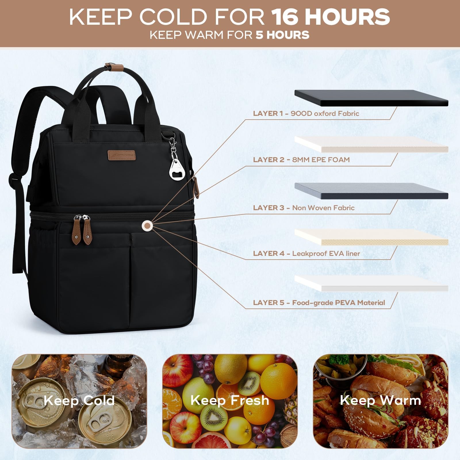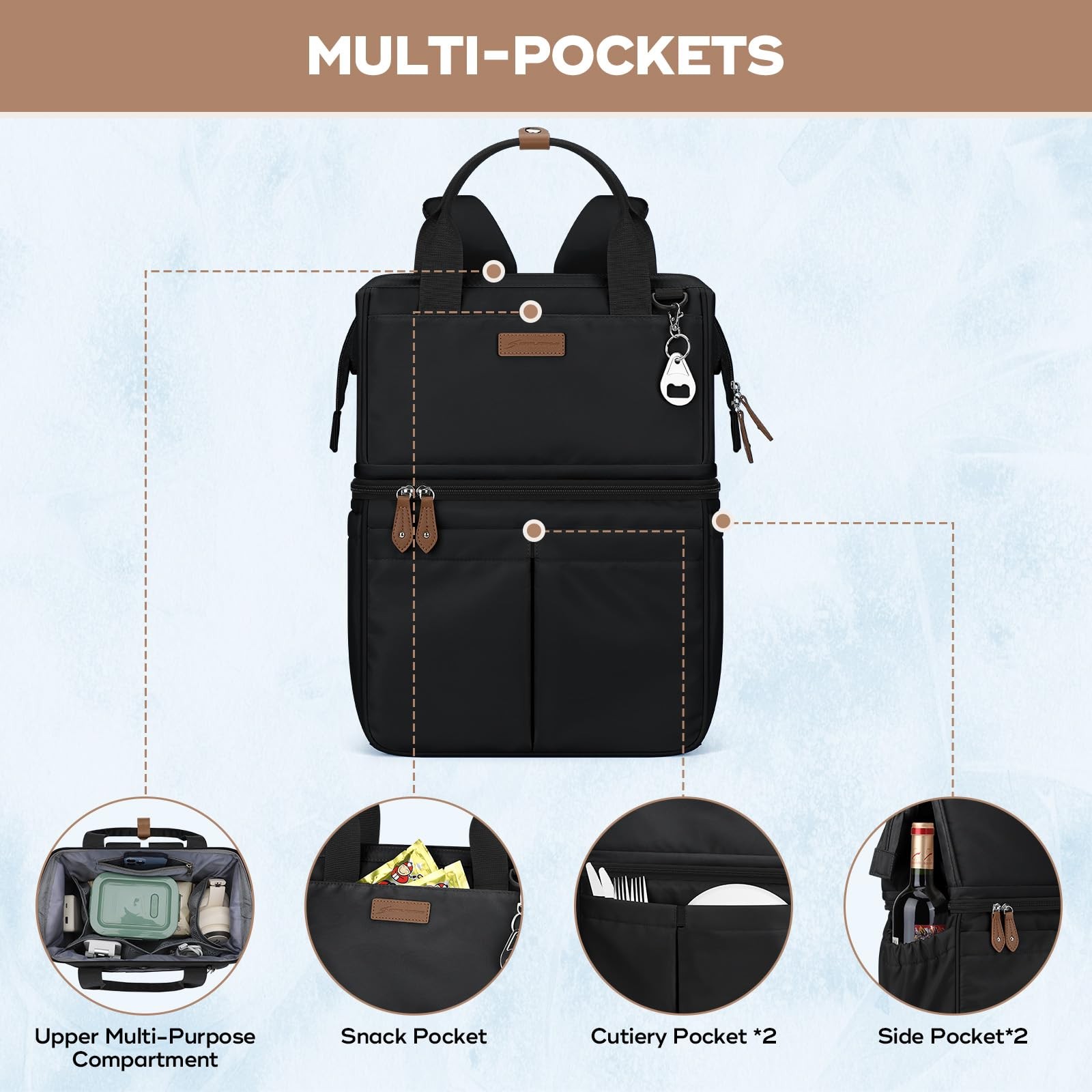 Hot & Cold Separation Design: The double-layer cooler backpack is uniquely designed with an upper compartment for dry storage and an insulated lower compartment for storing beverages or food, which meets the needs of different scenarios of use; you can use it as an insulated lunch backpack, or as a portable cooler for the beach, picnics, hiking, fishing, camping, traveling, or other outdoor activities. Insulation And Leak-Proof Design: The lower interior of the backpack cooler is insulated with thickened foam, which works in conjunction with the leak-proof PEVA liner to keep you cold for up to 16 hours without worrying about leaks. The insulated cooler bag is a great companion for outdoor activities! Large Capacity And Multiple Pockets: Upper compartment measures 12.99"7.87"9.05", lower compartment measures 12.99"7.87"8.66", lower compartment holds 24 cans of Coke. backpack cooler for women comes with 2 front pockets, 2 side pockets and 1 anti-theft pocket for cell phone, snacks and utensils. Insulated compartment is large enough for beer, medium drinks, meals and more! Durable And Ergonomically Designed: This lunch backpack is made of high-quality nylon that won't tear but is lightweight and easy to carry. It also comes with adjustable shoulder straps and an ergonomically designed padded, shock-absorbing foam backpack to make the trip more comfortable Stylish Look And Ideal Gift: Our convertible insulated backpack cooler can be used as either a chic tote bag or a hands-free backpack, travel backpack,very versatile! Easy to carry and attach to luggage/suitcase handles to free up your hands!