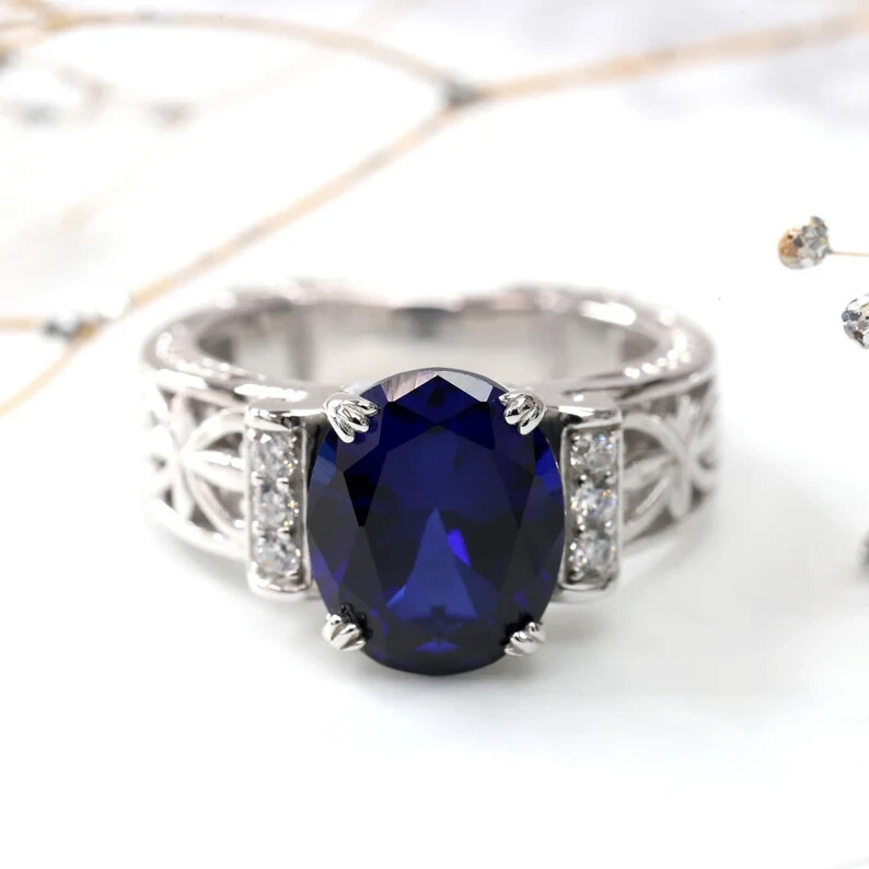 This stunning wedding band is absolutely breathtaking! The simulated blue sapphire sparkles beautifully, and the moissanite accents add extra brilliance. The sterling silver gives it a luxurious feel, and it fits perfectly. Love that it comes in different metal colors—such a gorgeous piece at an amazing price! Highly recommend for anyone looking for elegance without breaking the bank.