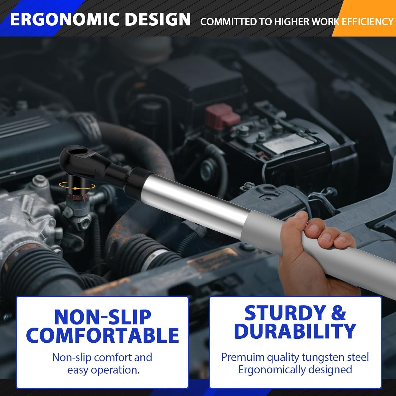 About This Item: Offset Extension Impact Wrench Set – Right Angle Adapter for Tight Spaces Designed for Confined & Hard-to-Reach Areas This offset extension wrench set is engineered to access tight spaces and obstructed fasteners with ease. Ideal for automotive repair, plumbing work, machinery maintenance, and furniture assembly, it significantly improves reach and maneuverability. High Torque Performance Built for demanding applications, this right-angle impact wrench adapter delivers up to 50 ft-lbs of torque when powered and 74 ft-lbs of manual torque, providing reliable strength for loosening and tightening stubborn fasteners. Heavy-Duty Alloy Steel Construction Manufactured from high-strength alloy steel, the reinforced rotating shaft mechanism ensures smooth operation, enhanced durability, and long service life under heavy use. One-Touch Direction Switching Features a convenient quick-switch mechanism that allows instant reversal between tightening and loosening, streamlining workflow and improving job efficiency. Standard Compatibility & Complete Set Overall dimensions: 17.1 x 1.57 x 1.57 inches. Equipped with a 1/2" fixed drive interface for connection to electric drills or impact drivers. Includes 4 drive adapters to support multiple socket sizes.