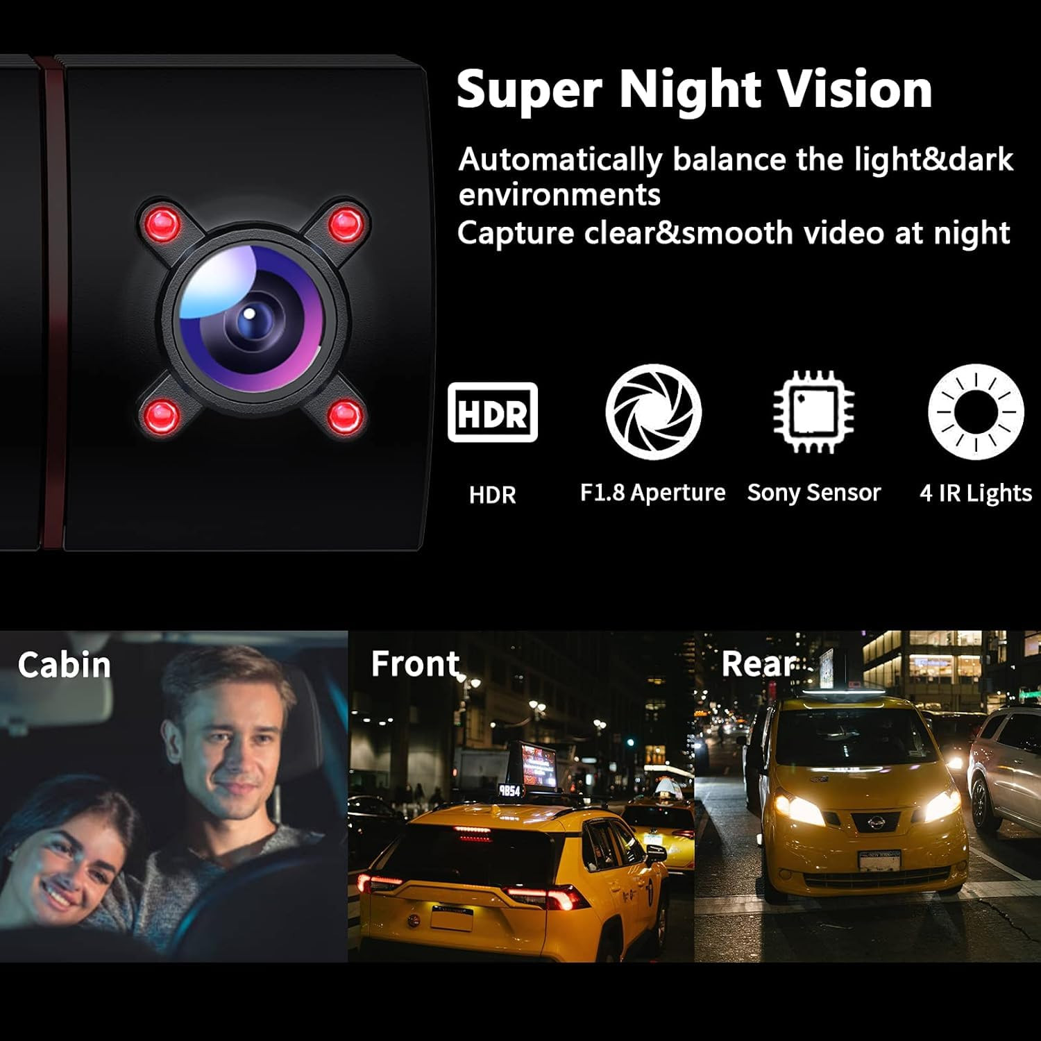 【Dash Cam Front and Rear Inside】The 3 channel dash cam record car front, car interior and car behind driving condition simultaneously up to 1080P +1080p +720P@30fps, or just use the 1080P dual dash cam to record the car front and interior, the rear dash cam can be not installed. The dash cam is capturing most road details clearly when driving, avoiding the blindspots and providing sufficient evidence for sudden collisions/traffic tickets. (U3 high-speed MicroSD card is required). 【Loop Recording & G-sensor】The dash cam is triggered by the built-in G-sensor, which can automatically lock the recorded video in emergency situations (such as hit or collision) to prevent it from being covered when detects a sudden collision. The dash cam with loop recording reserves the latest footage and overwrites the normal earliest footage when the memory card is full. 【Superior Night Vision with IR Light】Combined with the Sony STARVIS CMOS sensor,4 IR LEDs, and the F/1.8 big aperture,the upgraded dash cam can accurately capture the driver and passengers even when the car interior is in low light condition, perfect for rideshare drivers such as Uber, Lyft, and Taxi. WDR technology helps the dash cam balance the light conditions and perform better at night. 【2.5M Motion Detection】While the dash cam is in a status of power on , once the front dash camera detects an object moving, the dash cam will automatically recording, then stop recording when the image has no change in 20 seconds, protecting your car. The recorded videos will be protected from being overwritten. 【Dash Cam with Parking Mode】The dash cam supports normal parking monitoring and 24 hours continous parking monitoring to keep an eye on your car when parking. Once detects the collison or heavy shake, the dash cam will automatically wake up and record for 30s, then save the recorded video from being overwritten and automatically shut down. The 24 hours continous parking monitoring need external power supply or the hardwire kit( NOT Included) 【Screen Saver and Easy Use】The front and rear dash cam supports the screen saver function to not display the image on 2"lcd screen but still keep recording to not block your view when driving. And the dashcam can be easily attached to your windshield with included suction mount in few minutes. For better use, we also add the 32GB SD Card, so you do not purchase another one. We provide 12-month guarantee with 24/7 service, if you have any issue, please feel free to contact us. 【WARM TIP】1.This dash cam doesn't support Wifi, GPS or APP. 2. If you need exchange the sd card, please choose the U3/C10 high-speed brand microSD card, and format the SD card when first use. 3. The G-sensor function is only work when the dashcam is on, if you need the dashcam detects the collison when parking, please turn on the parking guard function.