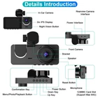 【3 Channel Dash Cam】-The dash cam is equipped with a 170° front camera, a 150°inside car camera and a 150°rear camera. 1080P Front camera can provide clear and sharp videos, capturing small details when involved in a collision. The rear camera always keeps you informed of the road status behind and protects you against backing into another car while parking. For ride-share drivers, the indoor car camera provides extra protection while escorting customers. 【Super Night Vision Dash Camera】-The dashcam with super night vision and infrared cabin light uses f/2.0 wide aperture with a total of 6 layers of optical lens and WDR technology, coupled with 4 infrared lights, enabling the car camera to show good color accuracy and clearly capture important details day or night 【24-Hour Parking Monitor& Motion Detection】-Parking monitor monitors your car's surroundings while parked, record when detect moving objects, to save power and memory space for more useful videos.While the motion detection or collision detection parking mode allows the camera to automatically initiate recording when triggered by a motion or collision event. The 3 channel dash cam should be connected to the hardwire kit at all times or an external battery. 【Auto Save the Collision Footage and Loop Recording】-Built in Gravity-Shock Sensor, then the dash cam detects a collision or bump happens, the sensor will auto-lock the footage as evidence(protected files). When the storage limit on the 32GB card is reached, the latest record will automatically overwrite the old record. Automatically detects sudden shocks/collisions and locks emergency footage to prevent video from being overwritten during loop recording. 【Car Dash Camera with Hidden Design & Easy to Install】-Unique compact designed car camera, Our dash camera for cars combine three cameras with a tiny size. Won't shade your view or distract you whilst driving. With simplified rear camera installation, no need to remove the reversing light, just connect it with the front lens and it can be used.