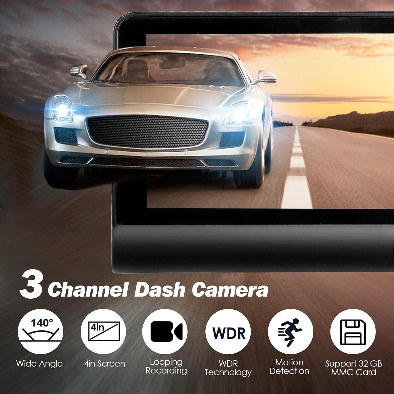【Three Channel Front Inside Rear Dash Cam】: Featured with 3 way cameras, that is front, inside and rear dash camera, which provide you with a full range of monitoring. Front camera applies vehicle video record, inside camera record the happy times inside your car, rear camera for parking assistance. Open a new era of three-way record mode and protect you from potential accidents and liability issues. 【Wide Angle Dash Cam】: Our 3-channel dash camera that provides 140° front camera, 90° interior camera and 120° rear camera for inspection of the inside and exterior of the car. Mount dash cam on the windshield and rear view camera behind the car, the camera will record automatically when driving. 【Car Camera with WDR Technology】: Enhance the clarity of images in different light environments and ensures the clarity of images at night, it makes night shots brighter and prevents overexposure under strong light. 【Seamless Looping Recording】: Support max 32G MMC card (Not Included). When the MMC card is full, dash cams will overwrite the oldest footage automatically and record the new files. 【Easy Installation】: Simple to mount the dash cameras on the windshield which makes for an overall straightforward installation process. It is plug and play, very convenient. If you have any other questions, you can also contact us. Product Description 1 Loop Recording 2 Wide Angle 3 WDR Technology Package Included