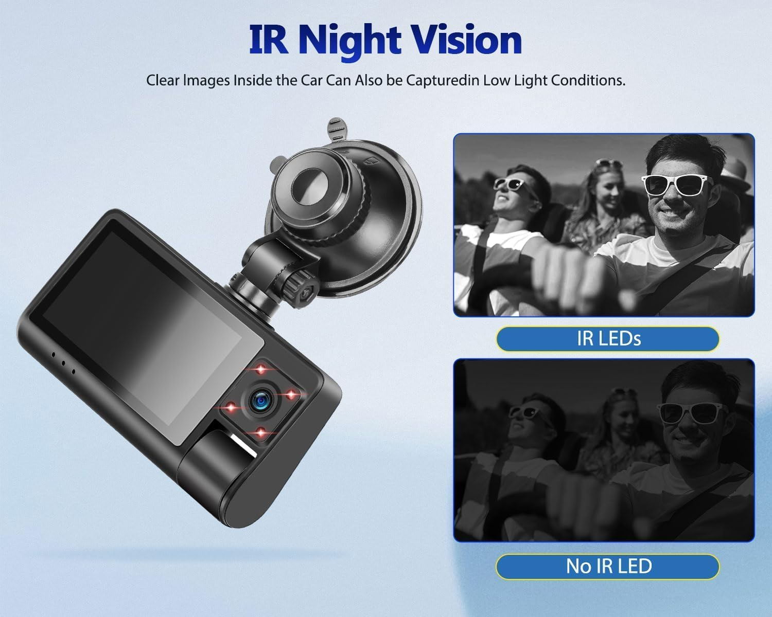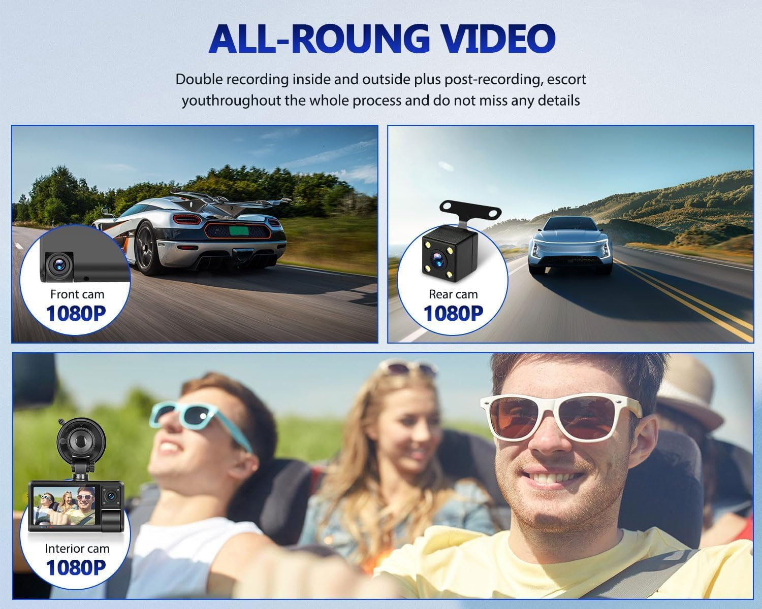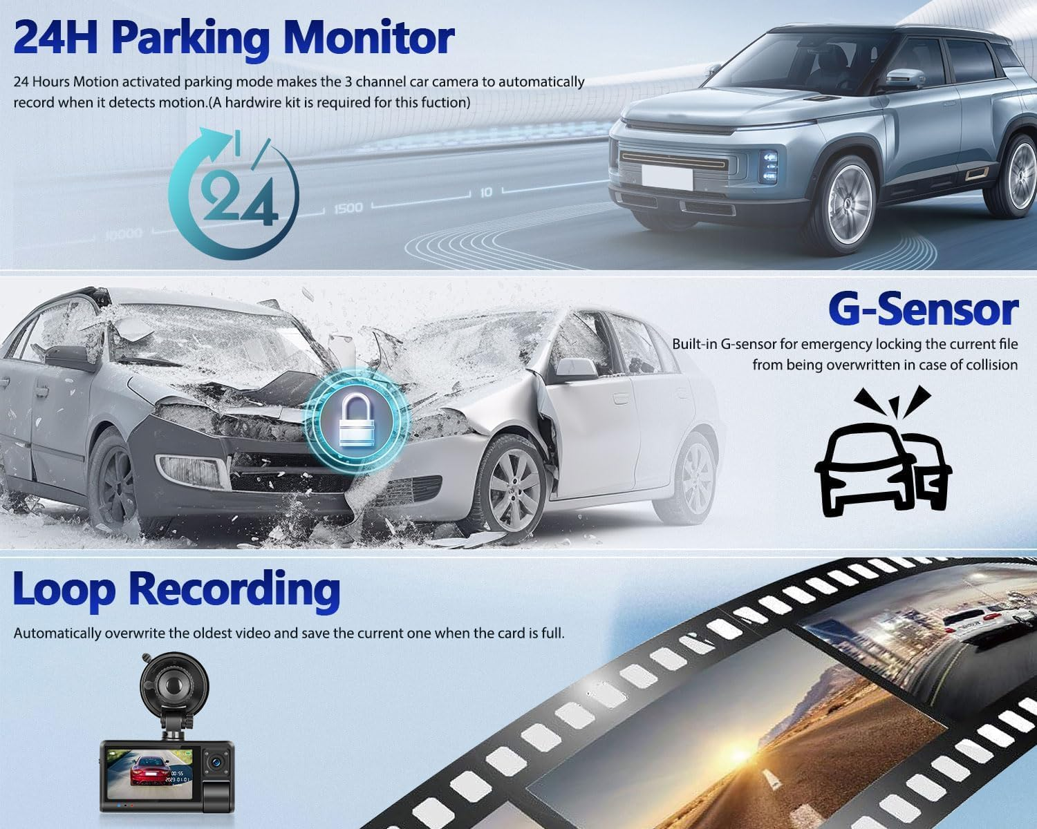 【3 Channel Dash Cam for All Round Protection】Dashcam built with a triple channel system, It comes with a 150° wide-angle front camera and a 120° in-car camera, as well as a 120° rear camera. 3 Channel with 5 Switching modes( Front + Rear/Front+Inside/Front/Inside/Rear),Capturing video in front of, behind and inside the car simultaneously helps retain and present evidence in unexpected situations such as collision,ensuring your safety on the road. 【Driving recorder with G-sensor & Loop Recording】The Dual dash camera Built-in G-sensor, the dash cam automatically detects collisions or sudden events and locks the relevant footage, preventing important recordings from being overwritten or deleted. The dash camera for cars supports loop recording and automatically overwrites old video files when storage space is running low, ensuring continuous recording without interruption. 【DVR Camera with 4 IR LED Night Vision & Parking Mode】CAMECHO dash cam equipped with advanced night vision technology, dash cam captures clear footage even in low light or nighttime conditions, enhancing driving safety. If your vehicle experiences a collision, or someone tries to steal your car, the camera will automatically activate and start recording upon detecting vibrations, providing protection for your car. 【Built-in WIFI & APP Support】The car dash cam features built-in WiFi and APP [6 Detective] support, with the application available for Android or iOS. The APP enables users to live preview, download videos, and manage. The recorded videos can be easily shared on Facebook, YouTube, Twitter, and so on. 【Dash Camera for Cars with Small Design & Easy to Install】Unique compact designed car camera, dash camera for cars combine three cameras with a tiny size. Won't shade your view or distract you whilst driving. With simplified rear camera installation, no need to remove the reversing light, just connect it with the front lens and it can be used. CAMECHO 3 Channel Dash Cam Front and Rear Inside, 3" Touchscreen 1080P Full HD 150 Deg Wide Angle Dashboard Camera with Wifi,G-Sensor,Loop Recording,24H Parking Recording with 4 IR Night Vision