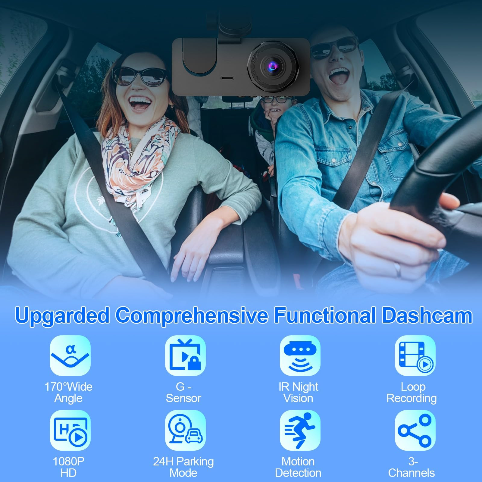 【3 Channel Dash Cam】-The dash cam is equipped with a 170° front camera, a 150°inside car camera and a 150°rear camera. 1080P Front camera can provide clear and sharp videos, capturing small details when involved in a collision. The rear camera always keeps you informed of the road status behind and protects you against backing into another car while parking. For ride-share drivers, the indoor car camera provides extra protection while escorting customers. 【Super Night Vision Dash Camera】-The dashcam with super night vision and infrared cabin light uses f/2.0 wide aperture with a total of 6 layers of optical lens and WDR technology, coupled with 4 infrared lights, enabling the car camera to show good color accuracy and clearly capture important details day or night 【24-Hour Parking Monitor& Motion Detection】-Parking monitor monitors your car's surroundings while parked, record when detect moving objects, to save power and memory space for more useful videos.While the motion detection or collision detection parking mode allows the camera to automatically initiate recording when triggered by a motion or collision event. The 3 channel dash cam should be connected to the hardwire kit at all times or an external battery. 【Auto Save the Collision Footage and Loop Recording】-Built in Gravity-Shock Sensor, then the dash cam detects a collision or bump happens, the sensor will auto-lock the footage as evidence(protected files). When the storage limit on the 32GB card is reached, the latest record will automatically overwrite the old record. Automatically detects sudden shocks/collisions and locks emergency footage to prevent video from being overwritten during loop recording. 【Car Dash Camera with Hidden Design & Easy to Install】-Unique compact designed car camera, Our dash camera for cars combine three cameras with a tiny size. Won't shade your view or distract you whilst driving. With simplified rear camera installation, no need to remove the reversing light, just connect it with the front lens and it can be used.
