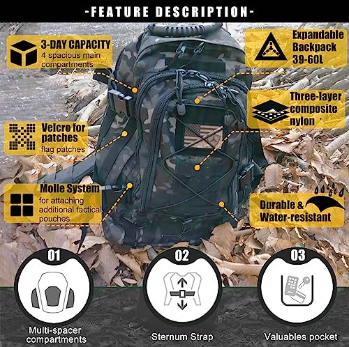 Return Policy Fast Delivery Trusted seller Backpack for Men 3 Day Pack for Hiking Camping Travel Product Description 【Durable & Water-resistant Tactical Backpack】Tactical bag features ultra strong shell fabric and construction are made of 600D Nylon for long-lasting performance. The shell is tough and water-resistant and stitched with reinforced nylon threads. 【Expandable Tactical backpack size】21 "; x 15" x 9" WHEN FULLY EXTENDED; Capacity: 39~64 Liters.The collapsible and expandable design lets you adjust the pack’s size to fit your gear. 【Backpack with Molle System】Molle backpack Put a 4”×4” patch panels at the front and back to stick your name patches and morale patches,Heavyweight MOLLE loops and webbing for attaching additional tactical pouches and gear for Travel. 【Multiple Compartments Heavy Duty Backpack】:Hiking Backpack has 3 main multi-compartment and dual zippered closure pockets including interior zip pocket and mesh pocket for more storage options.The main area expands from 5" to 10" to fit more gear. Each compartment has mesh or zippered pockets to store gear.This heavy-duty backpack has a laptop compartment. 【Backpack for Travel】Backpack has hydration compatible that works great for a hydration bladder(hydration bladder is not included) as hydration backpack. It can be used as 3 day pack, gym backpack, bug out bag backpack, molle backpack,men backpack, hunting backpack,outdoor camping backpack, travel backpack or day pack for daily Use. Shipping Returns Payment Shipping Shipping is FREE to all addresses other than APO/PO boxes in the lower 48 states. All our stock ships from US-based warehouses. Shipped via USPS or UPS (depending on location and package weight) Unless stated otherwise, all orders will ship within 24-72 hours of your payment being processed. Check our feedback to see the great reviews of FAST shipping we offer. Returns Seller does not accept returns Payment We currently accept payment via eBay managed payments only. Once payment is cleared, we will dispatch your shipment within 1-3 business days. Please refer to the "Shipping" tab for more information regarding shipping speed to your destination.