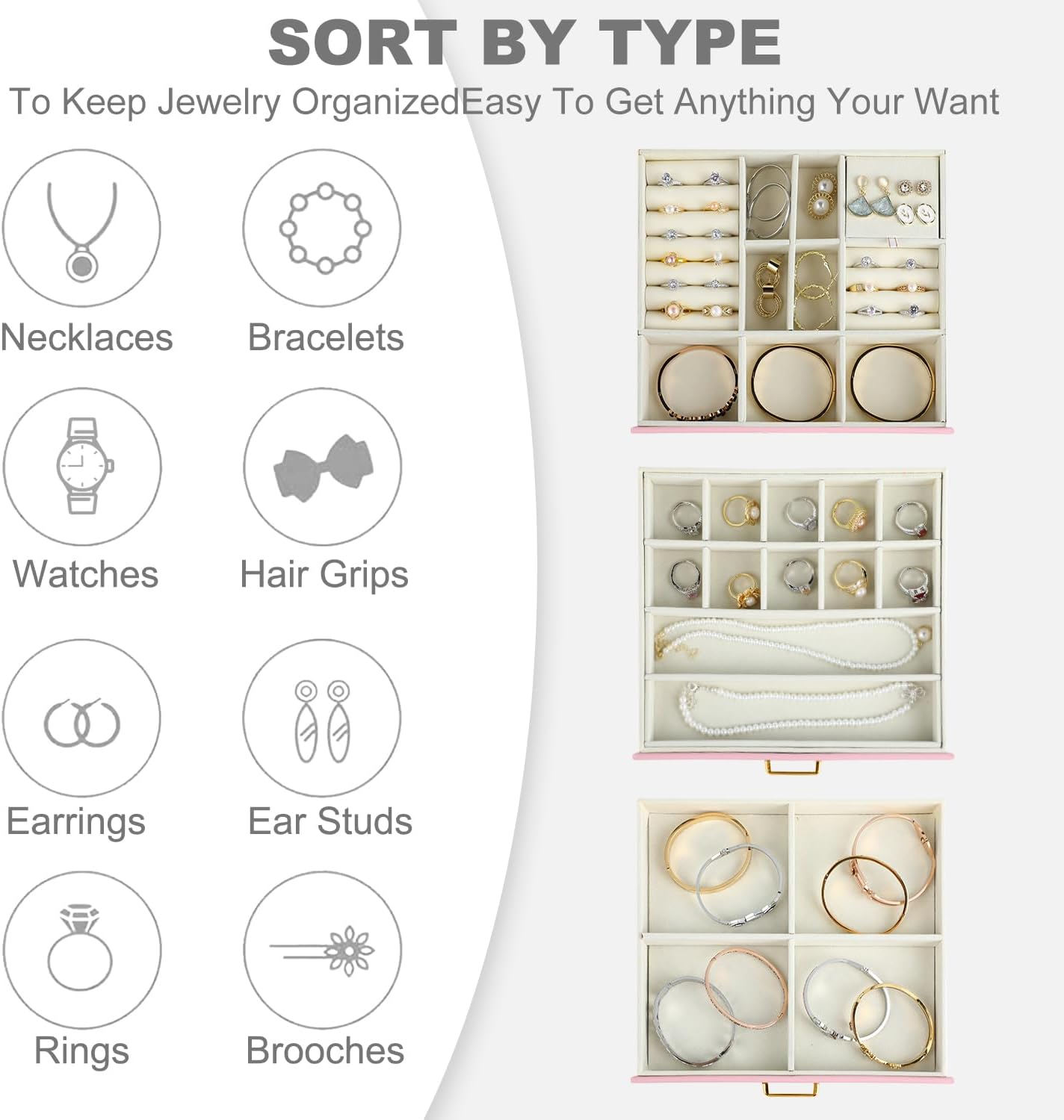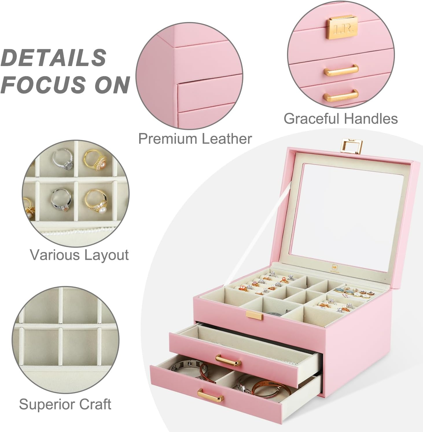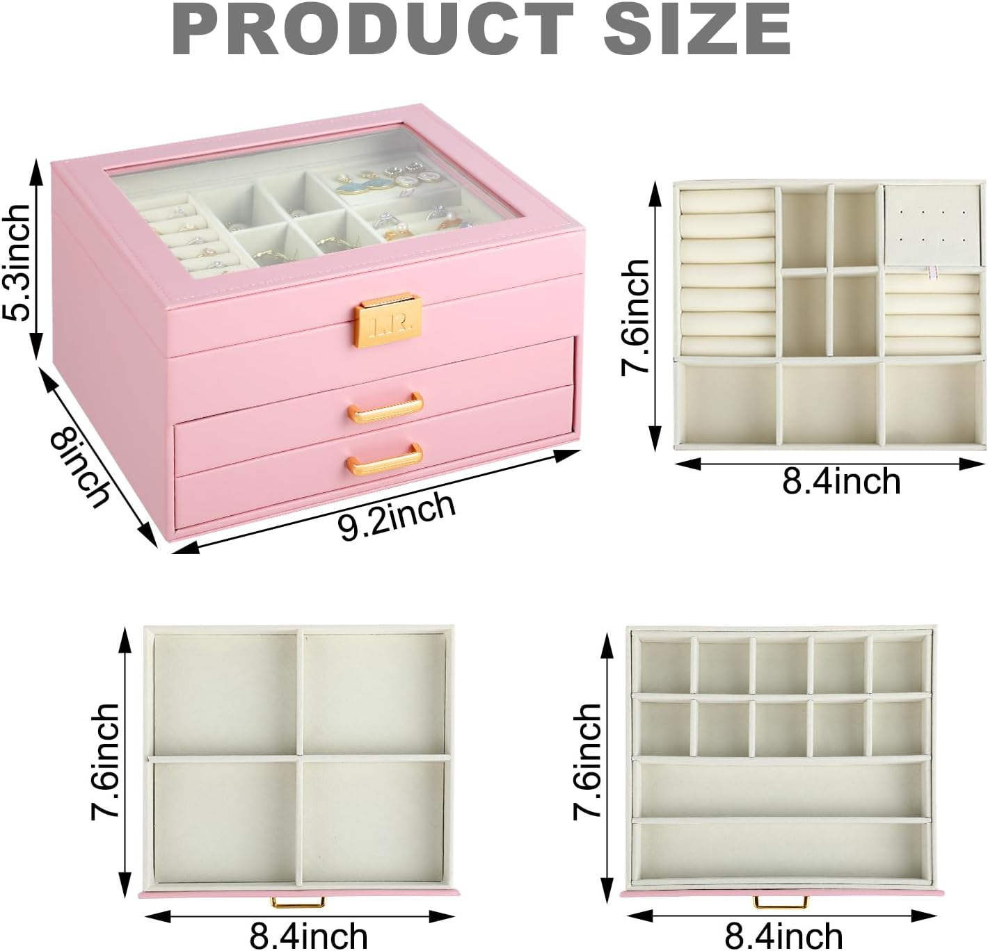 Store New Arrivals Add to Favorite View Feedback Contact Jewelry Box for Women - 3 Layer Jewelry Organizer with Clear Lid, Large Jewelry Case with 2 Drawers for Bracelets Rings Earrings Necklace Storage, 8 X 9.2 X 5.3 Inches, Pink+Gold Description Item model number SSH001 Style Modern Number of Items 1 Country of Origin China Warranty Type Manufacturer Batteries Included? No Jewelry Storage Type Jewelry Box Batteries Required? No Number of Compartments 17 Special Feature Waterproof, Dustproof Product Dimensions 9.2"D x 8"W x 5.3"H Material MDF (Medium Density Fiberboard), PU (Polyurethane), Velvet, Glass Number of Drawers 2 Finish Type Glossy Closure Type Buckle Item Weight 2.86 pounds Finish Glossy Occasion Anniversaries, birthdays, Thanksgiving Special Features Waterproof, Dustproof Target Audience Women, Girls Part Number SSH001 Mounting Type Table Top Color Pink+Gold Inner Material Velvet Shape Rectangular Recommended Uses For Product Necklace, Bracelet, Ring, Earring, Bangle Included Components Jewelry Box Latch key [Transparent Glass Lid] Under the clear glass lid of this jewelry box, all of your favorite jewels are visible at a glance and well-protected from dust—picking out what you want is a breeze now [Advanced Materials] case is made of durable PU leather,which is dirt-resistant, waterproof, non-deformable and easy to clean. The inner lining is wrapped in durable and soft velvet , and with a smooth and exquisite metal buckle for easy opening and closing [Oodles of Storage] With 3 layers and 8 hidden earring slots and 1 watch pillow and 15 compartments of varying sizes. No more missing pieces [PERFECT SIZE] Our jewellery storage case with the size 8*9.2*5.3 inch (D*W*H), has room to hold multiple earrings, rings, necklaces and bracelets and Wrist watch. [Perfect Jewelry Gift Box ]: The perfect gift for your friend, wife or mother's birthday, Christmas, Valentine's Day, Mother's Day and anniversaries. The jewelry box can be used ring storage box, necklace storage box, earring storage box, but also as a gift box for bracelets. We provide one year quality and after sale service Product Description Product Description Jewelry Box for Gift 3-layer jewelry storage box. It looks great and can be used for pins, necklaces, rings, bracelets, and other accessories. The alloy lock is easy to open and close. Clear glass lid, all your favorite jewelry is visible at a glance, good protection from dust, can let you see what you want at a glance. Structure Description Lruffen Jewelry Box Secure storage of rings, studs, earrings, bracelets, watches. Elegant & durable: Attractive appearance with pink faux leather surface and soft velvet lining inside. 2 pullout drawers of the same size. Leather smooth, dirt resistant, waterproof, no deformation. Grid layout, neat stitching, and soft flannel protect your jewelry from dust, fingerprints, scratches, and damage. Some Details About The Jewelry Box Organize Jewelry For Quick Finding Large Capacity Storage A Must-Have Dresser The Perfect Gift For Your Friends, Yourself, Wife And Family ABOUT US We offer the best prices around on high quality products. Our E-store includes media such as books, movies, music and games while offering electronics, toys, sporting apparel, clothing, tools, general home, garden items and more. SHIPPING We are always working hard to ensure your package arrives as soon as possible. Please understand that some factors like weather, high postal traffic, and the performance of shipping companies are outside of our control. We offer free shipping to the lower 48 states and ship within 2 business days of payment, usually sooner. We do not accept P.O. Boxes. Please provide a physical address. For shipping outside of the continental USA, we only use eBay's Global Shipping Program.The item is shipped to KY and then sent to the rest of the world. International customers are responsible for all duties and taxes. Continue to check out in order to calculate costs for shipping the item to your country. Messages regarding eBay's Global Shipping Program MUST be directed at eBay EXCLUSIVELY. RETURNS We offer a 30-Day Return Policy on items which you are not completely satisfied with. You have the option for a full-refund or an exchange of the item. No returns are available on items shipped outside of the USA. PAYMENT We accept PayPal. CONTACT US This page content is yet to come Please ad us to your favorite seller and visit again later Thank You CUSTOMER SATISFACTION We try our very best to make sure every customer is completely satisfied. If there's a problem, message us! We're happy to help. WE ACCEPT Copyright © 2021 AutoDS. | All Rights Reserved