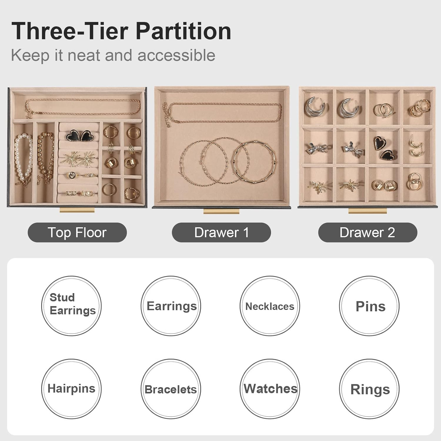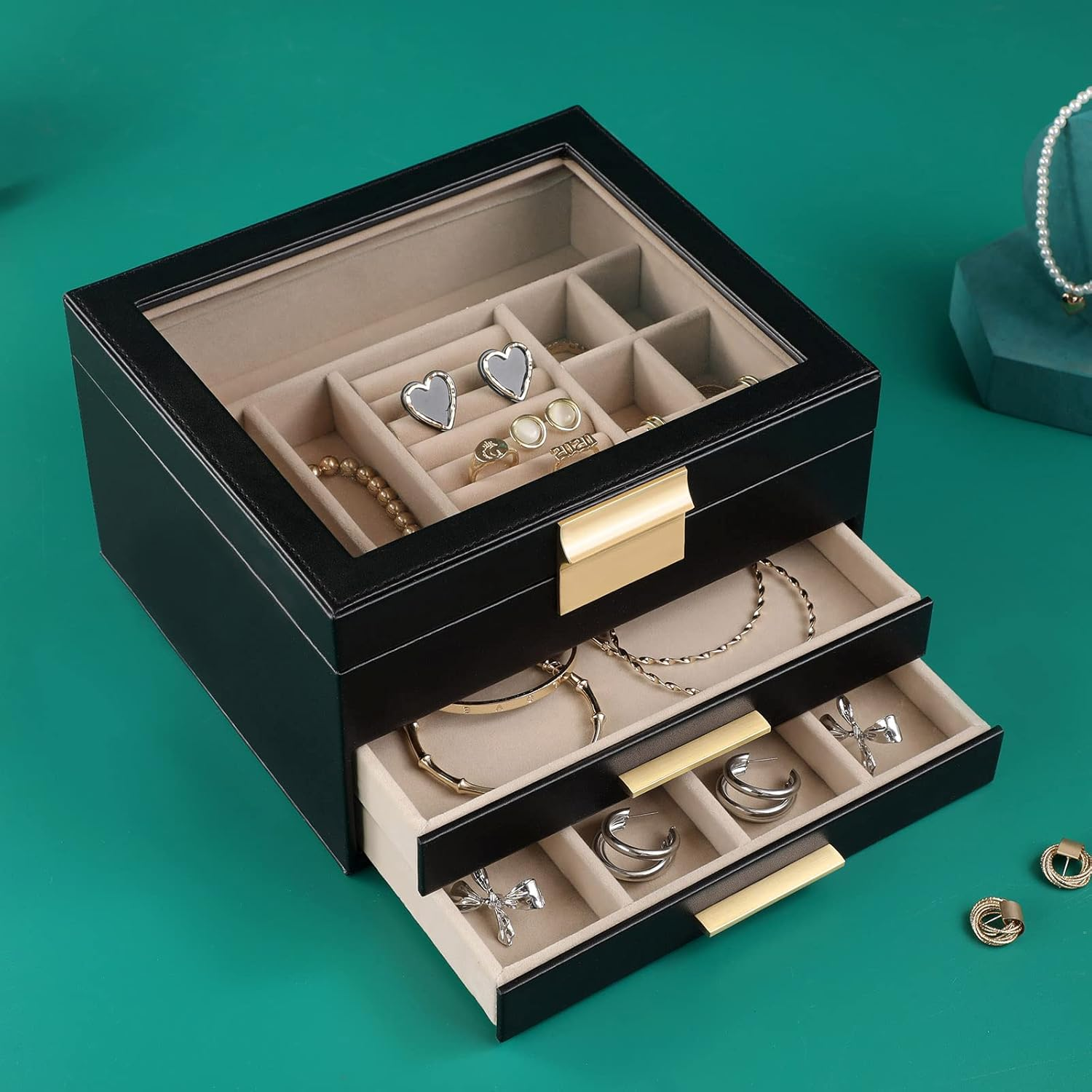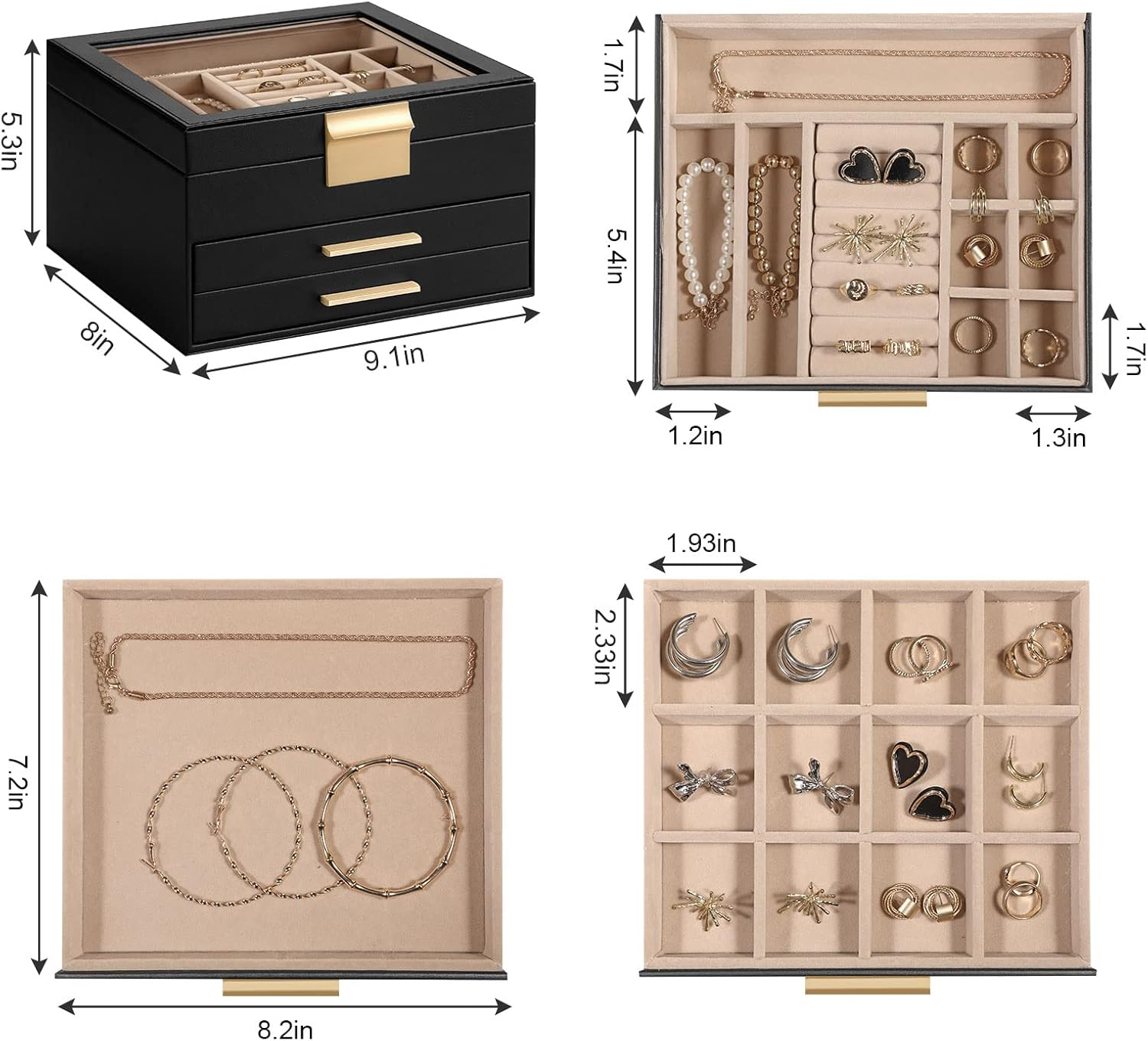 Store New Arrivals Add to Favorite View Feedback Contact Jewelry Box Organizer for Women,3 Layers Jewelry Storage Display Box with Glass Lid,Gift for Christmas,3 Drawers,Large Capacity for Necklace Earrings Bracelets Rings,Black Description Style Modern Batteries Included? No Jewelry Storage Type Jewelry Box Batteries Required? No Number of Compartments 4 Special Feature Lined Product Dimensions 8"D x 9.1"W x 5.3"H Material Engineered Wood, Leather, Metal, Acrylic Number of Drawers 2 Finish Type High Gloss Item Weight 3.39 pounds Finish High Gloss Occasion Mother's Day, Wedding, Friendship Day, Thanksgiving, Valentine's Day Special Features Lined Target Audience Women, Girls Color Black Shape Rectangular Recommended Uses For Product Ring Inner Material Metal Size 2 Drawers(5.3"H) Reasonable Space Layout: This jewelry box has three layers. The first layer can organizer necklaces, earrings and rings. The two drawers provide you with enough space for placing bigger jewelry such as bracelet Multi-function for DIY Layer: The partition in the third layer is removable which can meet different needs and keep all types of jewelry organized Transparent Glass Lid: Large transparent glass windows give a good view for jewelry in the box and provide well-protected from dust. Fashion Design: Elegant metal handle, delicate PU leather, top transparent lid, these elements are combined in this light and luxurious jewelry box to accompany you for many years. Ideal Gift for Christmas: stylish appearance, multi-color options, quality workmanship - This jewelry box is perfect as a gift for most occasions, anniversary gift for your loved ones,women,friends or yourself. Product Description Noble gold metal hardware and textured surface materials are the characteristics of this jewelry box. Three layers of storage layer meet your daily jewelry storage needs. This jewelry box can be used as a Christmas gift for your lover,friends and women. Top Glass Lid The First Layer The Second Layer The Third Layer Gold Metal Handle The golden metallic luster makes it look very noble and elegant Soft Flannelette Soft flannelette lining can protect your jewelry from wear Clear Transparent Lid The lid allows you to admire your favorite jewels without opening the lid. Premium Leather Exquisite workmanship makes the surface more textured ABOUT US We offer the best prices around on high quality products. Our E-store includes media such as books, movies, music and games while offering electronics, toys, sporting apparel, clothing, tools, general home, garden items and more. SHIPPING We are always working hard to ensure your package arrives as soon as possible. Please understand that some factors like weather, high postal traffic, and the performance of shipping companies are outside of our control. We offer free shipping to the lower 48 states and ship within 2 business days of payment, usually sooner. We do not accept P.O. Boxes. Please provide a physical address. For shipping outside of the continental USA, we only use eBay's Global Shipping Program.The item is shipped to KY and then sent to the rest of the world. International customers are responsible for all duties and taxes. Continue to check out in order to calculate costs for shipping the item to your country. Messages regarding eBay's Global Shipping Program MUST be directed at eBay EXCLUSIVELY. RETURNS We offer a 30-Day Return Policy on items which you are not completely satisfied with. You have the option for a full-refund or an exchange of the item. No returns are available on items shipped outside of the USA. PAYMENT We accept PayPal. CONTACT US This page content is yet to come Please ad us to your favorite seller and visit again later Thank You CUSTOMER SATISFACTION We try our very best to make sure every customer is completely satisfied. If there's a problem, message us! We're happy to help. WE ACCEPT Copyright © 2021 AutoDS. | All Rights Reserved