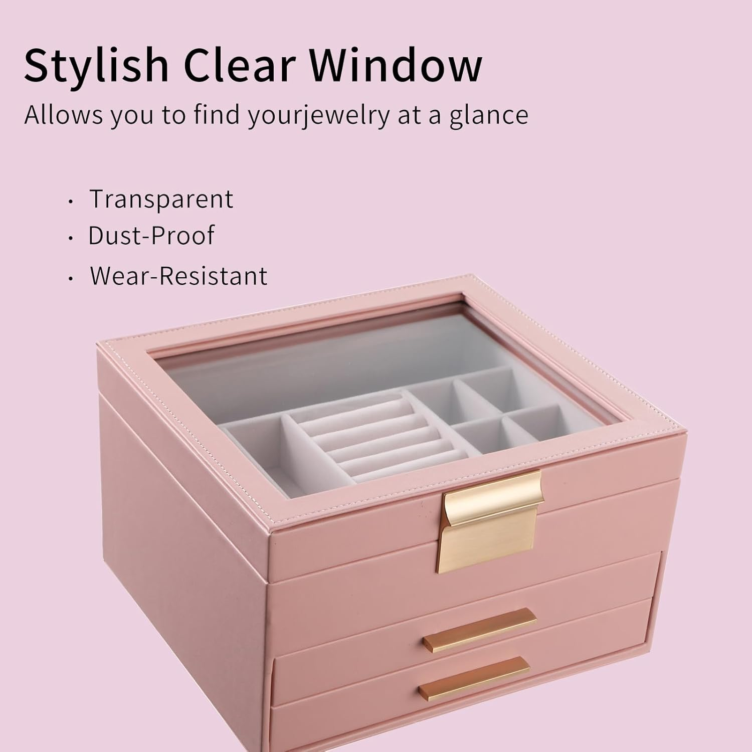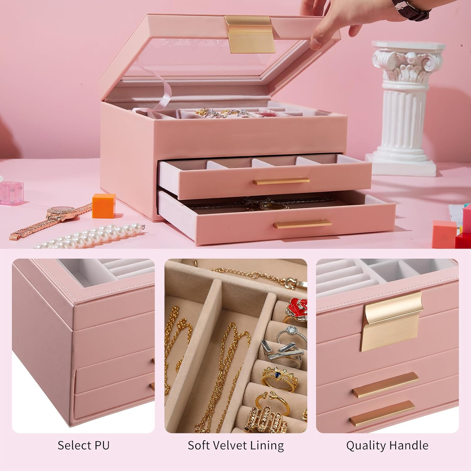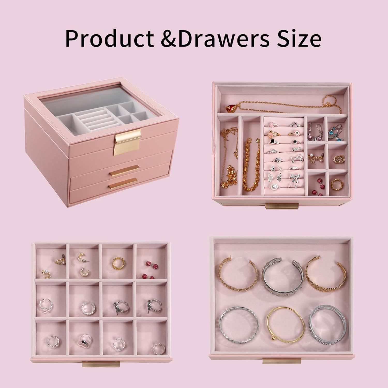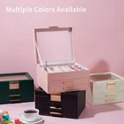 Large Clear Glass Lid -- House your favorite jewels under the glass lid so you can always find them at a glance while protecting them from dust, keeping your jewelry ready to wear and clean 3 Layers Storage -- Keep all your jewelry organized in this jewelry box—small pieces of jewelry go in the various slots of the top layer, and big jewelry goes in the bottom 2 drawers Chic and Durable -- It is made of premium PU leather, soft velvet lining, flannel interior, and sturdy MDF. All these elements combined make this jewelry case stylish and durable enough for your ever-growing jewelry collection Versatile Use -- This modern jewelry organizer looks nice whether displayed on the dresser of your bedroom or your cloakroom. this jewelry organizer will bring all your treasures, pins, necklaces, rings, bracelets and other accessories under control, from bracelets to studs Great Gifts for Festival Commemoration -- 3 Layer Jewelry box is the best Christmas gift for mom, grandma, daughter and wife. Gift this original design jewelry box to your loved ones for their birthday or anniversary to surprise them or yourself. You and your loved deserve it! Product Description