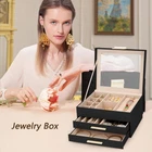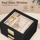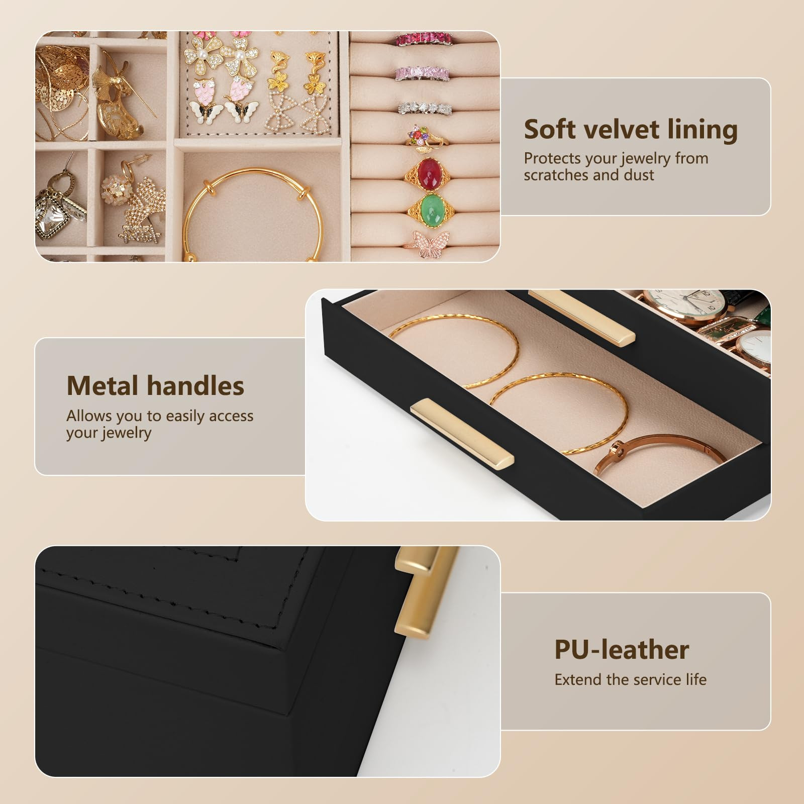【Large Clear Lid for Easy Access】 – Showcase your favorite pieces under the clear glass lid of this jewelry organizer for women, making it effortless to find your treasures at a glance. This 3-layer jewelry box features three spacious drawers, multiple compartments, and elegant gold hardware for smooth access. 【Durable Material & Elegant Design】 – Crafted with premium PU leather, a soft velvet lining, and a flannel interior, this womens jewelry box is as durable as it is stylish. It’s shockproof and pressure-resistant, ensuring your valuable pieces stay safe. DIMENSIONS: 9.05" x 7.67" x 5.31". 【Versatile Jewelry Storage Solution】 – Perfect for organizing all your accessories, this jewelry box for women fits seamlessly on your bedroom dresser or closet shelf. Whether you need jewelry boxes & organizers for necklaces, earrings, or bracelets, this chic jewelry storage solution handles it all. 【Thoughtfully Designed Compartments】 – Rings fit snugly in the slots, earrings in small cubes, and necklaces in narrow compartments. With its practical layout, this jewlry box ensures every piece has its place, keeping everything tidy and easy to find. 【Perfect Gift for Any Occasion】 – This jewlery box is the ideal gift for women, from mothers to daughters and wives. With its modern design and included gift card, it’s ready to impress for birthdays, anniversaries, or any celebration.