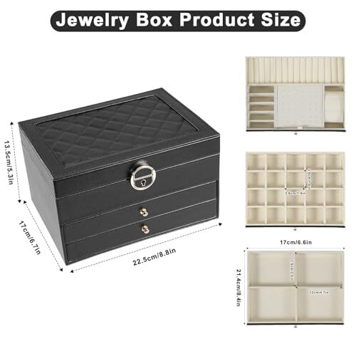 Return Policy Fast Delivery Trusted seller 3-Layer Jewelry Box for Women, Jewelry Organizers and Storage with Removable Jewelry Tray, Vintage Quilted Top Lockable Jewelry Holder Gift Idea Black Product Description Beautiful and Useful Jewelry Organizer Box: The design features a quilted pattern on the top and offers sufficient space for storing jewellery. The leather is of a high quality, with a smooth and sleek finish Pull-out drawer Jewelry Box: The double-layer jewelry drawer offers ample storage space, with hooks, slots and compartments of varying sizes to accommodate a range of jewelry items Versatile Use: Modern jewelry boxes & organizers for vanity tables, cloakrooms, and more. Organise pins, necklaces, rings, bracelets, and other accessories Maximise Your Space: Our jewelry box keeps your jewellery tidy and at arm's reach. With a well-organised design, it lets you easily find your favourite pieces Ideal Gift Idea: This gorgeous jewelry box is great gift for any special occasion. Its original design and high-quality craftsmanship make it a thoughtful and beautiful present for Valentine's Day, Mother's Day, Christmas, birthdays, anniversaries or for yourself. Shipping Returns Payment Shipping Shipping is FREE to all addresses other than APO/PO boxes in the lower 48 states. All our stock ships from US-based warehouses. Shipped via USPS or UPS (depending on location and package weight) Unless stated otherwise, all orders will ship within 24-72 hours of your payment being processed. Check our feedback to see the great reviews of FAST shipping we offer. Returns Seller does not accept returns Payment We currently accept payment via eBay managed payments only. Once payment is cleared, we will dispatch your shipment within 1-3 business days. Please refer to the "Shipping" tab for more information regarding shipping speed to your destination.