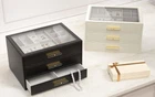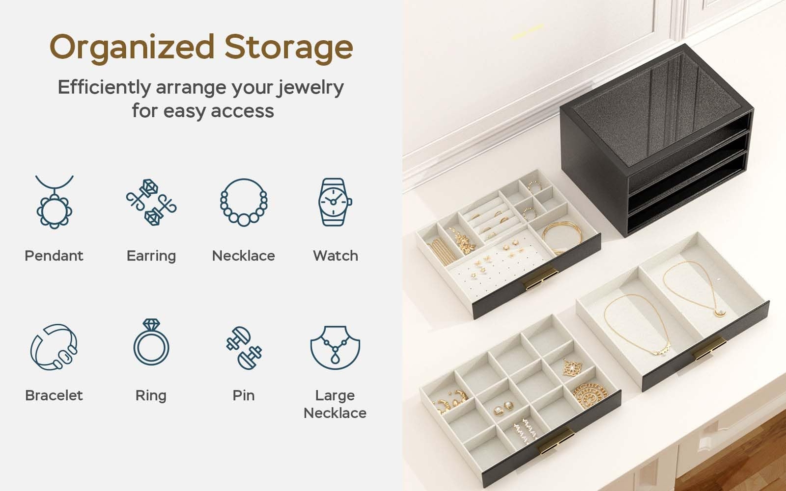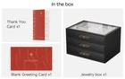 Transparent Glass Lid: Jewelry box with a clear glass lid; allows visibility of your jewelry; prevents dust from entering; keeps your jewelry clean; offers protection to prevent damage; enhances aesthetics; easy to clean and maintain Premium Materials: Handcrafted jewelry box made of medium-density fiberboard; wrapped in moisture-resistant and wear-resistant PU leather; transparent acrylic window for easy jewelry selection; soft velvet lining protects against moisture and scratches Multi-layer Storage Space: Jewelry box with three layers for organizing various jewelry sizes; top layer for small items like rings, earrings, and bracelets; removable compartments for custom storage; middle drawer for larger items; bottom drawer for large jewelry Diverse Usage Scenarios: Modern jewelry box perfect for display on bedroom dressers or wardrobes; easy organization and display of your jewelry in various settings Perfect Present Choice: Ideal gift for occasions like Christmas, Valentine's Day, or Mother's Day; express care to loved ones like mom or wife; includes DIY greeting card for a personal message