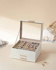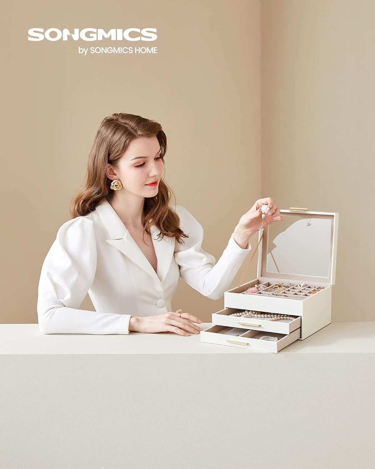 Product Description [Storage, 3 Layers] Keep all your jewelry organized in this jewelry box—small pieces of jewelry go in the various slots of the top layer, and big jewelry goes in the bottom 2 drawers [Clear Glass Lid] The see-through glass lid of this jewelry organizer allows you to see and find your favorite jewels at a glance while protecting them from dust, keeping your jewelry ready to wear and clean [Chic & Durable] Elegant white and gold colors, shiny metal handles, soft velvet lining, neat stitching, quality PU, and sturdy MDF—all these elements combined make this jewelry case stylish and durable enough for your ever-growing jewelry collection [Perfect Gift Idea] Gift this original design jewelry box to your loved ones for their birthday or anniversary to surprise them! Or, treat yourself to this fancy jewelry box—you deserve it! [Versatile Use] This modern jewelry holder looks nice whether displayed on the dresser of your bedroom or your cloakroom to organize your pins, necklaces, rings, bracelets, and other accessories Gift for Yourself Non-Slip Drawer Handles Each of the two drawers comes with a non-slip handle so you can slide them in and out easily. Soft Velvet Lining Soft velvet lining protects your jewelry from scratches and other damage. Removable Partition The partition in the 12-compartment section is removable to make room for bigger jewels. 1 Non-Slip Drawer Handles 2 Soft Velvet Lining 3 Removable Partition Other Highlights Clear Glass Lid The see-through lid allows you to admire your favorite jewels without opening the lid. Well-Protected in Transit The glass lid is protected by two layers of polystyrene to prevent it from breaking during transit.