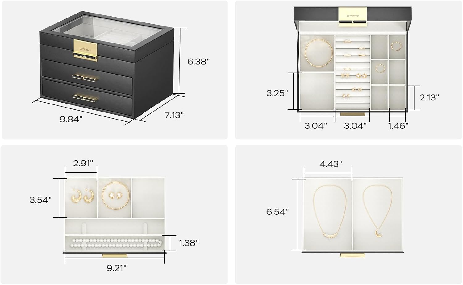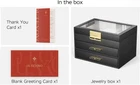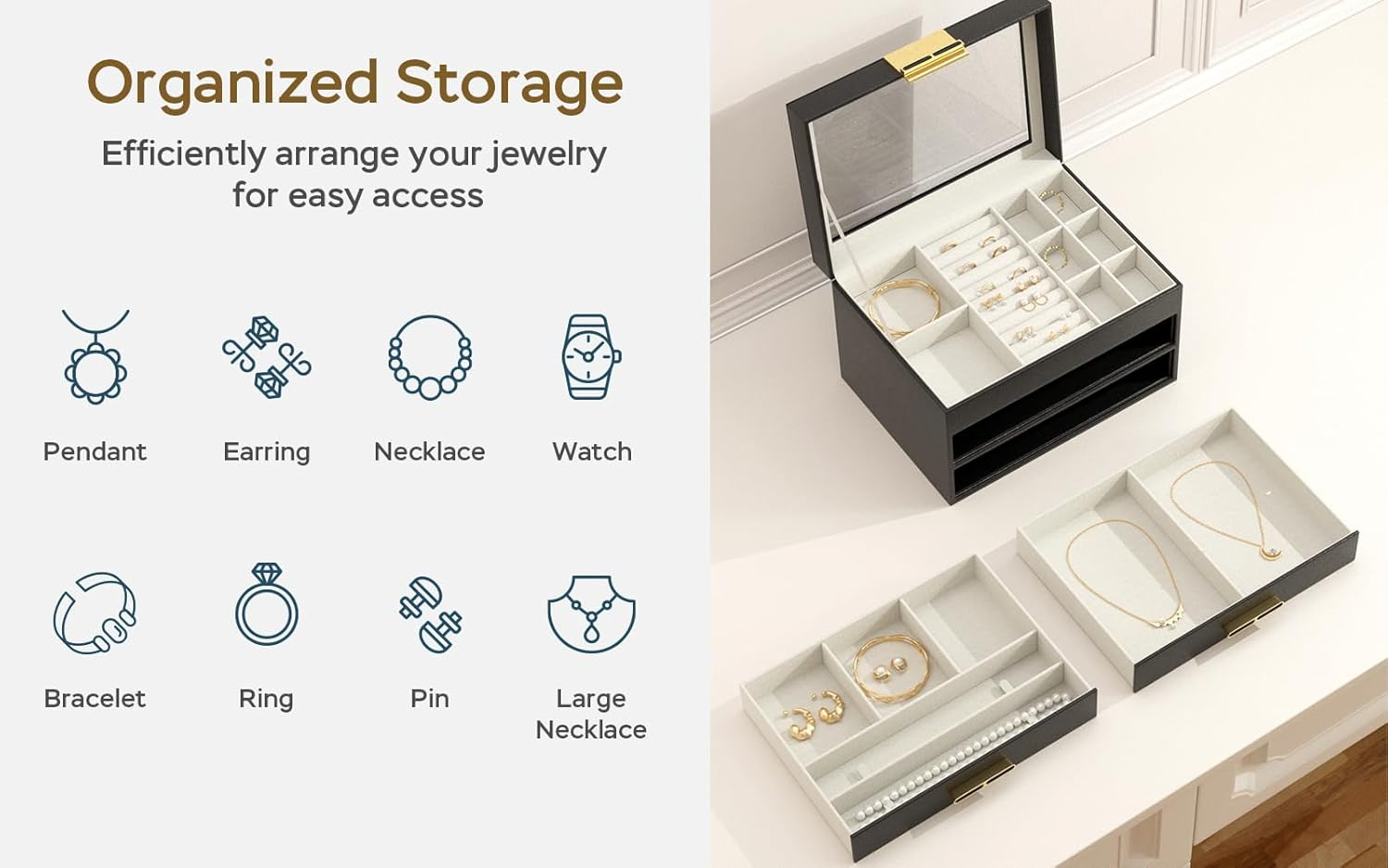 Store New Arrivals Add to Favorite View Feedback Contact Jewelry Organizer with Glass Lid, 3-Layer Jewelry Box, 2 Drawers, for Big and Small Jewelry, Earrings, Rings, Necklaces - Ideal Gift for Women, Midnight Black (Model A2307BK) Description Item model number A2307BK Style Modern Number of Items 1 Country of Origin China Batteries Included? No Jewelry Storage Type Jewelry Book Batteries Required? No Number of Compartments 3 Special Feature Hardware Included, Waterproof, Dustproof, Adjustable, Mirror Product Dimensions 7.05"D x 9.75"W x 6.28"H Material Acrylic, PU (Polyurethane), Velvet, MDF (Medium Density Fiberboard), Zinc Alloy Number of Drawers 2 Finish Type PU, Acrylic Closure Type Latch Item Weight 3.45 pounds Finish PU, Acrylic Occasion Mother's Day, Christmas, Anniversary, Birthday, Valentine's Day Special Features Hardware Included, Waterproof, Dustproof, Adjustable, Mirror Target Audience Daughter, Grandma, Grandmother, Women, Wife, Mom Part Number A2307BK Mounting Type Table Top Color Black Inner Material Velvet Shape Rectangular Recommended Uses For Product Necklace, Pin, Bracelet, Ring, Charm, Watch, Earring, Bangle Included Components Jewelry box Size Flip-Open 3-Layer Transparent Glass Lid: Jewelry box with a clear glass lid; allows visibility of your jewelry; prevents dust from entering; keeps your jewelry clean; offers protection to prevent damage; enhances aesthetics; easy to clean and maintain Premium Materials: Handcrafted jewelry box made of medium-density fiberboard; wrapped in moisture-resistant and wear-resistant PU leather; transparent acrylic window for easy jewelry selection; soft velvet lining protects against moisture and scratches Multi-layer Storage Space: Jewelry box with three layers for organizing various jewelry sizes; top layer for small items like rings, earrings, and bracelets; removable compartments for custom storage; middle drawer for larger items; bottom drawer for large jewelry Diverse Usage Scenarios: Modern jewelry box perfect for display on bedroom dressers or wardrobes; easy organization and display of your jewelry in various settings Perfect Present Choice: Ideal gift for occasions like Christmas, Valentine's Day, or Mother's Day; express care to loved ones like mom or wife; includes DIY greeting card for a personal message Product Description 1 PU(Polyurethane) 2 Soft Velvet Lining 3 Hollowed-out Handles 4 Sturdy Fiberboard Divider 5 Larger Storage Capacity 1 Layer 1 of 3 2 Layer 1 of 3: DIY 3 Layer 2 of 3 4 Layer 3 of 3 1 Start Your Day with Style 2 Enhance Your Routine 3 Elevate Your Décor 4 Stay Chic at Work Discover Your Style: Explore 5 Unique Designs Add to Cart Add to Cart Add to Cart Add to Cart Customer Reviews 4.5 out of 5 stars 41 4.5 out of 5 stars 41 4.5 out of 5 stars 41 4.5 out of 5 stars 41 4.5 out of 5 stars 41 Price $35.99 $ 35 . 99 $35.99 $ 35 . 99 $35.99 $ 35 . 99 — $129.99 $ 129 . 99 Design Flip-Top Top Drawer Flip-Top Top Drawer Pull-Out Top Drawer Pull-Out Top Drawer Dual-door Number of Layers 3 3 3 3 9 With Glass Lid ✔ ✔ ✔ ✔ ✘ With Removable Tray ✔ ✔ ✔ ✔ ✔ Lockable ✘ ✘ ✘ ✘ ✘ Product Size (D x W x H) 7.05"D x 9.75"W x 6.28"H 7.05"D x 9.75"W x 6.28"H 7.05"D x 9.75"W x 5.85"H 7.05"D x 9.75"W x 5.85"H 7.9"D x 12.3"W x 14.7"H ABOUT US We offer the best prices around on high quality products. Our E-store includes media such as books, movies, music and games while offering electronics, toys, sporting apparel, clothing, tools, general home, garden items and more. SHIPPING We are always working hard to ensure your package arrives as soon as possible. Please understand that some factors like weather, high postal traffic, and the performance of shipping companies are outside of our control. We offer free shipping to the lower 48 states and ship within 2 business days of payment, usually sooner. We do not accept P.O. Boxes. Please provide a physical address. For shipping outside of the continental USA, we only use eBay's Global Shipping Program.The item is shipped to KY and then sent to the rest of the world. International customers are responsible for all duties and taxes. Continue to check out in order to calculate costs for shipping the item to your country. Messages regarding eBay's Global Shipping Program MUST be directed at eBay EXCLUSIVELY. RETURNS We offer a 30-Day Return Policy on items which you are not completely satisfied with. You have the option for a full-refund or an exchange of the item. No returns are available on items shipped outside of the USA. PAYMENT We accept PayPal. CONTACT US This page content is yet to come Please ad us to your favorite seller and visit again later Thank You CUSTOMER SATISFACTION We try our very best to make sure every customer is completely satisfied. If there's a problem, message us! We're happy to help.