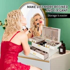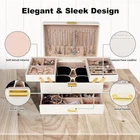 3 Layers of Large Capacity: The jewelry box has 5 ring slots, 9 ring boxes, 10 necklace hooks, 26 ear stud holes, 2 adjustable space compartments. The jewelry organizer box has a variety of designs and compartments, which can store all your jewelry, whether it is a large piece of jewelry or a small earring, there is a place to store it Advanced Materials: With its soft velvet surface, this velvet jewelry box is sure to make you love it. The inner lining is wrapped in comfortable and soft velvet to provide all-round protection for your jewelry, and with a smooth and exquisite metal buckle for easy opening and closing Space-Saving Jewelry Box: With our 3-layer jewelry box, all your jewelry will be organized and easy to access. From then on, you have a bright dressing table that makes your room look more tidy and elegance. Moreover, the classification design of our large jewelry box organizer allows you to reduce the search time New upgrade: The size of this jewelry storage box is enlarged, 9.1 x 6.3 x 5.71 inches when closed. This girls jewelry box has undergone a new upgrade in the functional partition, making full use of every place to store your rings, necklaces, bracelets, earrings, earrings, hair clips, watches and other small accessories Ideal Jewelry Gift Box: This velvet jewelry organizer looks elegant and considerate. The women jewelry box is the perfect gift for yourself, your friends, wife or mother for birthdays, Christmas, Valentine's Day, Mother's Day and anniversaries Product Description Some Details about the Jewelry Box 1 3-Layer 2 Some Details Jewelry Box for Gift Whether you are treating yourself or giving a gift to your girlfriend, wife, mother or other loves for Birthday, Mothers' day, Valentine's Day, Christmas, Anniversary Day, or Wedding. Our Dajasan jewelry box organizer is a ideal choice. Best Gift for Yourself The video showcases the product in use. The video guides you through product setup. The video compares multiple products. The video shows the product being unpacked. hero-video Merchant Video Unique Design Detachable Design The jewelry box for women has a detachable design to meet your different needs. You can choose to install or delete them as needed. Movable Metal Frame The movable design of the jewelry organizer box makes it easy to reach the jewelry, and when you move it, you will find a large hidden space inside. Pick Your Favorites Add to Cart Add to Cart Add to Cart Add to Cart Add to Cart Customer Reviews 4.6 out of 5 stars 3,882 4.1 out of 5 stars 33 4.7 out of 5 stars 35 4.6 out of 5 stars 841 4.7 out of 5 stars 431 4.7 out of 5 stars 743 — Price $30.59 $ 30 . 59 $39.99 $ 39 . 99 $37.99 $ 37 . 99 $34.99 $ 34 . 99 $19.99 $ 19 . 99 $15.99 $ 15 . 99 — Size 9.1*6.3*5.71inch 9.84*8.66*7.48inch 10.71*7*5.6inch 9.1*6.3*7.48inch 10*7.68*3.74inch 6*4.13*2inch 3.95*3.95*1.97inch Material Leather Leather Leather Leather Velvet Velvet Velvet Color White White White Champagne Pink Dusty Pink Blue Weight 2.2lb 5.82lb 3.06lb 2.93lb 1.81lb 6.7ounce 4.6ounce Number of Tiers 3 4 3 4 2 1 1