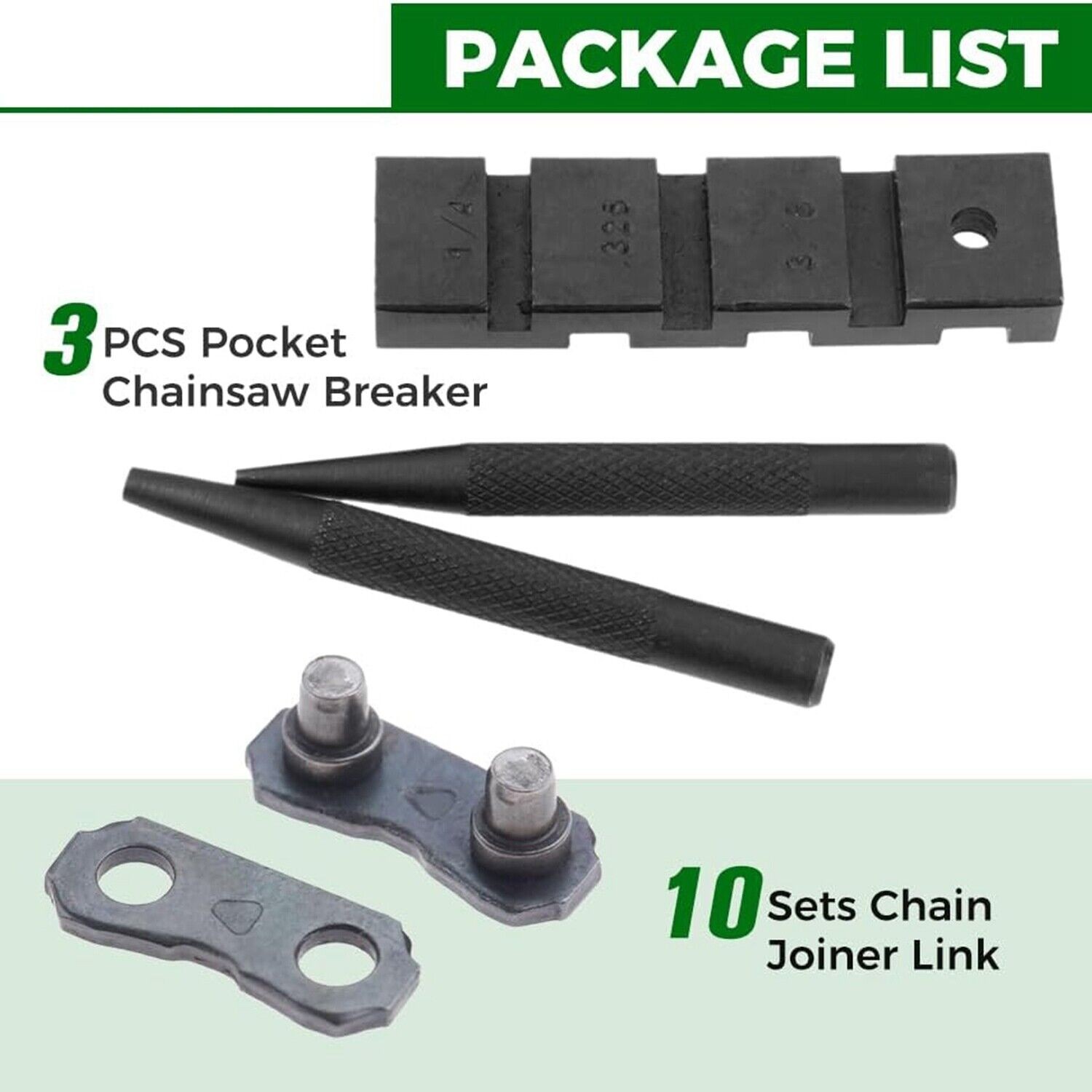 3PCS Chainsaw Breaker Chain Saw Repairing Mending Tool Set with 10 Sets 05345 [Premium Material]Pocket chainsaw punch breaker is made of high-quality Metal and has the characteristics of high strength and high hardness. Chain joiner is made of high-quality metal has a smooth cutting performance and will stay for longer. [Wide Application]Professional Chainsaw Chain Repairing Mending Tool Set has great compatibility, Fit for Breaks 1/4inch ,3/8inch LP, 325inch, 3/8inch, and 404inch pitch chain. Stainless steel chainsaw chain joiner link compatible with for JOINING 325 058 chains for chainsaw parts. [Package List]Pocket chainsaw chain repairing mending tool set includes 1 * Chain Riveting Needle + 1 * Broken Chain + 1 * Chain Base + 10 * sets sets of master link repair preset straps. Please confirm the package list, when receiving the goods. [Easy to Use]Chainsaw chain breaker kit perfect practical tool, simple and convenient operation, effective and quick to help you repair chain problems. Please compare the appearance, shape, and size of the chainsaw parts before ordering. [Good Choice] 3pcs pocket chainsaw breaker and 10 sets 325' master links tie straps are convenient and portable and can work well on a variety of occasions, garden work with it can solve most of your chain problems. Colour:black -grey Material:Metal Package Contents: 3 x Chainsaw Breaker 10 Sets x Chain Joiner Link Shipping Policy Payment Method Order Cancel & Returns Policy Contact us About Us Shipping Policy Delivery details -Handling time:We will prepare your order within 1-3 Business Day -Delivery Time: Normally it takes about 8-16 working days to deliver to your addresss. -Note: 1. Please ensure that the shipping address( English Address and Name) and the postcode you provide at checkout and PayPal is accurate. We are not responsible for undeliverable addresses. 2. The delivery time is for reference only.It will be influenced by the flight, holiday, weather, local post or custom passing .But normally we deliver it faster than expected. Payment Method Most of the payment methods are available, Such as Paypal, Payoneer, Credit Card. Within 1 business day of receiving your payment, we will begin processing your order. Order Cancel & Returns Policy -About Order Cancel: Pls inform us if you need to cancel the order within 24 hours. If orders are more than 24 hours and we have already sent the items, it will be difficult for us to cancel the order. So pls contact us in time, thank you for your understanding! -About Order Returns & Exchange: if you receive wrong or defective parts, pls contact us before you take any other actions, We will solve the problems for you and give you a satisfied reply asap. Contact us If you are unsure or have questions regarding the correct part for your car, pls message or email us and we would be more than happy to assist you. To ensure a fast and accurate response pls include your vehicle's year, make, model, and engine size. We will reply all messages within 24 hours. Business Day: From Monday to Saturday, 9:00 am to 6:00 pm (Beijing Time). Our goal is to make sure you are a happy buyer and have a pleasant shopping with us. When you bought our product, if anything unusual happens: Not received the items, or inconsistent with the description, or other reasons make you not satisfied. Please do not leave neutral (or negative) feedback or open case easily, please feel free to write to contact me. We will do our best service to solve your problem!If you contact us via eBay, we will be more than happy to work with you! About Us We have our business in China, since then we have been serving the auto market with a wide range of automotive products and accessories. We are able to provide customers with the most competitive price due to direct dealing with manufacturers; eliminating the middle person. We are mainly offering car switches which are produced by ourselves, we also offer a lot of auto parts such as sensors, door handles, idel valves, seat heaters which we get from our cooperated factories. On Sep 16, 2025 at 09:15:54 PDT, seller added the following information: On Oct 23, 2025 at 09:48:10 PDT, seller added the following information: