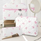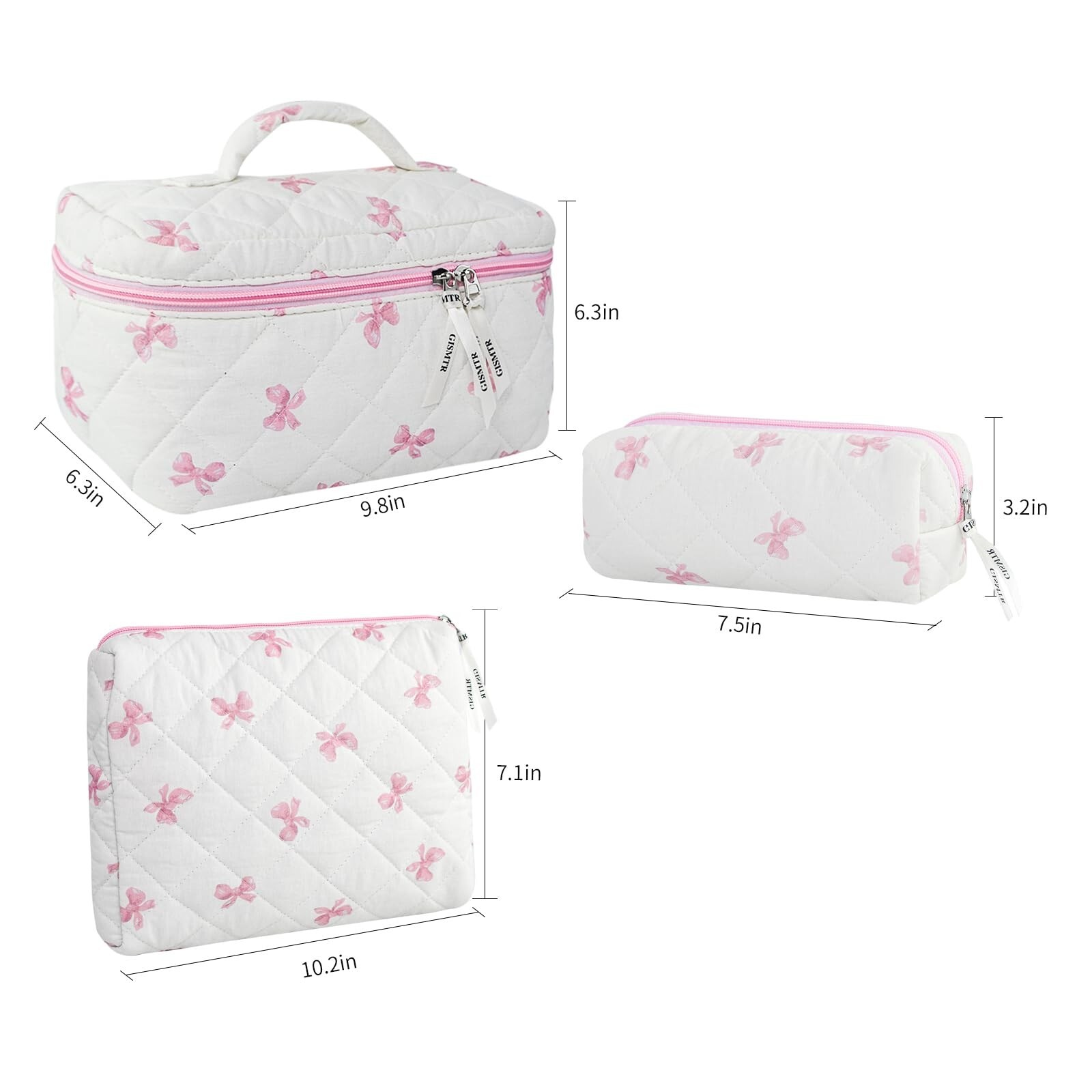 3PCS Makeup Bag Set, Cute Quilted Floral Cosmetic Bag, Large Travel Aesthetic Make up Bag, Coquette Makeup Pouch Toiletry Bag for Women Girls Product Details Color: Pink bow 2 Brand: GISMTR MPN: Does not apply UPC: Does not apply EAN: Does not apply Product Dimensions: 9.84 x 6.3 x 6.3 inches Item Weight: 8 ounces Department: Women Country of Origin: China PREMIUM MATERIAL: The travel makeup bag is made of high quality cotton fabric, which is not only soft and comfortable to touch, but also very easy to care for. The zipper is smooth and durable for easy access. UNIQUE DESIGNWe removed the strange woven label on the bag to make the cosmetic bag more beautiful. At the same time, we added ribbons to each zipper to make it more convenient. PERFECT SIZE: There are 3 pieces of coquette makeup bags in the package, Large: 9.8"x6.3"x6.3" Medium: 10.2"x7.1"x3" Small: 7.2"x2"x3", The spacious makeup bag set can hold all your cosmetics, make up tools, toiletries, or travel essentials. KAWAII DESIGN: Our cosmetic bags have a variety of cute prints, such as bows, florals, bears, etc. The quilted design makes it more fashionable. A LOVELY GIFT The quilted cosmetic bag set is very cute and is suitable as a gift for your loved ones on Christmas, Valentine's Day, birthdays, Teacher's Day and other festivals.
