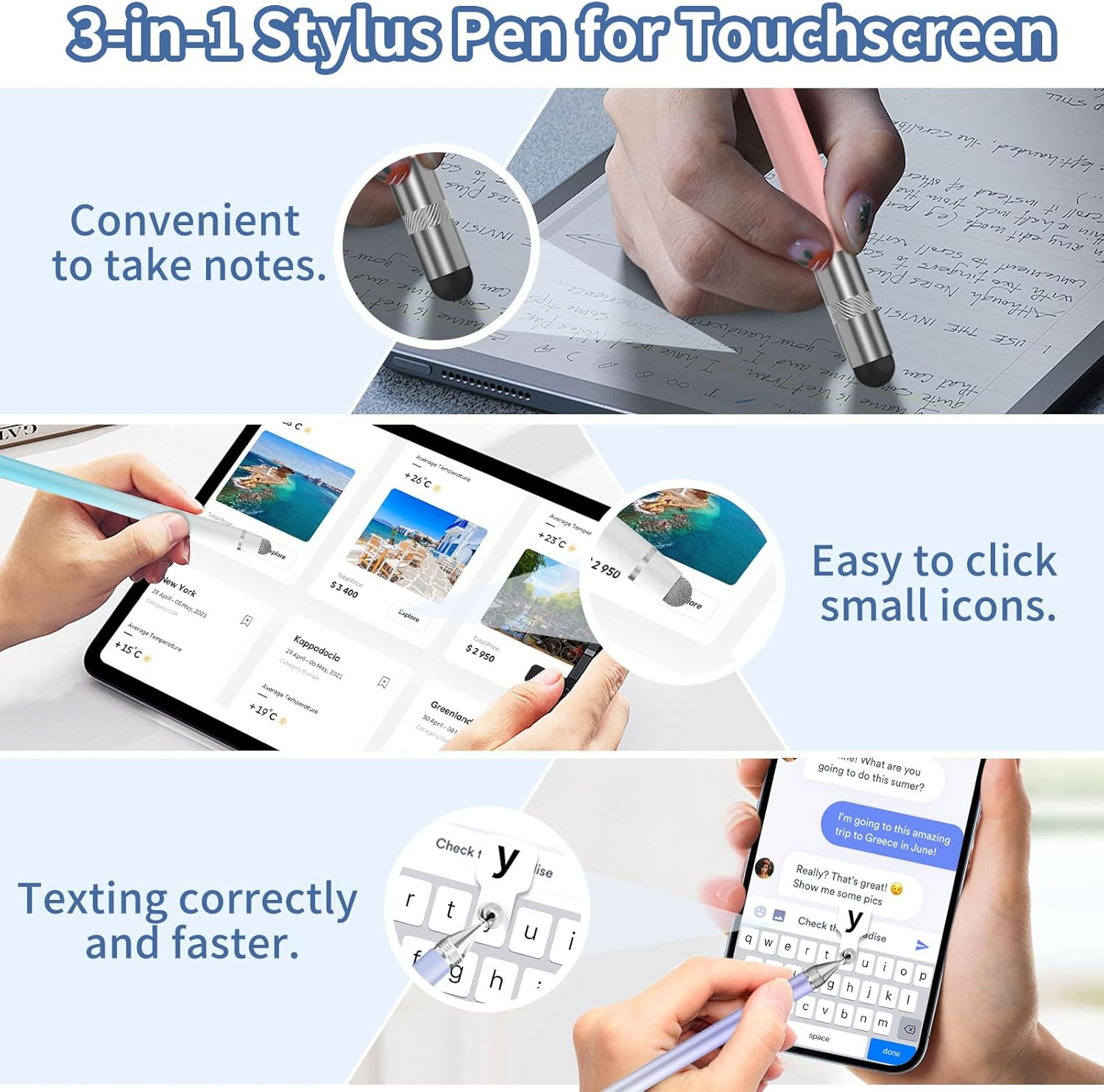 Stylus (3 Pcs), 3-In-1 Stylus Pen for Touchscreen, High Precision and Sensitivity, Compatible with Iphone/Android Tablets and All Touch Screens [3-in-1 Stylus Pen] The stylus pen for touchscreen comes with two different sizes of rubber tips and a transparent disc tip at one end, allowing you to see the precise pointing position on the screen. Whether it's drawing, writing, or gaming, it can easily handle all tasks [Broadly Compatible] Seamlessly compatible with all capacitive touch screen devices, including iPhone, Apple iPad, Android, Samsung Galaxy, Notebooks, Tablets, Chromebook, Microsoft Surface, and more. Experience the freedom to create across various platforms with ease [Easy to Use] Our iPad stylus pen offers effortless usability, allowing you to unleash your creativity anytime, anywhere, without the hassle of Bluetooth pairing or charging. Seamlessly capture inspiration, sketch out ideas, and make your workflow feel completely natural. If you encounter any difficulty using our iPad stylus, please ensure that you haven't inadvertently connected to another stylus via Bluetooth [Quality Stylus Pen] This stylus is lightweight, ergonomically designed for comfortable holding, constructed from aluminum alloy, Engineered to effortlessly navigate screens without leaving a single scratch, they also feature advanced fingerprint-resistant surfaces, ensuring a consistently sleek appearance [Better Than Finger] Our stylus pen provides a finer touch than fingertips, enabling more precise interaction with small touchpoints like keys on touchscreens. With its upgraded tip, you'll never struggle with bulky finger interference again Product Description 2024 Unique 3-in-1 Stylus Pen for Touchscreen Flexible 180° Writing Angle Easily adjust to different writing angles with flexibility on the screen. Important Instructions 1 Prior to using the stylus on your device, please ensure both the device screen and the disc are clean, as the disc is made of conductive hard plastic. Dirt may adhere to the disc, resulting in reduced sensitivity and, in some cases, even scratching the screen. 2 While our stylus typically does not scratch touch screens, we still recommend using a screen protector on your device to safeguard against any potential damage or scratches caused by dirt on the disc/screen, damaged tips, or rare instances of defective products. 3 If you suspect any damage to the disc, please discontinue use immediately, as a damaged disc may scratch the screen. 4 DO NOT remove the plastic disc at the end of the tip, as this will render the tip unusable. Despite its unusual appearance, this part of the tip is essential for conducting and receiving signals from the screens. Batteries Required? No Are Batteries Included No Color White Blue/White Pink/White Purple Material Aluminum Country of Origin China Compatible Devices All Touch Screens, Tablet, Smartphone Item Weight 1.44 ounces Package Dimensions 8.46 x 2.01 x 0.55 inches 2.01 inches x 8.46 inches x 0.55 inches. Weight: 1.44 oz Shipping from the USA All of our products are shipped from the USA, ensuring quick delivery to your destination. Payment We offer the following payment methods: PayPal, credit card, bank transfer, and eBay's secure payment system. Free Shipping & Free Returns Shipping within the USA is FREE. Additionally, any return is absolutely free for you. Risk-Free Purchase You have the option to return an item within 30 days without any justification. We cover the return shipping costs! Fast Shipping We ship immediately upon receipt of payment. Generally, the package is delivered within 2-3 days in the USA. If it takes longer, we will contact you. Quality and Costs Made in Europe, USA, China No customs fees or additional charges Total satisfaction guarantee Invoice with declared VAT available upon request in .pdf format Feedback Your feedback is very important to us. After you pay for your purchase, you will automatically receive positive feedback from us.