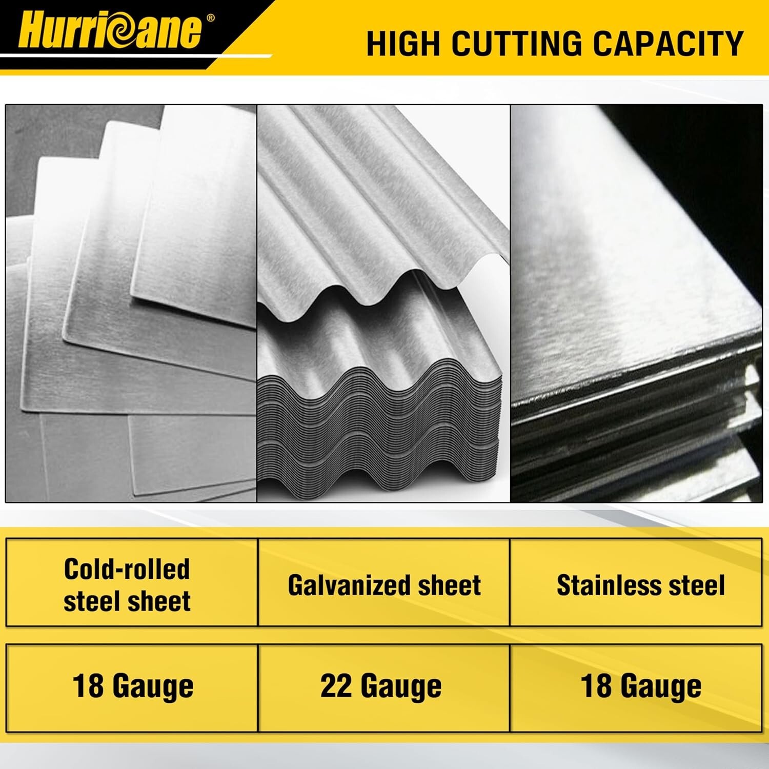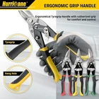 High Durability: Chromium-vanadium steel, serrated edge blade with polished finish for maximum strength, durability and long service life Contain Content: 10 Inch Aviation Tin Snips. 3 Pack, Yellow Straight Cut, red Left Cut, green Right Cut. Came with a Storage Hang Bag that can be easily carry out Cut Capacity of Tin Snip: With a cutting thickness range up to 18 gauge (1.2 mm) cold-rolled steel sheet, 18 gauge (1.2 mm) Galvanized sheet, and 22 gauge (0.7 mm) stainless steel Comfortable Grips: Ergonomical Tyregrip Handle with rubberized grip for comfort and control Safety and High Efficiency: Locking latch prevents damage to cutting edge when stored. Spring-assisted latch on metal snips for fast one-handed operation Tips- Please always wear gloves when you’re working Product Description HURRICANE 3 pc Aviation Tin Snips Set Straight, Ergonomical TyreGrip Handle Cut Capacity of Tin Snip