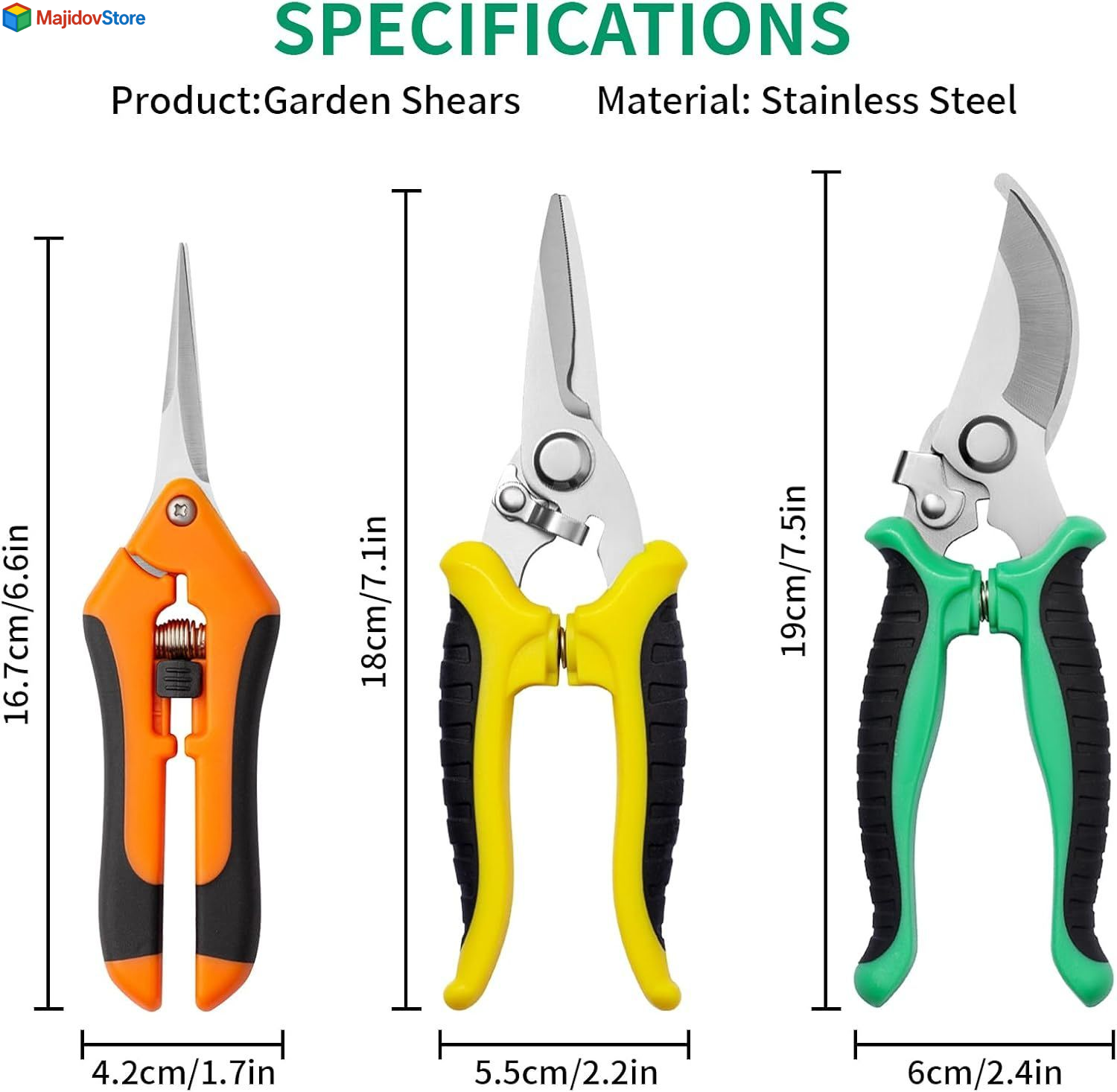 Garden Pruning Shears 3 Pack Gardening Scissors Multicolor Description Features: 【ANTI-SLIP HANDLE DESIGN】: The two-color anti-slip handle of the fruit pruning shears is ergonomically designed made of high purity PP+TRP secondary injection molding. Garden Pruning Shears handle is comfortable to grip and save energy. Garden shears has strong toughness and strength, which provides a strong grip and toughness for long-term use. 【User-friendly Safety Lock】: Our garden shears have a safety locking mechanism to keep the sharp blades securely closed when not in use. After use the garden clippers, just close tightly and push on the latch, which can effectively reduce accidental injuries. This is a wonderful design of gardening supplies. 【SHARP CUTTING OF GARDEN SCISSORS】: This set of gardening shears is made of high quality stainless steel with good anticorrosion performance, heat treatment process, high blade hardness, more sharp and sturdy. You can easily to cut without damaging the vital stems and branches of your plants. Garden pruners is a good helper for your garden tools. 【PRECISION CUTTING】: Gardening scissors with ultra-sharp stainless steel blades are able to make precise cuts without damaging other plant parts when dealing with gardening work, more suitable for pruning trees, flowers, herbs, flowers, hydroponics plants, potted bonsai, houseplants, etc., gardening scissors set is designed to make your pruning work easier and more efficient. 【WIDELY USED】: Our pruning shears set include 3 different blades for a variety of general pruning work. Great for trimming flowers, plants, bonsai, hydroponics, herbs, light branches and so on. Garden shears are ideal for pruning needs and perfect gift for gardening friends. 【NOTE】: The blades of gardening scissors are very sharp, should be placed where children can not reach. Product Details: Brand: Drametic+ Color: Multicolor Style: Classic Blade Material: Stainless Steel Handle Material: Plastic or Rubber Blade Edge: Asymmetrical, Straight, Serrated Blade Type: Bypass Hand Orientation: Ambidextrous Point Style: Round point Manufacturer: Drametic+ Item Weight: 11.3 ounces Package Dimensions: 7.56 x 6.14 x 0.71 inches Country of Origin: China Item model number: scissors Material: Stainless Steel Item Package Quantity: 1 Included Components: Scissors Batteries Included?: No Batteries Required?: No Brand: Drametic+ Color: Multicolor Style: Classic Blade Material: Stainless Steel Handle Material: Plastic or Rubber Handling We will ship all orders within 2 business day of payment. Delivery We Do Not Ship Outside of the Continental US. Return Policy All items qualify for returns within 30 days of receipt. Buyer is responsible for return shipping on any item that is not damaged. Feedback We take our reputation seriously, we buy and sell online, so we understand the value of trust. If you are unsatisfied with your order, please contact us and we will work with you to resolve it to your satisfaction.