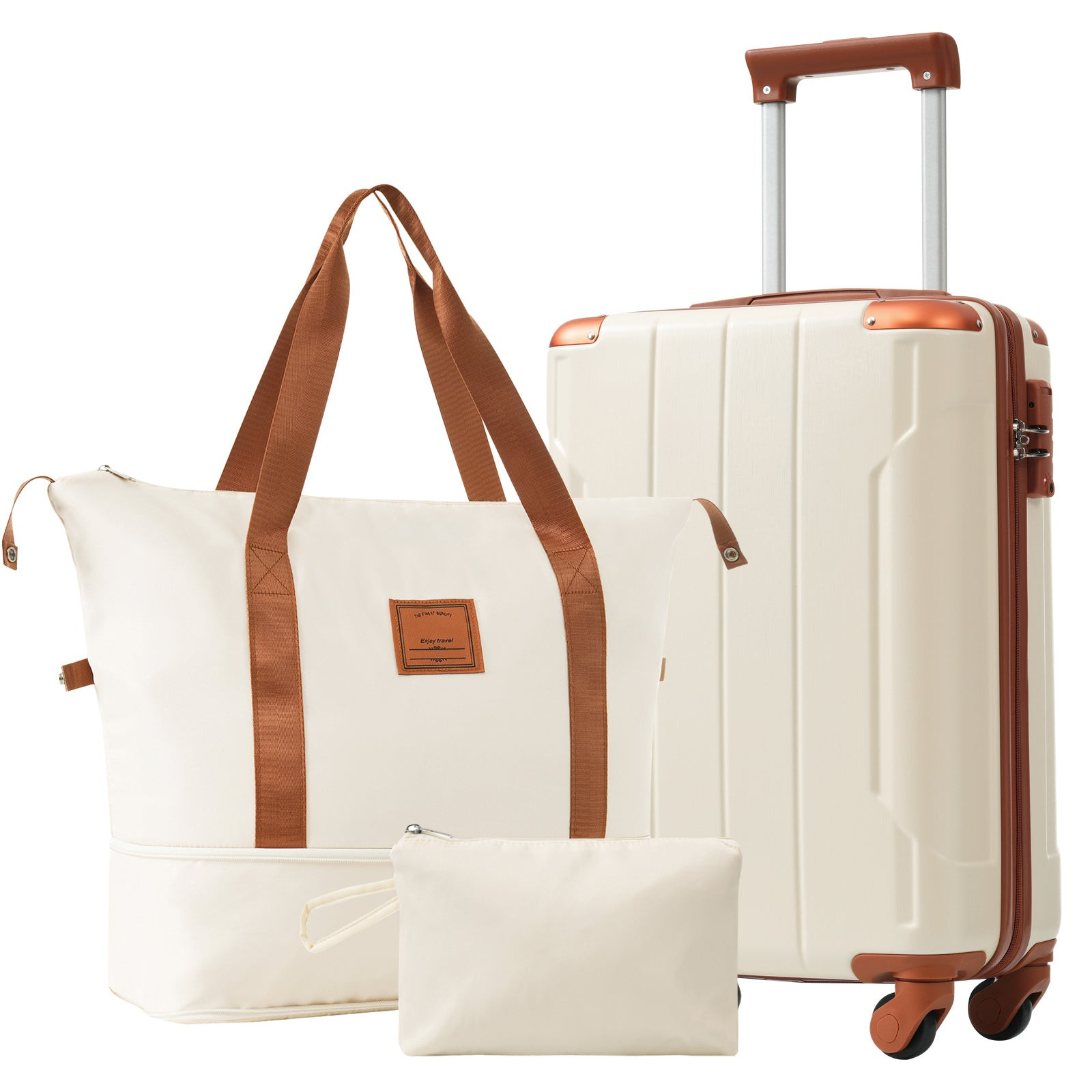 This hardshell luggage set is a game-changer for travelers! The sleek brown and white ABS design is stylish yet durable, and the 3-piece combo (carry-on, duffel, and toiletry bag) covers all packing needs. Love the TSA lock for security and the trolley sleeve makes moving through airports a breeze. The adjustable handle and zippered pockets add convenience, while the lightweight build keeps things easy to maneuver. Perfect for short trips or as a supplement to checked baggage—highly recommend for hassle-free travel!
