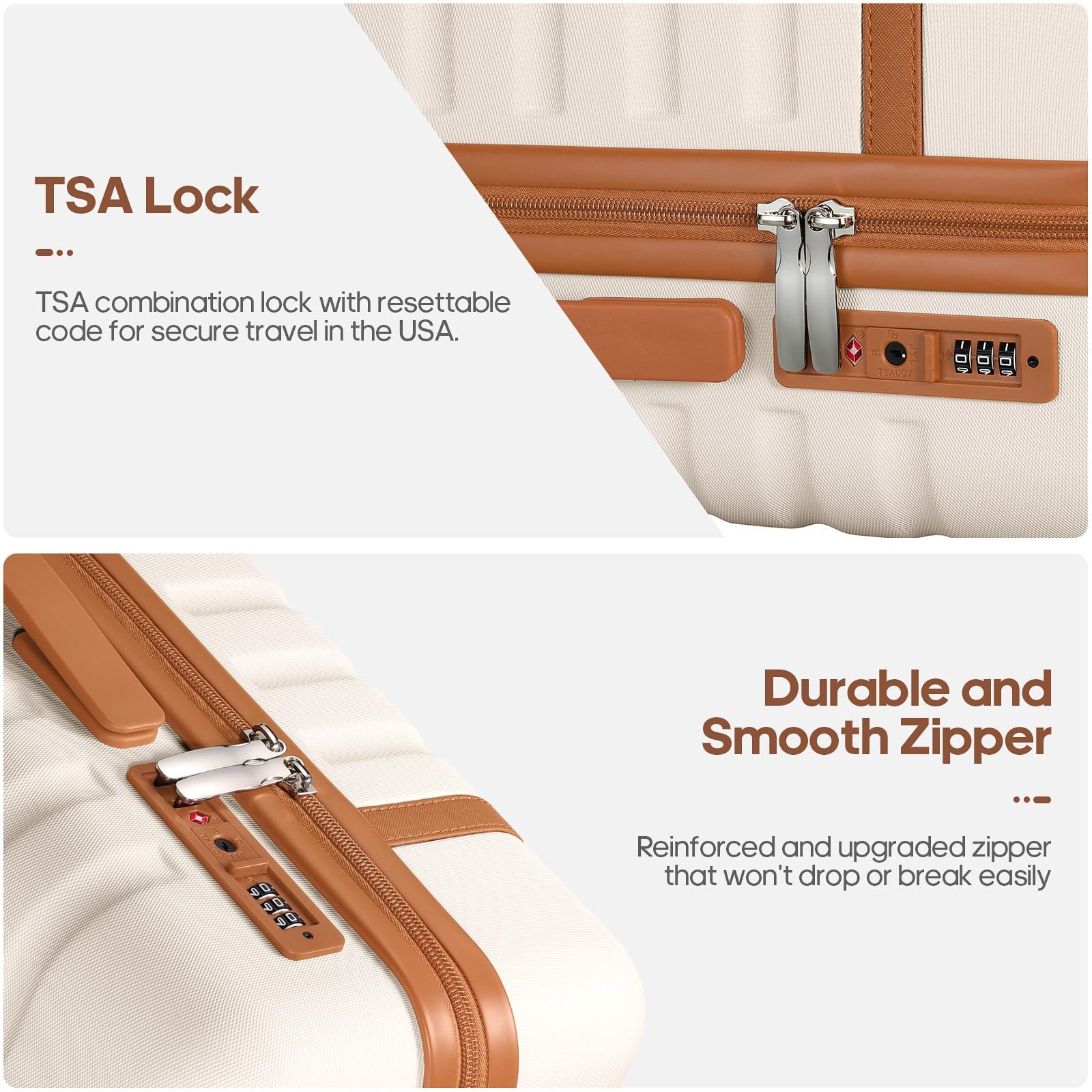 Luggage Set with Backpack : luggage set includes 20 inch carry on luggage, a 18 inch travel backpack and a toiletry bag. The Carry On Suitcase with wheels is sized to fit in overhead bins or underseat. The travel backpack is designed with a back sleeve that attaches to a retractable luggage handle. Large capacity and fully equipped to meet your different travel needs. Easy to Maneuver : Silent Dual Spinner wheels rotate 360°, providing superior maneuverability and a smooth glide in every direction. Thanks to the smooth-rolling wheels of suitcase, even when fully loaded, it's a breeze to maneuver through crowded airports and busy streets without feeling fatigued or strained. TSA Lock and Alloy Zipper :The Built-in TSA lock does not have to be forced open and damaged during inspection. It ensures the safety of your valuables and facilitates your passage through security. The alloy zippers allow travelers to effortlessly open and close their luggage, which adds a safety and convenience to the entire trip. Magic Large Space : Interior zippered divider panels keep contents separated and secure. One compartment of luggage with cross straps to keep your things in place and one fully enclosed with a zippered panel, mesh bags and dry&wet separation bag for easy organization,and the travel bag has multiple functional pockets to meet different travel needs. Hardshell Suitcase : 20inch Carry on luggage is crafted from Polycarbonate (PC) exterior offers extreme durability with a texture that reduces the visibility of scratches. Details such as the ergonomic 3-level retractable easy-grip top handle, and the double soft rubber carry handles bring maximum comfort and an easy carrying experience.