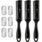 Package includes: 3 pieces razor comb, 10 pieces razorsuff0cadopt quality stainless steel blade, make it can be applied for longer time; Dual side cutting scissors, double edge razor blades Size: the comb cutter is about 17.5 x 3 cm/ 6.89 x 1.18 inch, the haircut blade comb has a comb side and a trimming side with 2 razors Easy to use: the hair thinning comb blades can be replaced, both sides can cut off hair, one side teeth, one side sparse; Smart diy tool at home, convenient to use and portable to carry Function: the hair razor combs are applied to shorten, shape, and thin the hair, the safety shielded razor protects skin from being scratching Note: razor comb with extra blades, this product is pointed and should be handled with care