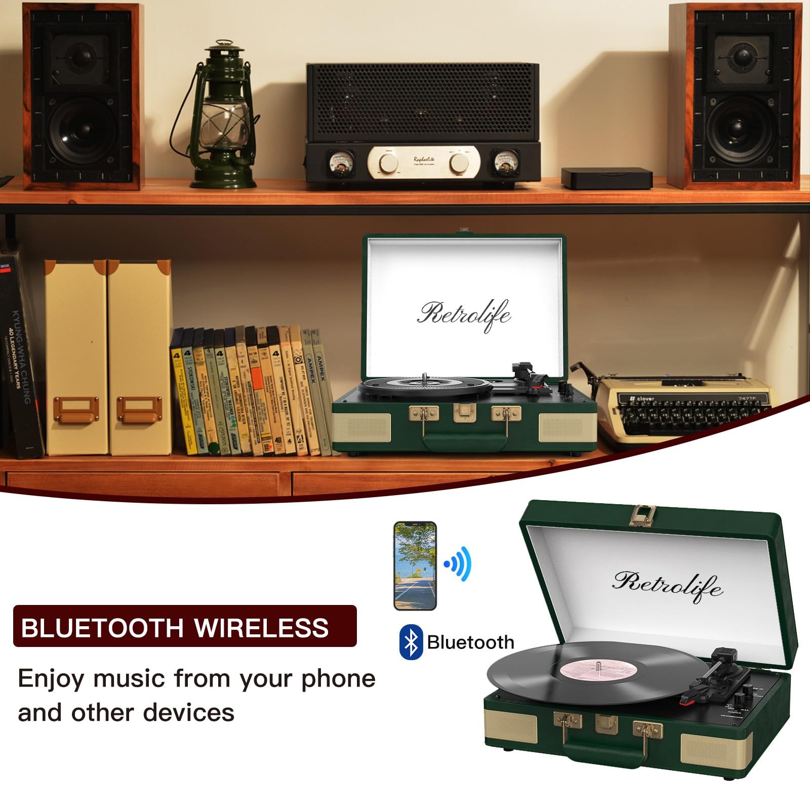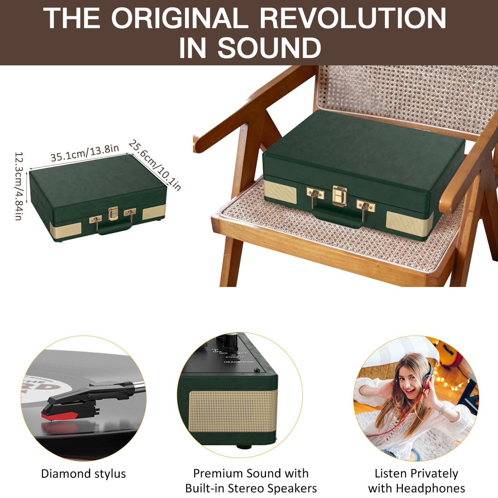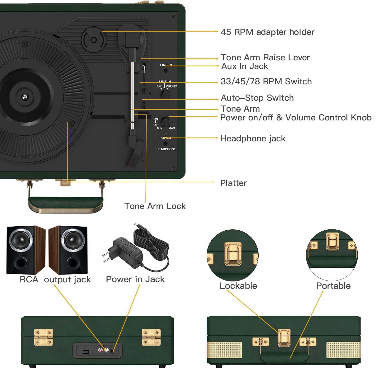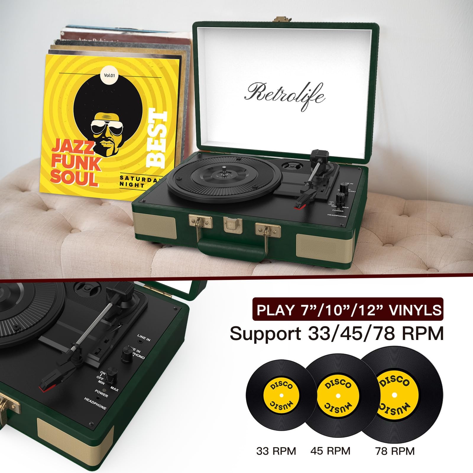 High Quality PU Leather Material: Brown classic PU leather look with vintage metal screws and mesh. Combining retro and modern flexible design with a sturdy portable handle, you can listen to your music anytime, anywhere High Quality PU Leather Material: Brown classic PU leather look with vintage metal screws and mesh. Combining retro and modern flexible design with a sturdy portable handle, you can listen to your music anytime, anywhere Belt Driven Three-Speed Turntable: This three-speed (33 1/3, 45, 78 RPM) portable turntable features premium upgraded sound quality. It also supports 3 sizes of vinyl records, 7/10/12 inches. If you have records of multiple sizes, try our portable record player instead, which can meet your diverse size needs Four Advanced Connection Options Available: Music playback through turntable's built-in Bluetooth speakers. Connect external speakers via the RCA output. The Aux-In line is used for devices such as MP3 and smartphones. For personal listening, connect your headphones to the headphone jack 2 Built-in Stereo Speakers & Auto-Stop Function: Our turntable has two built-in 3W stereo speakers to provide premium sound quality. The auto-stop function can automatically stop the record from spinning when recording ends, avoiding the risk of your beloved record being scratched Aux-In and Rca Out: This Vintage Record Player comes with an AUX-IN port. The RCA connected to the Line Out ports allows you to connect your turntable to your external amplifier, enabling you to enjoy music in more ways