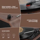 Vintage style record player with multiple functions Retro-styled record player with modern features, including Bluetooth connectivity, FM radio, and USB/TF card compatibility. Effortless operation with no setup required, accommodating all sizes of vinyl at 3 speeds, enhanced by an easy-to-use LED screen. Wireless Bluetooth capability for seamless music streaming from mobile devices, and the option to connect with Bluetooth speakers for an alternative audio experience. Versatile audio input options, such as aux in, USB, and TF card playback, with the ability to digitize vinyl tracks onto USB drives and TF cards for long-term preservation. Upgrade from traditional turntables, boasting dual stereo built-in speakers for visually appealing and sonically balanced sound delivery.