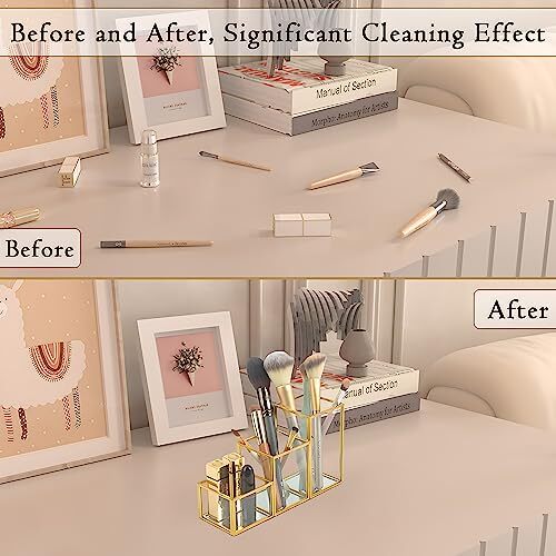 This gold-accented glass makeup organizer is both stylish and functional! The three graduated compartments keep brushes, liners, and tools neatly separated while adding a chic touch to any vanity or bathroom. The sturdy glass construction feels luxurious, and the compact size fits perfectly in small spaces. Super easy to clean and looks way more expensive than it is—love how it keeps my makeup area clutter-free!