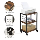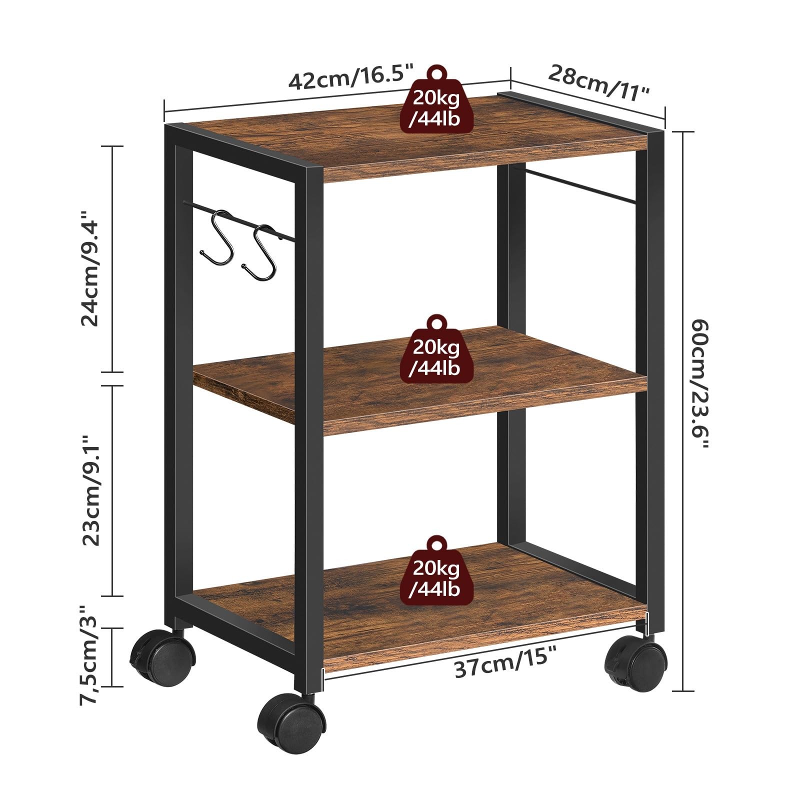 Your deskside space and the space next to the desk will become more organized with it. You can keep everything you need in order on this sofa side table. Installation is simple, and you can switch it between the printer stand with wheels and the side table at will to meet your daily needs. Specifications: Color: Rustic Brown Material: Engineered Wood, Metal Product Size: 16.5'' L x 11'' W x 23.6'' H Package Contents: 1 x Printer Stand 1 x Accessory Kit 1 x Allen Key 1 x Instructions Notes: Please don't expose the product to direct sunlight or place it in a damp environment. Please keep the product away from sharp, pointed objects and corrosive chemicals. 3-Tier Spacious Storage Printer Stand: Dimensions: 16.5’’ x 11’’ x 23.6’’ (L x W x H). The printer cart with 3 open shelves is ideal for your limited space! Put your office supplies on the stand to free your office from clutter! Muti-functional Printer Cart: The maximum weight capacity of the each shelf is 44 lb, Not only can this printer table be used to hold large office supplies like scanners, copiers or laser printers, but it can also be used as a storage shelf for books, plants, and more. Suitable for home kitchen, living room, office, etc Move or Stay: With 4 foot pads and 4 universal casters, this industrial printer stand can offer you different ways as a stationary table or a rolling cart depending on your needs. 2 wheels can be locked to keep the printer stand still while working Additional Hooks: There are horizontal rails on the side to prevent your items from falling, and the hooks can be used to hang your office folders. Versatile and space-saving, it is the perfect choice for your office storage! Get Rid of Assembly Hassles: Our packaging comes with detailed instructions, you can easily complete the assembly by following the detailed steps in the instructions. The provided instructions will help you stay away from assembly trouble!