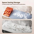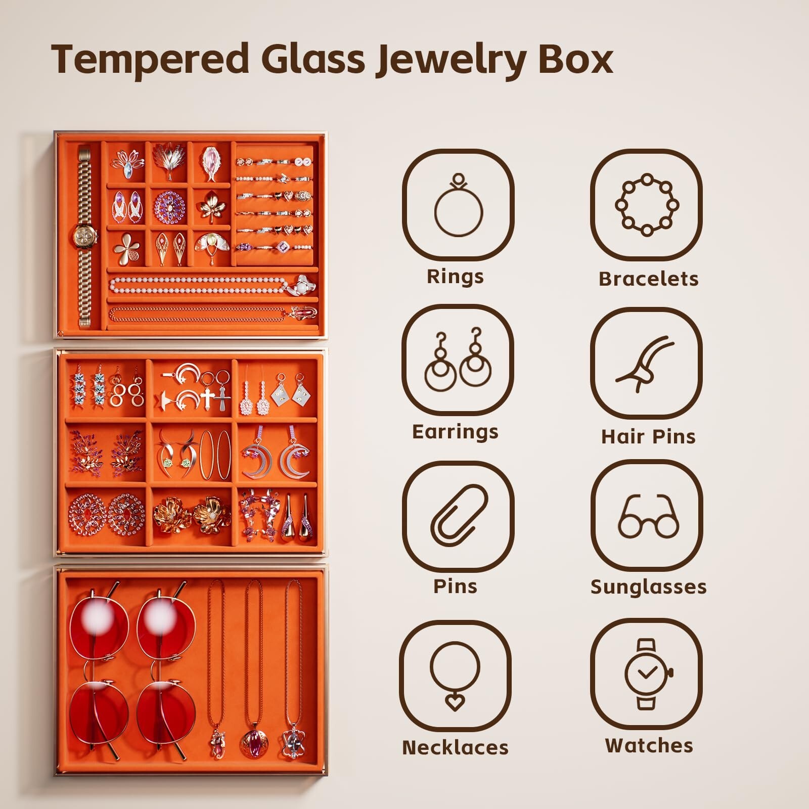 Jewelry Box,3-Tier Large Glass Jewelry Organizer with Velvet Lining and Copper Handles - Ideal for Rings, Earrings, Necklaces, Bracelets, and Watches. Product Details Color: Amber Brand: CoralHouse MPN: SSH1 UPC: Does not apply EAN: Does not apply Color: Amber Brand: CoralHouse Material: Glass Style: Modern Luxury Special Feature: Lined, Scratch Resistant Recommended Uses For Product: jewelry, Necklace, Bracelet, Ring, Watch, Earring, Bangle Product Dimensions: 9.9"D x 7.67"W x 5"H Target Audience: Women, Girls Shape: Rectangular Occasion: Mother's Day, New Year, New Home, Thanksgiving, Valentine's Day Color: Amber Brand: CoralHouse Material: Glass Style: Modern Luxury Special Feature: Lined, Scratch Resistant Recommended Uses For Product: jewelry, Necklace, Bracelet, Ring, Watch, Earring, Bangle Product Dimensions: 9.9"D x 7.67"W x 5"H Target Audience: Women, Girls Shape: Rectangular Occasion: Mother's Day, New Year, New Home, Thanksgiving, Valentine's Day Mounting Type: Table Top Finish Type: Polished Inner Material: Velvet Closure Type: Flip cover, drawer Number of Drawers: 3 Item Weight: 8.2 Pounds Number of Compartments: 3 Warranty Type: Manufacturer Jewelry Storage Type: Jewelry Box Number of Items: 1 Manufacturer: CoralHouse Part Number: SSH1 Item Weight: 8.2 pounds Country of Origin: China Item model number: SSH1 Finish: Polished Item Package Quantity: 1 Special Features: Lined, Scratch Resistant Included Components: Jewelry Organizer Batteries Included?: No Batteries Required?: No Date First Available: January 10, 2024 Versatile Jewelry Storage: This 3-tier jewelry box offers adjustable compartments for storing rings, earrings, necklaces, bracelets, and watches, ensuring your collection stays organized. It's one of the most versatile jewelry organizers and storage solutions available, perfect for women who love jewelry boxes and organizers. Robust Tempered Glass: The jewelry box features a lid made from sturdy tempered glass, providing durability and enhanced protection for your jewelry. This robust design is common in high-quality jewelry boxes for women, ensuring your collection stays safe. Space-Saving Design: The efficient layout maximizes storage space with multiple compartments and a smooth drawer, allowing easy access to various jewelry pieces. This feature is ideal for those looking for jewelry boxes & organizers that save space while keeping everything tidy. Elegant Gift Choice: This velvet-lined jewelry organizer is not only practical but also adds a touch of elegance to any room, making it an ideal gift for birthdays, anniversaries, weddings, and other special occasions. If you're seeking unique jewelry boxes for women, this is an excellent choice. Brand Assurance: CoralHouse is known for its high-quality jewelry boxes, offering reliable customer service and warranty to ensure your jewelry box stands the test of time. This assurance makes CoralHouse jewelry boxes & organizers a trustworthy option for your storage needs. Product Dimensions:9.9"D x 7.67"Wx 5"H.