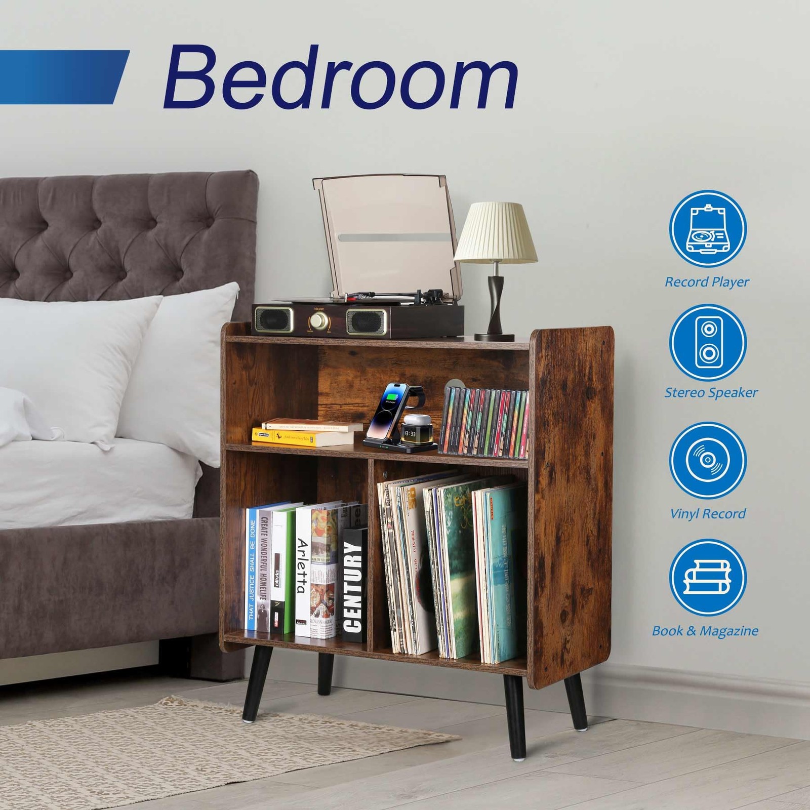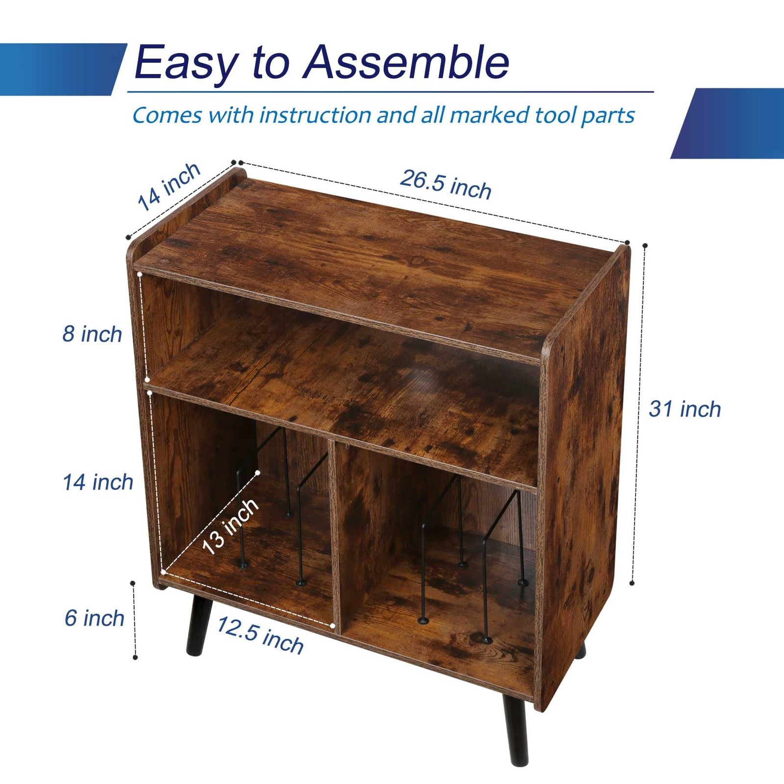 This range of vinyl record storage cabinets, Includes both vintage brown wood grain and modern white wood grain options. Designed to meet your needs and preferences. Also as a projector stand, entry table, you can place it in the office. The retro wood texture shows mid-century style, It matches kinds of scenarios. Clearly visible wood grain, simple and smooth lines can be perfectly Integrated Into various styles of homes. Its flat surface without burrs Is safer to use. [Mid Century Modern Record Player Table] This vinyl record storage table uses a rustic brown natural wood grain design with solid wood decorative legs. It retains the retro wood texture without losing the modern pop style. If you like mid-century design and multi-functional storage space, then this record table with album storage is your best choice. [3 Tier Large Record Player Stand] This record player stand with vinyl storage dimension: 26.5'' L x 14'' W x 31'' H, which can fully accommodate 80 lbs & 100 records. This stylish vintage record stand has four storage areas. The top layer holds the turntable, the middle layer holds audio accessories, and the six metal separator structures on the bottom is designed to sort records, albums and even magazines. [Suitable for Multiple Scenarios] The natural texture of the tall turntable stand highlights a calm and retro atmosphere. You can place it in the living room, bedroom, music room, or office to let music flow through your life. The turntable shelf can also serve as a console table, bookshelf or even a file cabinet. More usage possibilities are waiting for you to unlock. [Sturdy and Durable] This vinyl record storage cabinet is made of MDF board, which is durable and can support your long-term use. And its surface is smooth and burr-free, making it safer to use. The baffles on both sides of the top of the record player display shelf can add an extra layer of protection for your precious record player. [Easy to Assemble] This large record player holder comes with an easy-to-read installation manual and all labeled tool parts, making it easy for you to complete the installation. If you have any questions about our product, please feel free to reach out.