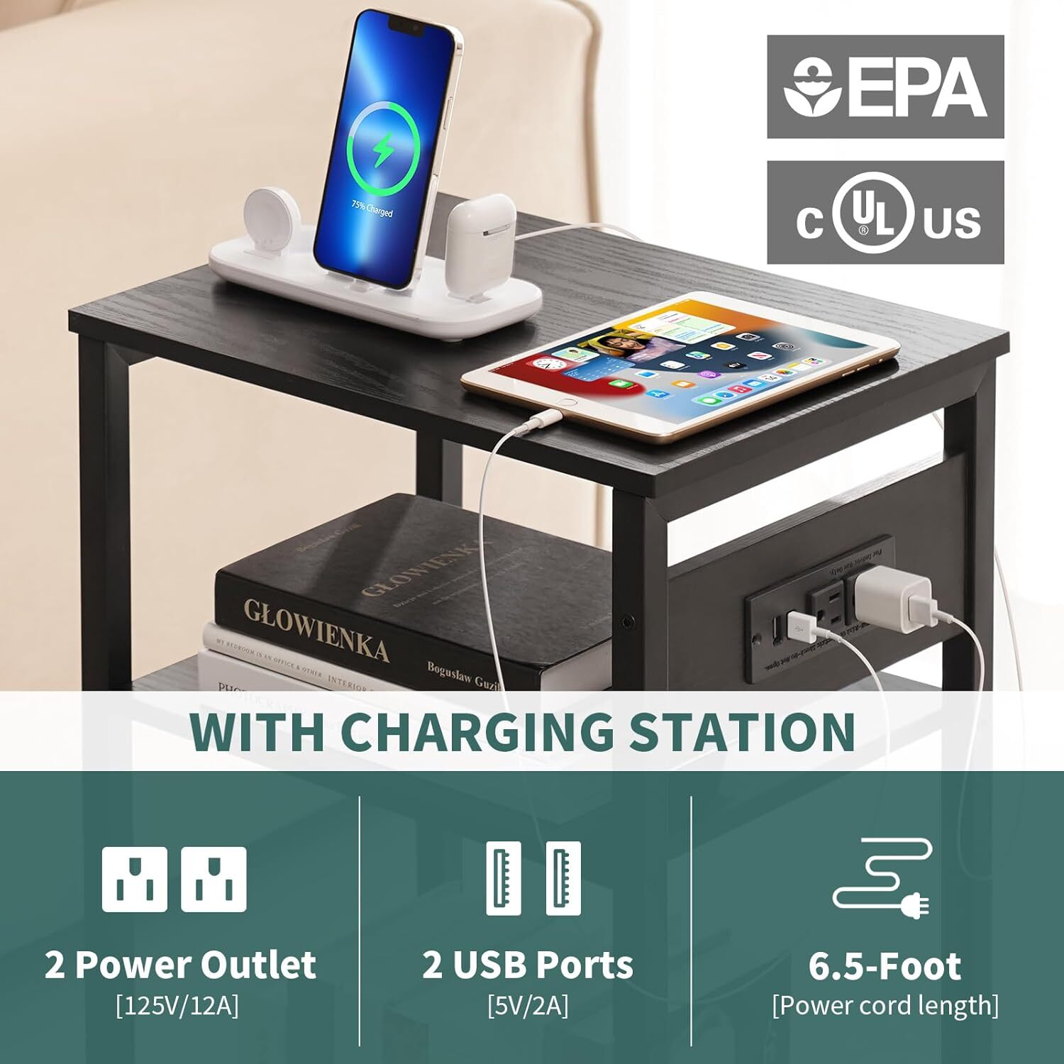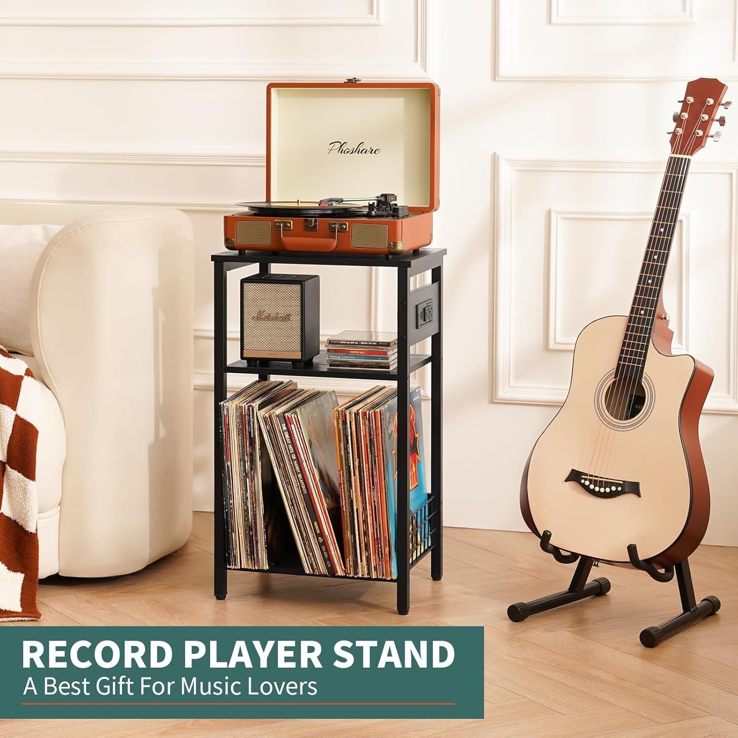 About this item Always by Your Side. Overall Size:15.35"L × 11.81"W ×26.14"H. The 3rd Open Shelf Size: 11.22"W×14.17"H, designed for all kinds of vinyl(7/8/10/12 inch). THREE TIER END TABLES: Elevate your audio journey with the 3 tier record player stand with vinyl storage. The tabletop and 2nd shelf are ample to hold various record players and audio essentials. And the 3rd open shelf features U shape rack for easy access and sorting of vinyl records. Plus, the bedside table is upgraded with side wire mesh to avoid vinyl accident slips. END TABLE WITH CHARGING STATION: The charging nightstands are game-changers. With 2 USB ports and 2 outlets, the small side table can effortlessly connect your record player, speakers, stereo, or other devices without cables chaos. No more struggling with power supply searching. Moreover, it is lightweight to move with ease. VERSATILE SIDE TABLES: Experience unrivaled versatility with our small nightstand. Thanks to the removable U shape rack, it unlocks more storage possibilities for books, magazines, albums or cute trinkets. More than a small table, it also serves as bedroom night stands, side tables living room, small office table or decorative stand to brighten your decor. STURDY & SPACE SAVING: Crafted from sturdy frame and wood board, the side tables bedroom boasts stalwart & lasting support: 100lbs for hard top and 50lbs for 2nd/3rd shelf. Adjustable feet can level to add extra stability. With airy/compact design, the end tables living room seamlessly blends into small space. Let the music flow freely without space constraints!