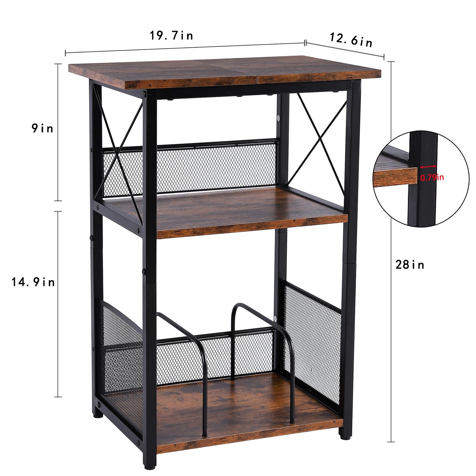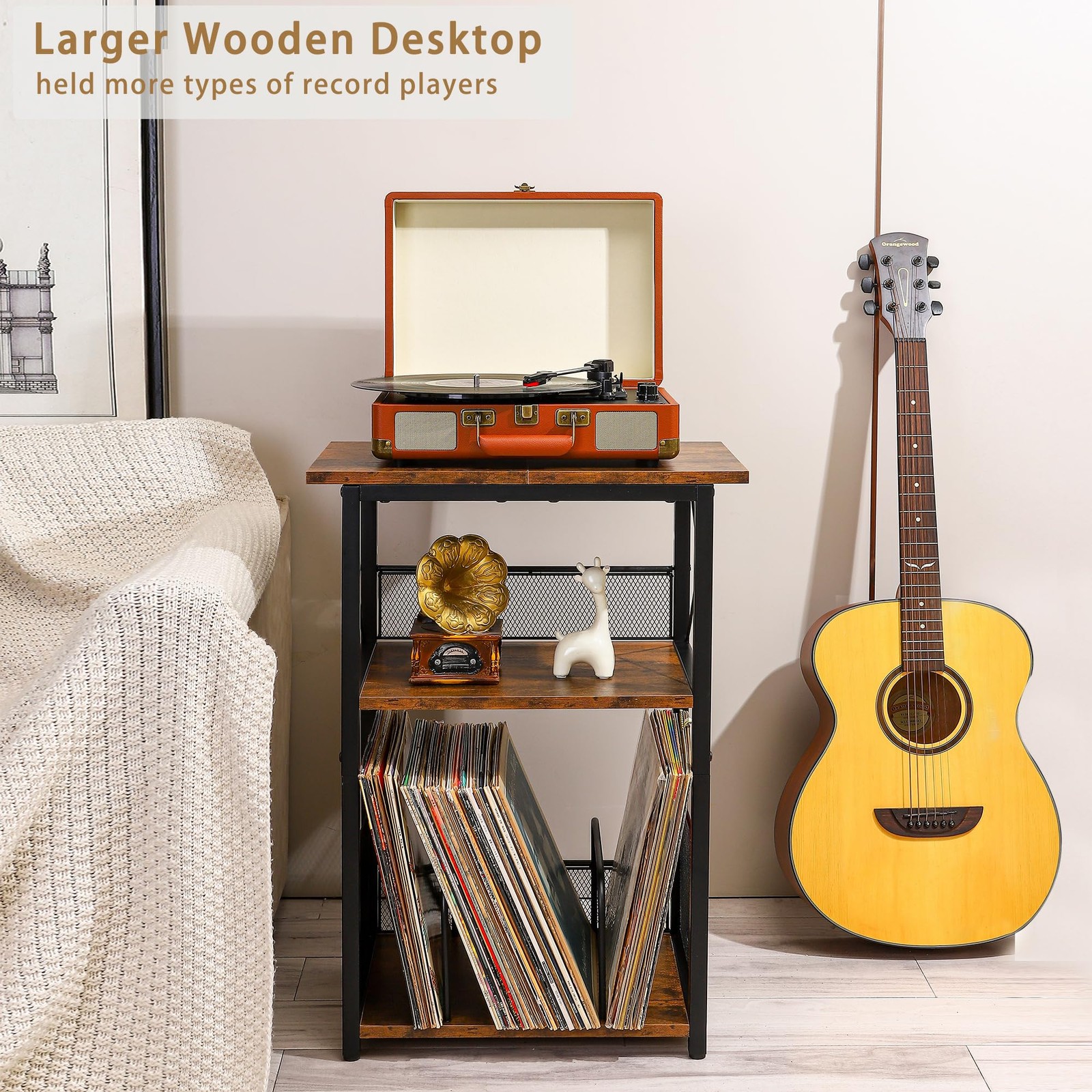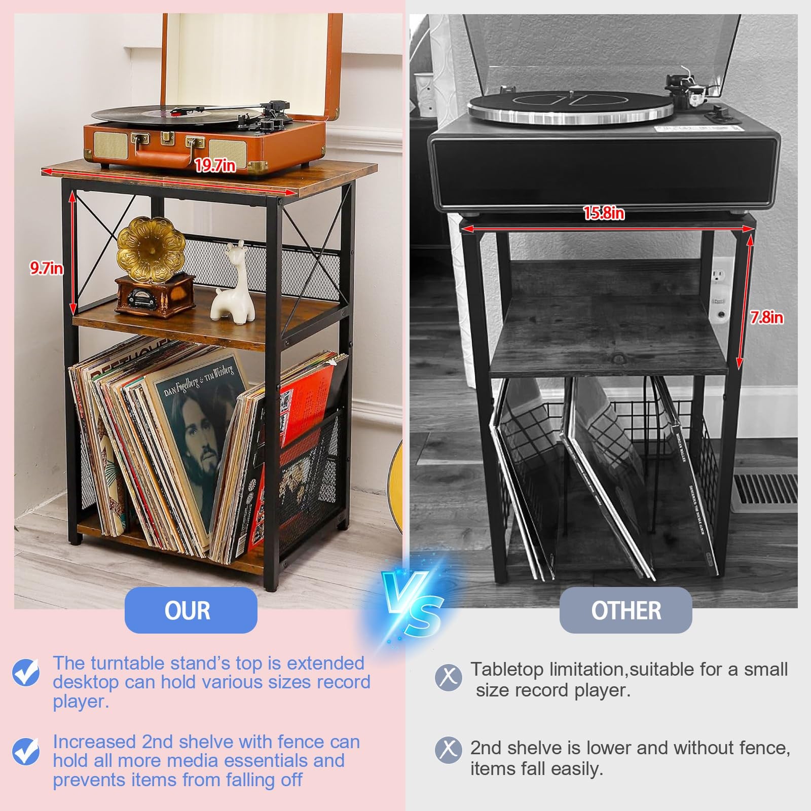 3 Tier End Table,Record Player Stand with Storage Up to 100 Albums,Turntable Stand for Vinyl Tall Side Table for Living Room, Bedroom, Office,Rustic Brown and Classic Black Versatile Use: It not only a record player stand,can be used as a vinyl record storage table,side table, end table, couch table,bedside table for living room, bedroom or study. Material: Engineering wood, Steel Color:Rustic Brown + Black / Classic Black Table Size: 19.7(L) x 12.6(W) x 27.5(H) inches,tabletop (19.7" L x 12.6" W) Package Including: 1 x Record Player Stand 1 x Accessory Kit 1 x Instructions 【3 Tier Record Player Stand】This record player table features a larger tabletop (19.7" L x 12.6" W) suitable for more sizes of record player;With 2 open storage shelves that can hold some media essentials and all kinds of record up to 100 albums.Combines artistry and practicality,offering you a tidy and organized music space 【Versatile Compact Size】This side table is measuring 19.7(L) x 12.6(W) x 27.5(H) inches,can used as a record player table,it's also a good size wine bar table,side table or end table for your living room,bedroom or some small space.Small size,space saving,perfect for put a book,a cup of coffee and store daily essentials within touch,very practical, bring convenience to your life 【Durable and Stylish】This record shelf made of rustic brown engineering wood and matte black metal frame,has an excellent load capacity and stable,ensuring a longer usage.The couch table with a vintage feel and industrial look,make it suitable for various room 【Small Details】This vinyl record player table with metal mesh prevents the records and items from falling off;The removable U-shaped dividers at the bottom allow you to customize your storage space to help organize and easily access your vinyl records. Also come with 4 adjustable feet will help the record player stand stable in any place 【Easy Assembly】This record player table comes with instructions and assembly tools to help you assemble the record display shelf more easier and quicker.If you have any questions during assemble and use, don't hesitate to reach out for assistance