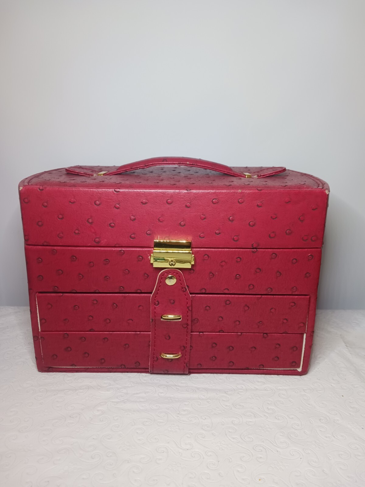 This jewelry box is a stylish and practical travel companion! The brick red leatherette gives it a classy look, and the three-tier design keeps everything organized. Despite minor wear, it's still sturdy and well-made. Love the working key feature—perfect for keeping valuables secure. Compact yet spacious, it’s great for trips or everyday use. Fast shipping too! Highly recommend for anyone needing a durable, elegant jewelry case.
