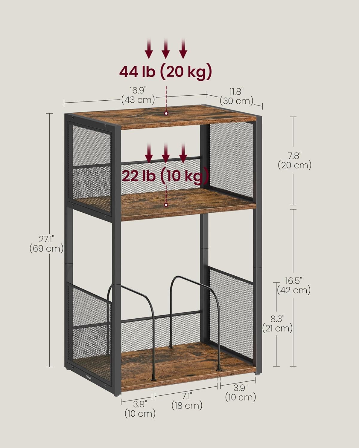 【3-TIER DESIGN】This bedside table features a tabletop for your record player and 2 open shelves that can hold up to 100 albums. Enjoy a tidy and organized music area 【EASY ASSEMBLY】This record player stand comes with detailed instructions and labeled parts, making it a breeze to assemble in just 6 simple steps 【VERSATILE USE】This turntable stand doubles as a side table, making it a versatile addition to your living room, bedroom, or study. Enjoy your afternoon tea or store daily essentials with ease 【STURDY AND STYLISH】Crafted from robust particleboard and steel, this couch table is built to last. The combination of rustic brown and black colors creates an industrial look, adding a touch of vintage charm to your decor 【THOUGHTFUL DETAILS】The dense mesh prevents items from falling off, while the removable U-shaped dividers at the bottom allow you to customize your storage space to fit your needs