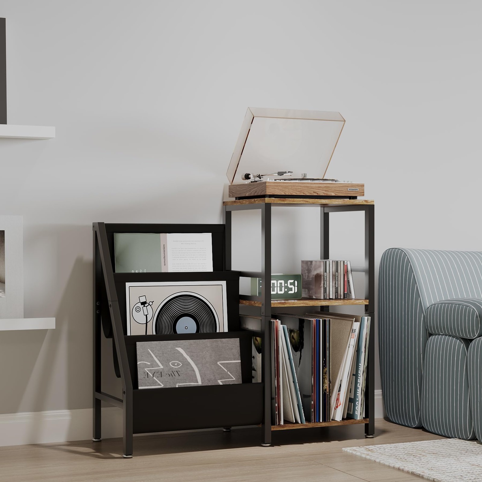 This turntable stand is a game-changer for vinyl lovers! The vintage brown finish adds a stylish touch to any room, while the three-tier storage holds up to 200 albums—perfect for organizing my collection. Sturdy construction keeps my record player secure, and the display shelf showcases favorite albums beautifully. It’s both functional and a great-looking addition to my living room!