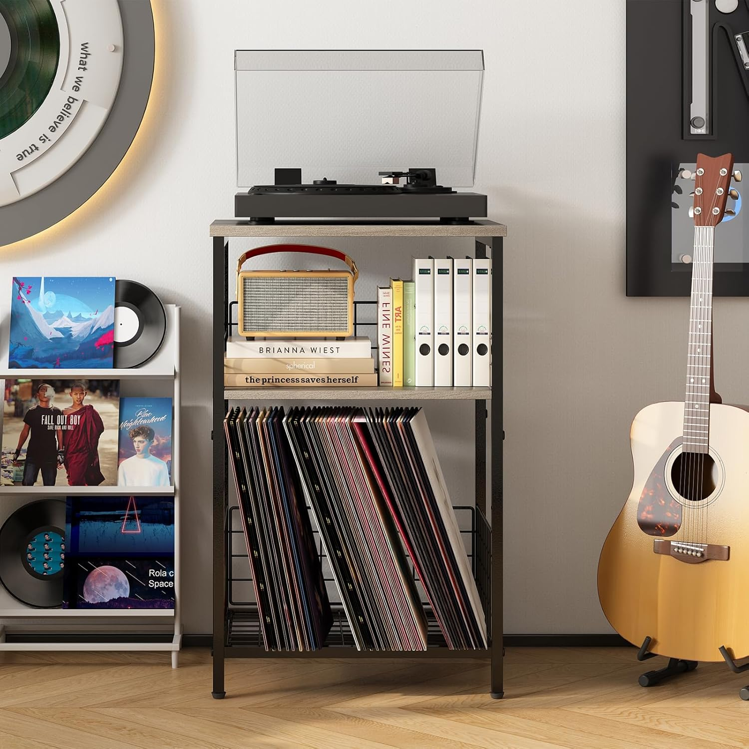 Store New Arrivals Add to Favorite View Feedback Contact Record Player Stand with Storage Up to 100 Albums, 3 Tier Vinyl Record Storage for Living Room, Turntable Stand with Record Holder & Display Shelf(Patent Pending)(Greige & Black) Description Room Type Living Room Number of Shelves 3 Item Height 25 inches Item Width 15.75 Inches Color Greige with Record Storage Material Type Ironwood Item Dimensions D x W x H 11.81"D x 15.75"W x 25"H Material Ironwood Required Assembly Yes Item Weight 11 Pounds Recommended Uses For Product Record Player Stand, Side Table, End Table Shelf Type Tiered Shelf with Wire Rack Additional Features Adjustable Shelf Special Feature Adjustable Shelf Product Dimensions 11.81"D x 15.75"W x 25"H Style Name Retro Included Components Assembly Guide, Installation Tool Shipping Fast shipping USA 【3 Tier Record Player Stand】This vintage-inspired stand features 3 tiers, including a spacious tabletop suitable for various record player sizes. Further, the 3rd open storage shelves can hold up to 100 albums.【Warm Tip】If the bottom is used for records, don't install the front wire fence. 【Patent Pending】【Versatile Use】This record stand not only can be used as a vinyl record stand, but also can be used as a end table side table night stand in your living room. The industrial retro end side table will greatly lighting your whole room! Save more space for you. 【Two Installation Options Available】In addition to use as a record storage, there is another way to use it for end table or side table. The top and middle open smooth shelf gives sufficient storage place for storing and displaying. And the bottom wide U-shape iron wire basket for easy access and can storage snacks, cans or other stuff you want to put inside. 【Sturdy and Durable】High-end durable powder-coated metal frame to resist rust, high-quality thickened easy cleaning wooden board offer stable support and ensure years of use. 【Easy to Assemble】Come with instruction and all necessary hardware included, you will never get stuck with the assembly jobs for this record holder. Product dimensions: 15.75"L x 11.81"W x 25"H. Product Description Record Player Stand with Storage Vinyl Record Storage for Living Room Record Player Stand with Vinyl Storage Turntable Stand with Record Holder Functional Craft Details Multiple Colors Available Add to Cart Add to Cart Add to Cart Add to Cart Add to Cart Add to Cart Customer Reviews 4.6 out of 5 stars 3,194 4.6 out of 5 stars 3,194 4.6 out of 5 stars 3,194 4.6 out of 5 stars 3,194 4.6 out of 5 stars 3,194 4.6 out of 5 stars 3,194 Price $33.99 $ 33 . 99 $29.99 $ 29 . 99 $29.99 $ 29 . 99 $33.99 $ 33 . 99 $27.99 $ 27 . 99 $33.99 $ 33 . 99 Color Rustic Brown & Black Brown & Black Greige & Black Black Rustic Brown Rustic Brown with Outlets Size 11.8"D x 15.7"W x 25"H 11.8"D x 15.7"W x 25"H 11.8"D x 15.7"W x 25"H 11.8"D x 15.7"W x 25"H 11.8"D x 15.7"W x 25"H 11.8"D x 15.7"W x 25"H Shape Rectangular Rectangular Rectangular Rectangular Rectangular Rectangular Top Material Engineered Wood Engineered Wood Engineered Wood Engineered Wood Engineered Wood Engineered Wood Frame Material Metal Metal Metal Metal Metal Metal Assembly Required ✔ ✔ ✔ ✔ ✔ ✔ RETURNS We offer a 30-Day Return Policy on items which you are not completely satisfied with. You have the option for a full-refund or an exchange of the item. No returns are available on items shipped outside of the USA. PAYMENT We accept PayPal. CONTACT US This page content is yet to come Please ad us to your favorite seller and visit again later Thank You CUSTOMER SATISFACTION We try our very best to make sure every customer is completely satisfied. If there's a problem, message us! We're happy to help.
