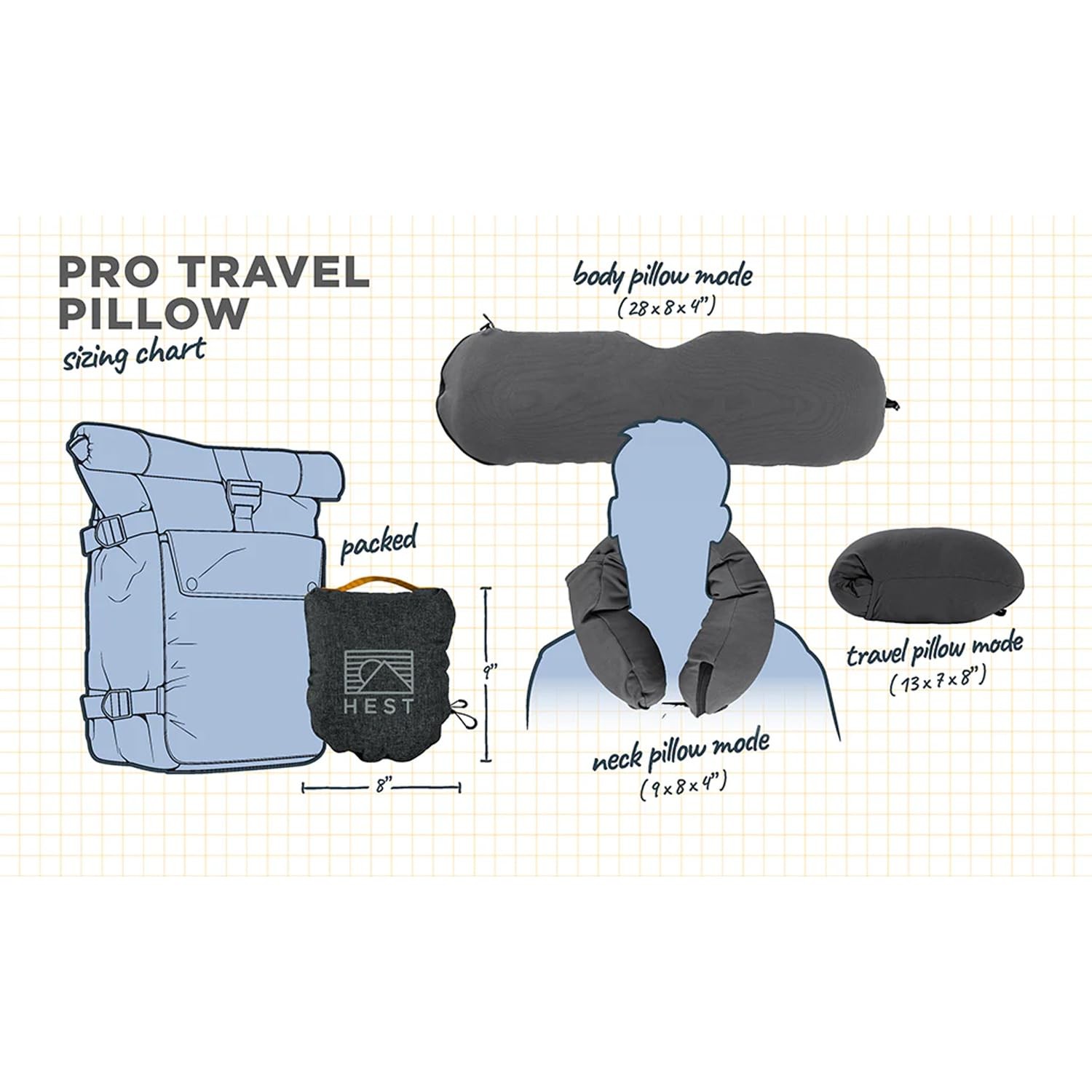 Intelligent sleep design for any way you travel. A 3 in 1 design, transforming from a luxurious neck pillow to a simple body pillow to a small travel companion, the Pro Travel Pillow integrates portability in a compact design and packs into itself for your comfiest sleep away from home. 3-in-1 NECK, BODY AND SMALL TRAVEL PILLOW: Designed for any way you sleep during travel; unpack and transform into a luxurious neck pillow, unclip for a simple, small body pillow, or stuff in half to create a small travel pillow on the go. LENDED FILL - MEMORY FOAM AND POLYESTER:. Our blend of shredded enhanced memory foam and polyester offer the support of a home pillow. INTEGRATED STOW WITH ZIPPER: The travel cover allows the pillow to be stuffed into a smaller size within the protected cover to keep the sleeping surface clean. Zippered access to adjust desired fill from the standard medium plush loft. STRETCH WOVEN NYLON SLEEP SURFACE: Super soft touch surface that conforms to all head sizes and sleeping positions. Easy carry loop for clipping and hands-free movement for any adventure. DIRT & WATER RESISTANT COVER: PU-coated nylon cover to keep the pillow protected during travel. Remove fill and liner from cover and machine wash the cover. Poof!