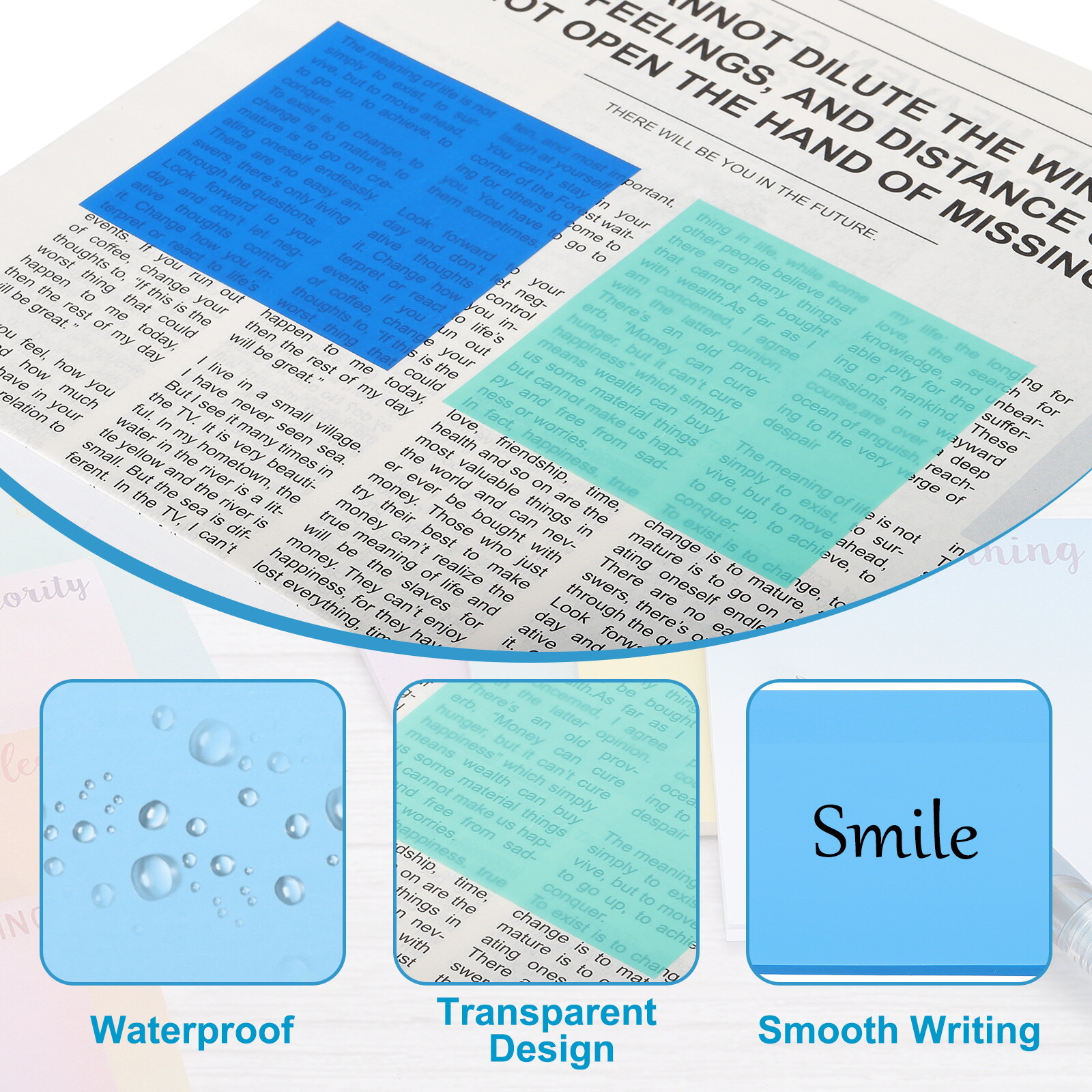 Document Transparent sticky notes can be used as message reminders, memos, to-do lists, record things, and organize notes, suitable for office and home. They can be pasted on laptops, books, office desks, notebooks, and most smooth surfaces..SpecificationMaterial: PETColor: Red/Orange/Yellow/Green/Light Blue/Dark BlueSize: 75 x 75 x 3 mm / 3" x 3" x 0.12" (L x W x T)Packing List: 12Pads Sticky Notes, 50 Sheets Each, 600 Sheets in TotalAdvantage1. Made of translucent PET material, the sticky note is waterproof and has a high level of transparency, and we can see what's underneath the sticker. The strong stickiness makes it not easy to fall off and not damage the surface or leave a sticky residue and can be reused.2. The self-stick note pads provide enough paper and enough space to write down important tasks, better organize your ideas, schedules, notes, etc., and provide a better daily planning experience.3. As an office supply, the memo reminder tabs in the office to remind work agendas and to-do items; as a study supply, take notes and mark on books to improve learning efficiency; as a planning supply, remind and record completion progress, it can stick on most smooth surfaces.InstructionRecommended to use pencils, ballpoint pens, markers, and oil-based pens to write on the transparent sticky notes for better results.NoteNot supported for gel ink pens, fountain pens, or other water-based pens to write on the self-adhesive sticky notes 3"x3" 600 Sheets Transparent Sticky Notes, Self Stick Memo Notes, 6 Colors Transparent sticky notes can be used as message reminders, memos, to-do lists, record things, and organize notes, suitable for office and home. They can be pasted on laptops, books, office desks, notebooks, and most smooth surfaces.. Specification Material: PET Color: Red/Orange/Yellow/Green/Light Blue/Dark Blue Size: 75 x 75 x 3 mm / 3" x 3" x 0.12" (L x W x T) Packing List: 12Pads Sticky Notes, 50 Sheets Each, 600 Sheets in Total Advantage 1. Made of translucent PET material, the sticky note is waterproof and has a high level of transparency, and we can see what's underneath the sticker. The strong stickiness makes it not easy to fall off and not damage the surface or leave a sticky residue and can be reused. 2. The self-stick note pads provide enough paper and enough space to write down important tasks, better organize your ideas, schedules, notes, etc., and provide a better daily planning experience. 3. As an office supply, the memo reminder tabs in the office to remind work agendas and to-do items; as a study supply, take notes and mark on books to improve learning efficiency; as a planning supply, remind and record completion progress, it can stick on most smooth surfaces. Instruction Recommended to use pencils, ballpoint pens, markers, and oil-based pens to write on the transparent sticky notes for better results. Note Not supported for gel ink pens, fountain pens, or other water-based pens to write on the self-adhesive sticky notes Hot Item Payment 1.We accept eBay payment . 2.Payment must be received within 7 business days of auction closing. Shipping 1.We ship to your eBay or Paypal address. Please make sure your eBay and Paypal address is correct before you pay. 2.Items will be shipped within 1-3 business day when we received payment. 3.Delivery time depends on destination and other factors. Description Policy 3"x3" 600 Sheets Transparent Sticky Notes, Self Stick Memo Notes, 6 Colors Transparent sticky notes can be used as message reminders, memos, to-do lists, record things, and organize notes, suitable for office and home. They can be pasted on laptops, books, office desks, notebooks, and most smooth surfaces.. Specification Material: PET Color: Red/Orange/Yellow/Green/Light Blue/Dark Blue Size: 75 x 75 x 3 mm / 3" x 3" x 0.12" (L x W x T) Packing List: 12Pads Sticky Notes, 50 Sheets Each, 600 Sheets in Total Advantage 1. Made of translucent PET material, the sticky note is waterproof and has a high level of transparency, and we can see what's underneath the sticker. The strong stickiness makes it not easy to fall off and not damage the surface or leave a sticky residue and can be reused. 2. The self-stick note pads provide enough paper and enough space to write down important tasks, better organize your ideas, schedules, notes, etc., and provide a better daily planning experience. 3. As an office supply, the memo reminder tabs in the office to remind work agendas and to-do items; as a study supply, take notes and mark on books to improve learning efficiency; as a planning supply, remind and record completion progress, it can stick on most smooth surfaces. Instruction Recommended to use pencils, ballpoint pens, markers, and oil-based pens to write on the transparent sticky notes for better results. Note Not supported for gel ink pens, fountain pens, or other water-based pens to write on the self-adhesive sticky notes Hot Item Payment 1.We accept eBay payment . 2.Payment must be received within 7 business days of auction closing. Shipping 1.We ship to your eBay or Paypal address. Please make sure your eBay and Paypal address is correct before you pay. 2.Items will be shipped within 1-3 business day when we received payment. 3.Delivery time depends on destination and other factors.
