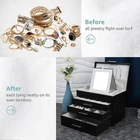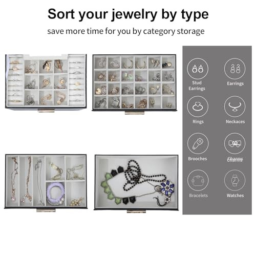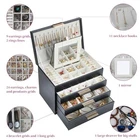 Return Policy Fast Delivery Trusted seller 4 Layer Jewelry Box for Women, Jewelry Organizer Box with Necklace Hooks, 3 Drawers Jewelry Box for Sunglasses, Necklace and Bracelet Storage (Black, 4 Layer) Product Description 4 Layer Large Jewelry Box : The first layer of the box has 2 ring lines, 1 mirror , 11 necklace hooks and 9 earrings grids. The mirror is perfect for your daily makeup. Earrings Holder Organizer Box: The first drawer has 24 earrings slots for earrings and Christmas charms organizing. The Second drawer had 3 long grids for your watches, link-chains and necklace organizing, while 4 bracelets grids for your bangles, cuffs and bracelet storage. Sunglasses and Big Stuff Organizer: The Bottom Large Drawer is perfect for your accessories such as sunglasses, lipsticks and watches storage. Space and Time Saving for Makeup Table: With our 4 layer jewelry box, all your jewelry will be in good order and easy to reach. From then on, you have a bright dresser that saves space and makes your room look neater and more elegant. In addition, our jewelry travel boxes are designed to categorize your jewelry at a glance, shorten search time. Ideal Jewelry Gift Box : This PU leather jewelry box looks elegant and thoughtful. It is a perfect gifts for yourself, your friends, your wife or your mother for birthdays, Christmas, Valentine's Day, Mother's Day and anniversaries. This jewelry holder can be used not only as a girl's jewelry box, ring storage box, necklace storage box, earrings storage box, but also as a gift box for bracelets. Shipping Returns Payment Shipping Shipping is FREE to all addresses other than APO/PO boxes in the lower 48 states. All our stock ships from US-based warehouses. Shipped via USPS or UPS (depending on location and package weight) Unless stated otherwise, all orders will ship within 24-72 hours of your payment being processed. Check our feedback to see the great reviews of FAST shipping we offer. Returns Seller does not accept returns Payment We currently accept payment via eBay managed payments only. Once payment is cleared, we will dispatch your shipment within 1-3 business days. Please refer to the "Shipping" tab for more information regarding shipping speed to your destination.