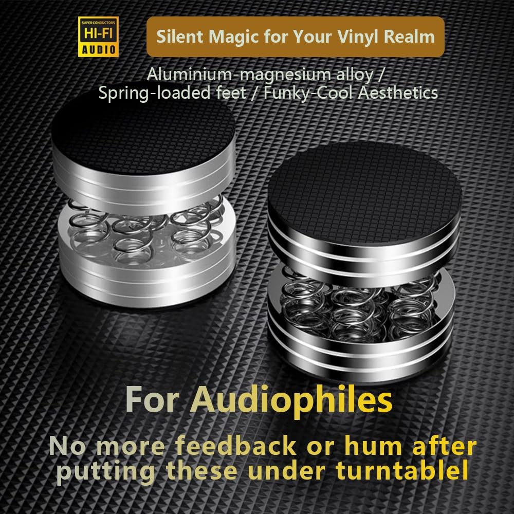 HiFi speaker stand feet Materials: ① Aluminum alloy: with high hardness and density has low harmonic vibration point and high damping; ② Antiskid rubber: absorbing vibration and achieve higher quanlity of listening pleasure, improve sound clarity, stereo imaging and bass response Design: CNC Machined and spring isolation stand feet is easier to install, no need to make holes and no need to use double-sided adhesive to avoid damaging your equipment. Espeically it's convenient for you to adjust load bearing by moving or adding springs which can make sound feeling different Function: Using isolation stand feet is to suspend acoustic feedback from your speakers or sub-woofer isolation for vibration. The tones will be more focused, lighter and with less noise. It can also avoid much of the vibration that may disturb downstairs. Advantages: it has high attenuation characteristics which can keep low quantity sense and raise high frequency line feeling and simple sense. Applicable objects: speakers, amplifiers, instrument, turntable, CD/DVD players, recorders, DAC and other equipments Effective solutions for audio components: Rubber materials dampen, and springs isolate. They work by isolating the audio components from vibrations coming through the floor and the shelf on which they rest. Each footer contains 7 springs (about 8 - 10 lbs per spring), allowing you to tune them based on the weight of the component you are isolating. The effect of isolation is amazing. It increases the detail and resolution in the music.