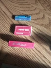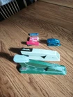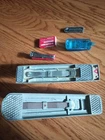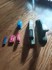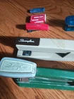This vintage stapler lot includes four pieces, two of which are Swingline brand and one is a mini Bostitch. The lot also includes staples and a small Wright Filippis stapler. These staplers are perfect for adding a touch of retro charm to your office or home workspace. Old green one has rust on it not sure if it works don't have any staples for it. These are in rough shape.