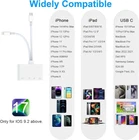 📷【Type-C/iPhone SD Card Reader】Equipped with dual USB C and lightning ports, the card reader for iphone is compatible with devices with Type-C and iPhone ports, which doubles the compatibility of ordinary card readers, making it a great companion for all photography enthusiasts. 📷【3-in-1 USB Type-C Port】The USB C port (with charging/headphone/data icon) of the memory card reader for iphone is multi-functional port, supporting three functions of fast charging/audio output/high-speed data transfer, you can use it to charge your mobile phone or listen to music, or even for data transfer, full of to meet your multiple needs. 📷【High-Speed bi-directional Data Transfer】The sd card reader iphone has a built-in USB3.0 and MFI certified chip that supports USB3.0 high-speed data transfer, transferring 300 photos in just a few seconds. The sd card reader for ipad also supports bi-directional data transfer before SD/MicroSD/U disk and mobile phone, sharing happy moments anytime, anywhere. 📷【Plug-and-Play & Simultaneous Reading and Writing】The sd card reader for iphone usb c does not require installation of third-party software, no wifi, plug and play, and can be easily used by the elderly in time. The iphone card reader also supports reading and writing two USB flash drives and one memory card at the same time, which saves data transfer time. 📷【Universal Compatibility】This iphone sd card reader adapter features devices such as smartphones and pad with USB-C and iPhone ports. lightning sd card reader is suitable for iPhone 14/13/12/11/8/7/6/Plus/Pro/Pro Max/XR/X/XS, iPad/mini/Air. USB C to sd card reader is suitable for iPhone 15 series, Samsung Galaxy S10 S9 Note 9 8, LG G5 G6 V20 etc. 📷【After-Sales Guarantee】The iPad sd card reader is compact, portable and durable, the cable leaves more space for other ports .We also provide professional technical support to keeping your SD Card Reader for iPhone always performing at its peak