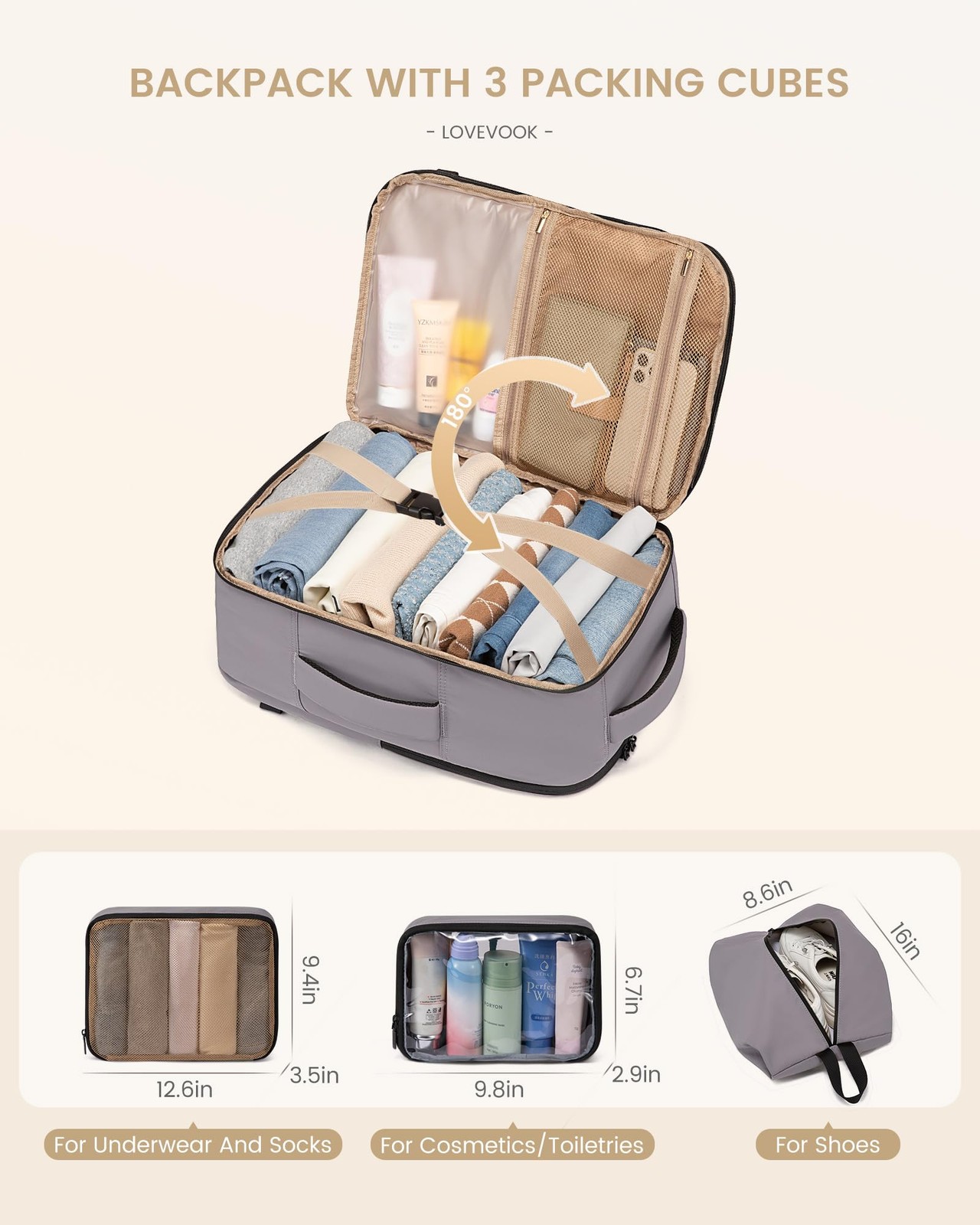 Travel Backpack for Women & Men The Travel Backpack combines sleek urban style with smart functionality, perfect for business trips, weekend getaways, and daily commutes. Specifications Dimensions: M-18": 14"L × 8"W × 18"H L-19": 14"L × 9"W × 19"H XL-20.5": 14.5"L × 10"W × 20.5"H Material: polyester Color Options: Black, Beige, Grey, Green, Pink Key Features ✔ Airline Approved - 18×14×8" size (M) fits Spirit/Frontier requirements as under-seat or overhead bin carry-on ✔ Full 180° Access - Opens completely like a suitcase for effortless packing and TSA security checks ✔ 40L Capacity - Holds 3-7 days' essentials with dedicated 17.3" padded laptop compartment ✔ All-Day Comfort - Breathable mesh back panel + adjustable waist belt distribute weight evenly (Note: Waist belt included with XL-20.5" size only) ✔ Smart Organization - Includes 3 packing cubes (toiletry/mesh/shoe) + 13 pockets with wet/dry separation ✔ Urban-Ready Design - Trolley sleeve + side water bottle pocket + anti-theft back pocket Maintenance Clean with damp cloth; store in dry place. Avoid prolonged sun exposure to preserve color. Ideal for business travelers, digital nomads, and weekend adventurers seeking a blend of style and functionality. 【Airline Approved Personal Item】Measuring 18x14x8 inches, meets size requirements for Spirit, Frontier & more. This carry on backpack fits under seats or in overhead bins—no checked baggage fees 【180° Suitcase-Style Opening】The travel backpack offers a 180-degree opening main compartment for easy packing and quick access to your items, ideal for speedy security checks and on-the-go organization 【40L Capacity & 3 Compartments】40L spacious carry on bag holds 3-5 days' essentials with 3 compartments, including a padded 17.3" laptop compartment. Perfect for weekends, business trips, or daily use 【Comfort & Durability】Travel bag is made with water-resistant materials and padded shoulder straps for all-day comfort. Reinforced stitching and smooth zippers deliver reliable performance trip after trip 【3 Packing Cubes & 13 Pockets】Weekender bag with 3 cubes (toiletry/mesh/shoe) and 13 pockets including a wet pocket - Keeps travel essentials like clothes, shoes, and toiletries organized and accessible 【Urban Travel & Commuter Ready】Features handles on the top and one side, a luggage strap, and side water bottle pocket. This sleek, minimalist backpack transitions easily from business commutes to city exploration