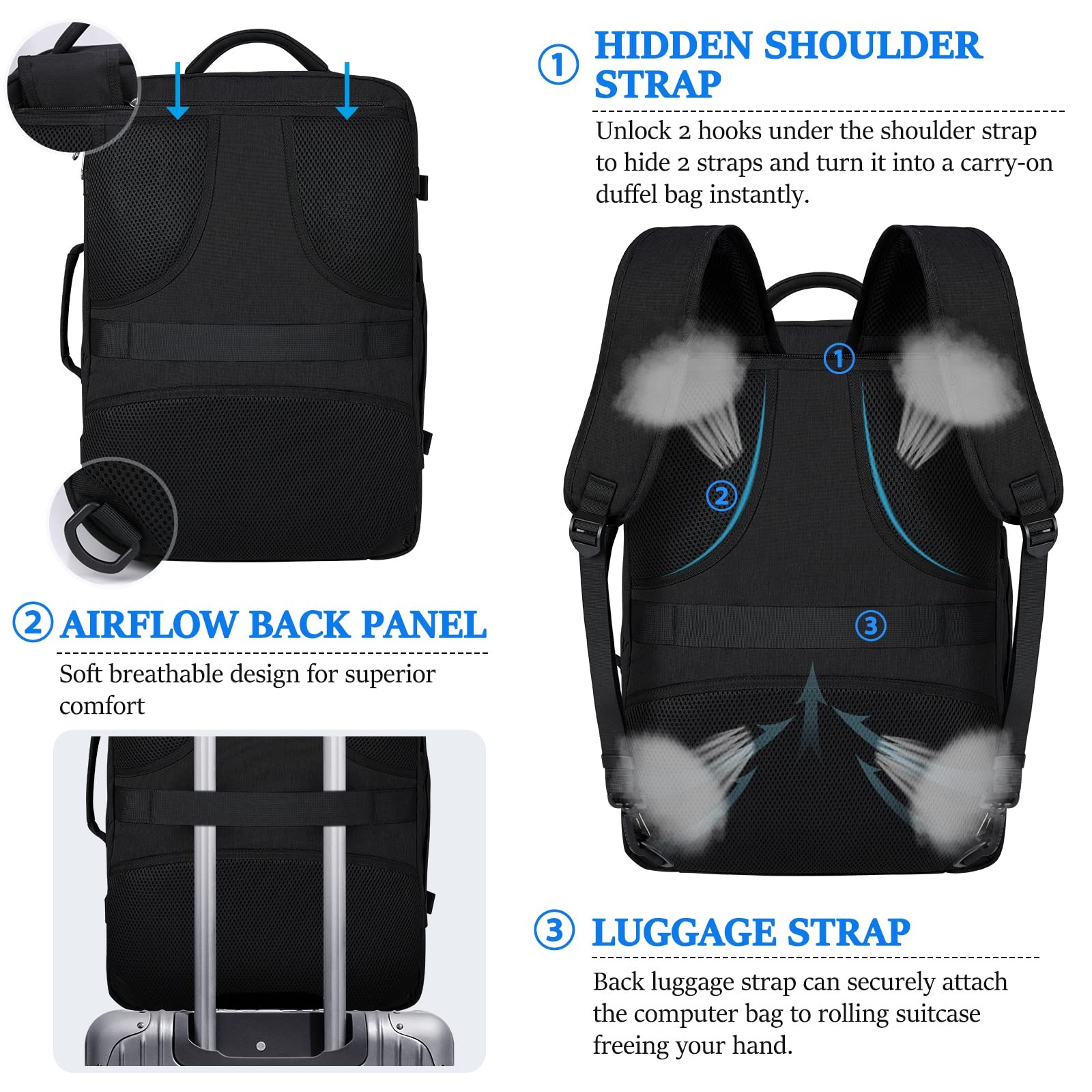 Specification: Material: Water-resistant polyester fabric Color: Black/Grey Backpack Size: 13.7*8.66*20 inch (L x W x H) Shoe Bag Size: 18.1*12.5(L x W) Capacity: 40L Weight:2.64lbs Fit Laptop Size: 14 inch, 15 inch, 15.6 inch, 17 inch, 17.3inch Gender: Men/Women Package: a travel backpack + a shoe bag Occasions: college, airplane travel, business, camping, hiking and daily use. For 40L travel backpack for men women: ROOMY SPACE: With 4 main compartment and 1 elastic water bottle pocket, this large travel backpack can fit a weeks worth of clothes , shoes, books, toiletries, water bottle and your 17.3inch laptop etc., making your travel items well organized. SURPRISE DESIGNS: Compared with other backpacks, this carry on backpack equipped with a waterproof drawstring shoe bag where you can easily carry a change of shoes. In addition, a zipper pocket is also designed on the back of backpack to completely hide 2 shoulder straps. COMFORTABLE EXPERIENCE: Breathable & Soft well-padded back and wide comfortable mesh sponge shoulder straps for the air convection, ventilation, and heat elimination, effectively reduce the stress on your shoulder. IDEAL GIFT: The travel laptop backpack will be a good choice for families, lover, friends and yourself on Christmas, Valentine's Day, birthdays, anniversaries or other holidays. Perfect Size for Flight Approved: Travel backpack: 13.7*8.66*20 inch (L x W x H). Shoe Bag: 18.1*12.5(L x W). Capacity: 40L. The carry on backpack is great for air travel because it meets airline requirements for package size and nicely fits for overhead luggage compartment or under the airplane seat. Plus, you can board using this travel laptop backpack as a personal item and save on paying any additional baggage fees. Large Capacity Travel Backpack: Open freely up to 180 degree, one separate padded 17.3inch laptop compartment for tech products to pass TSA checkpoint quickly. One spacious main luggage compartment for 5 to 8 clothes, books and so many other items. One multifunctional storage pocket with 1 retractable keychain inside for paper, pens, passport, wallet etc. Feature high-density waterproof fabric, one front wet pocket for toiletries and wet items. One expanding side pocket for water bottle. Shoe Bag & Hidden Pocket: Travel backpack comes with a separate dirty-proof drawstring shoe bag so you can take a change of shoes with you when traveling. Waterproof shoe bag length is up to 18 inch, most sizes of shoes can be fitted in. This bag can also store other personal items like socks or charging lines. The back of backpack designed with a zipper pocket which can completely hidden 2 shoulder straps. Also, use it as an anti-theft pocket to protect your phone, wallet from thieves. Multiple Carrying Options: The handles are set on top and one side, which allows an easy switch between backpack and suitcase. Travel backpack with back U shaped three dimensional ventilation design, wide breathable shoulder strap with sponge pad help relieve the stress of your shoulder. Back luggage strap can securely attach the carry on backpack to rolling suitcase freeing your hand. Use it as travel backpack/17inch laptop backpack/college backpack/business suitcase/weekend backpack. Waterproof Fabric & Practical Design: Featuring waterproof & scratch-resistant polyester fabric, the backpack is durable and well stitched. Smooth SBS double zippers are easy to open. Sturdy top-handle and side handle make the backpack more convenient. 4 external compression straps are designed to secure backpack shape when traveling. And the front reflective strip design will ensure your safety in evening biking or walking. This item is not intended for use by 12 years old and under.