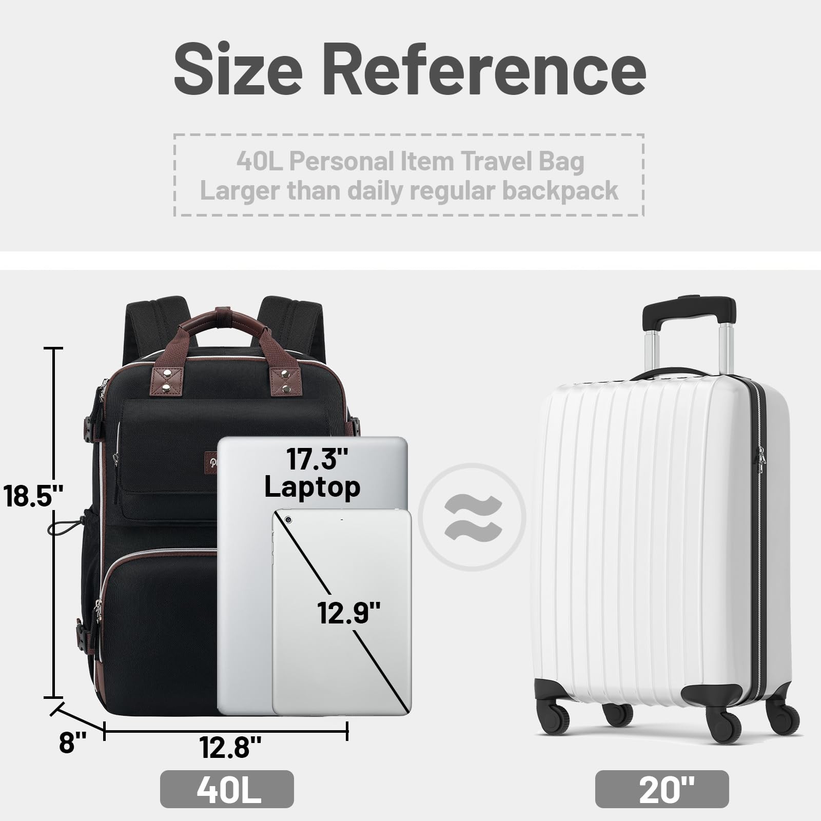 About Established in 2013, specializes in designing and manufacturing high-quality laptop backpacks and travel backpacks. Our mission is to create products that inspire people to explore, create, and live life to the fullest. We combine functionality, durability, and style to ensure every customer finds a travel laptop backpack they truly love to carry. Key Features of Our backpack purse for women Luggage Compatibility A built-in luggage strap on the back allows the carry on backpack to slide securely over your suitcase handle, making transportation effortless. No need to carry the backpack on your shoulders, reducing strain during travel. Thoughtful Design for Everyday Use External side pockets securely hold water bottles, compact umbrellas, or other small items. A USB charging port of this personal item bag offers convenient access to charge your devices on the go. Comfort and Durability Made from high-density, water-repellent polyester fabric, backpack for women are built to last and resist wear and tear. Multi-panel padding on the back, shoulder straps, and grab handle provides exceptional comfort, even when carrying heavy loads. The breathable mesh back panel enhances airflow, keeping you cool and comfortable. Spacious and Organized Storage Separate laptop compartment: Fits laptops up to 17.3 inches. Main compartment: Perfect for clothes, headphones, magazines, cameras, and notebooks. Front compartment: Ideal for small items like phones, keys, wallets, and glasses. Side pockets: hold water bottles or compact umbrellas. Perfect Gift for Everyone Our computer bag make unique and practical gifts for men, women, professionals, and travelers. Whether it’s for college, work, or daily use, nurse bag, teacher bag, our personal item travel bag are versatile and stylish. Why Choose ? Affordable Quality: We offer high-quality work backpack at reasonable prices. Durability: Designed to withstand daily use and travel demands. Functionality: Thoughtful features like USB charging ports, and luggage compatibility make our backpacks stand out. Versatility: Suitable for work, travel, or everyday adventures. Explore. Create. Live. Airline Approved & TSA Friendly: Measuring12.8" x 8" x 18.5" (length x width x height), size meets the carry-on requirements of Spirit, Frontier, JetBlue and else airlines.This carry on backpack is suitable for placement in overhead luggage racks or under seats. With luggage strap on the back allows it to securely attach to your luggage/suitcase for easy carry-on. The 180-degree zipper closure of backpack for women ensures easily access during security checks, convenient for your journeys. Lifetime Warranty: Our designs and quality are popular no matter in online or in-stores, the physical bag is more amazing than photos.Our comany strives hard to ensure every carry on backpack we sold with well-edited collection of quality. If any quality defects occur to our backpack purse during normal using, please feel free to contact us with one photo of the defectives close-up, we ensure reply with solution within 24 hours( no matter working day or weekend/holiday time) Large Capacity & Organized:With a 40L capacity, perfect for 3-5 days of travel essentials. Personal item travel bag features 2 main large compartments and 9 allocated inner and side pockets to separate tech electronics accessories from daily necessities. The laptop compartment can hold up to a 17.3-inch laptop, the suitcase compartment is roomy enough for business travel essentials such as folders, magazines, tablets and clothes. Two side pockets are designed for water bottle and umbrella Laptop Protection & Charging Hole: Get rugged protection with built-in storage and padded velvet compartment of this work bag. Laptop compartment features triple-layer protection, including a waterproof layer, a shockproof PE foam layer and soft velvet inner layer, effectively absorb impacts and reduce damage caused by accidental bumps. With a built-in USB charging port on the outside, this computer bag offers a convenient way to charge your phone while walking or working. Lightweight, Comfy & Sturdy: Laptop travel backpack is made from lightweight sturdy fabric to prevent tearing. Shoulder straps are designed with padded, wider and thicker than everyday backpacks. They are adjustable to fully relieve shoulder stress. The mesh back panel provides comfort and air circulation, breathable mesh pads offer maximum back support. It remains comfortable to wear even when loaded with heavy gear. Additionally, leather-padded top handle for a long time carry on for travel