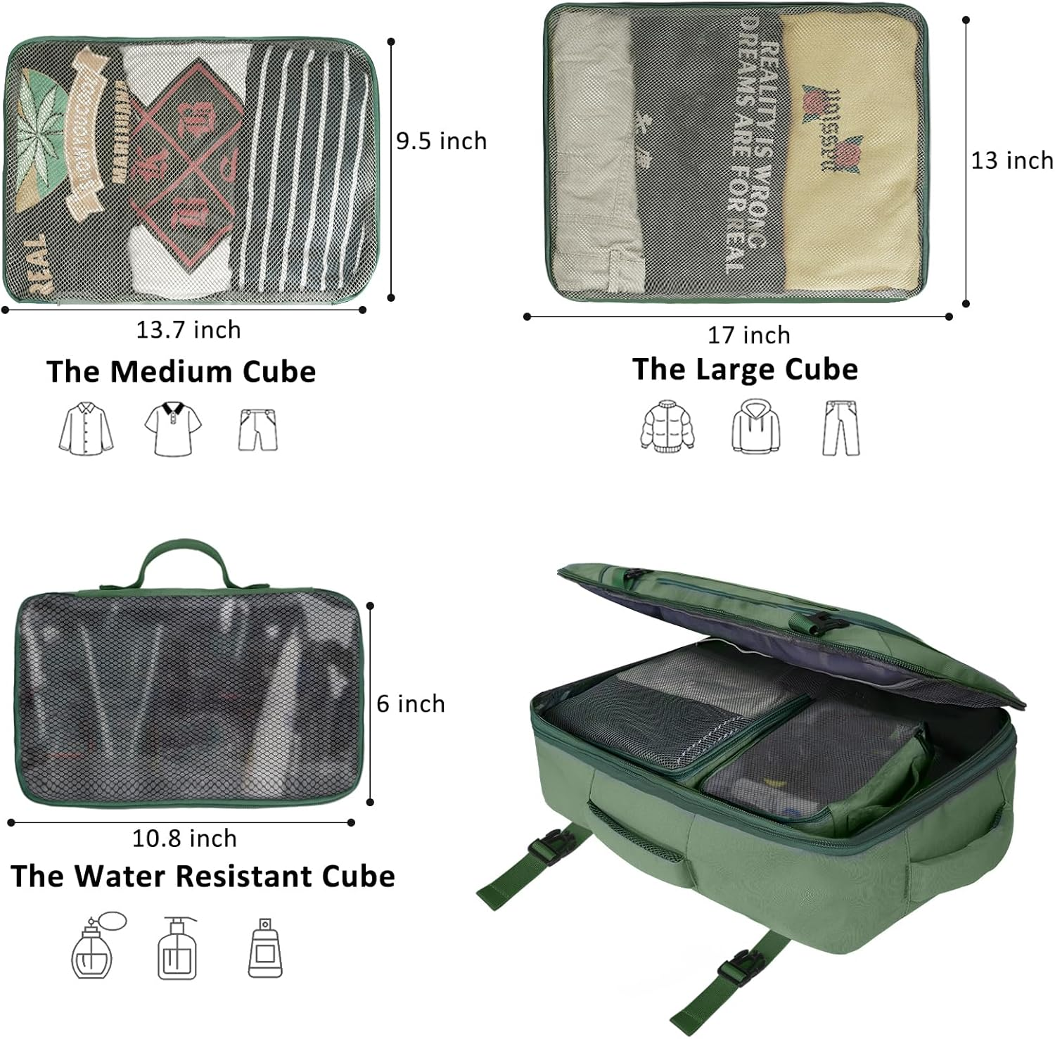 Menu Other Items Feedbacks About Us Contact Us Add To Favorites Carry on Bag, 40L Travel Bag Flight Approved Travel Backpack with 3 Packing Cubes Weekender Bags for Women Men Hiking Backpack Water Resistant Casual Daypack Traveling Essentials, Green ADDITIONAL 3 PCKING CUBES: Large cube for jackets, sweaters, trousers , Medium cube for shirts, shorts, blouses,Small water resistant cube with transparent side for providing clear overview of toiletries. Serve you well as professional carry on bag, weekender travel bag EXPANDABLE & LARGE CAPACITY: Dimensions: 18.9*12.9*6.23 inches. Lightweight: 2.33 lb (1.33 kg). With the expandable feature, expanded dimensions: 18.9*12.9*8.23 inches. This travel backpack offers you more packing capacity, up to 40 L. easily holding 3-7 days travel gear. The large carry on backpack for travel fits overhead and under the seat while staying within standard carry on size. Optimal for business or weekend travel and easily carried on most flights TSA FRIENDLY DESIGN: This travel backpack features a TSA-friendly design it can be unfolded 180° through the airport security check, convenient and quick. A luggage strap can be used to fix the daypack backpack on the suitcase and slide onto the luggage vertical handle tube for easy carrying COMFY & STURDY: Made of Water Resistant Polyester Fabric and anti-scratch material, ensure a secure & long-lasting usage. Equipped with adjustable shoulder straps, chest straps, air-mesh ventilated back panel and two foam padded handle, the Flight Approved Carryon Backpack gives you an unparalleled travel experience. It's the good gifts for Mother's Day,and also the good travel gifts for girlfriend,wife,friends EASY TO ORGANIZE: Main compartment with separate mesh pocket and roomy space to store different travel gears,internal compression elastic straps offer well protection for everything. Front compartment with various pockets for storing notebooks, pens, keys, earphones and other small items. An anti-theft back pocket is suitable for valuables. Well made for international airplane travel and work trip as a travel gifts for men and women Product Description Vancropak Large Travel Backpack with 3 Packing Cubes The best Christmas gifts for women, Christmas gifts for travelers women, Christmas travel gifts for couples, Christmas gifts for people that travel, travelers Christmas gifts Anti-Theft Pocket The Anti-Theft Pocket is used for storing valuables, wallets, cell phones, etc. The backpack's hidden anti-theft pockets provide extra security and safety for added peace of mind during travel or everyday use. Two comfortable handles There is a Handle On The Top And Right Side Of The Backpack, Which Gives You More Ways To Use It. It Is Made of Soft Filling Material And Reduces The Burden On Your Journey Adjustable Sternum Straps The Sternum Straps Could Be Adjusted Lengthwise, So That The Weekender Rucksack Fits Firmly On Your Body Without Shaking. Offering You a Better Wearing Experience 4 strong compression Straps The four compression straps on the sides of this travel backpack provide maximum compression and reduce stress on the zipper, while simultaneously making your bag smaller Roomy Space for Travel Optimal Gifts for Traveler The C-Shaped Double Zipper Design Allows This Green Hiking Backpack To Open Like A Suitcase, Allowing You To Conveniently Put In or Take Out Your Travel Goods During Use. In Addition, There Are Two Elastic Bands That Tightly Secure Your Items Without Producing Shaking Roomy Main Compartment The Capacity of the Main Compartment Can Store The Clothes You Need For 1~3 Days. The Zipper Mesh Bag on The Left Allows You To Find The Items Quickly And Conveniently. In Addition, We Also Provide Three Cube Storage Mesh Bags For You To Use. Separate Storage of Different Clothes Brings More Convenient Possibilities For Your Travel Vancropak Large Travel Backpack, 40L Flight Approved Carry on Backpacks with 3 Packing Cubes, Hiking Backpack Water Resistant Outdoor Sports Rucksack Casual Daypack Bag, Green Use in multiple scenarios Carry On Bag Travel Bag Flight Approved Backpack Duffel Backpack Weekender Backpack Casual Daypack Multiple Carrying Modes This Oversized Travel Rucksack Provides 3 Options For Use. It Can Be a Backpack or converted into a handbag or Carry-On duffle Bag with the top and side handles Slide Over the Luggage There is a luggage strap on the back of the Vancropak Casual Daypack, you can slide it over the handle of the suitcase for easy carrying Flight Approved Size The Vancropak Travel Backpack is Designed To Fit The Maximum Size Allowed on Common Flights, So It Can Be Placed In The Overhead Luggage Rack And Storage Space Under The Seats Item Specification Item model number 1215 Age Range Description Adult Capacity Total 40 Liters Number Of Items 1 Color Green Product Dimensions 6.23 x 12.9 x 18.9 inches Country of Origin China Item Weight 2.3 Pounds Department unisex-adult Units 1 Count Size X-Large SHIPPING FREE FAST SHIPPING FREE SHIPPING We are always working hard to ensure your package arrives as soon as possible. Please understand that some factors like weather, high postal traffic, and the performance of shipping companies are outside of our control. We offer free shipping to the lower 48 states. We do not accept P.O. Boxes. Please provide a physical address. If you have a problem or question regarding your transaction please contact us immediately. We will work with you to resolve any problem you may have. Thank you