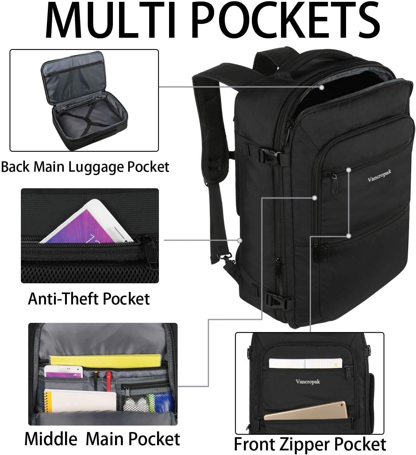 Vancropak Carry On Backpack, 40L Expandable Extra Large Travel Backpack, Flight Approved Water Resistant Luggage Suitcase Daypack, Lightweight Personal Business Weekender Bag for Men & Women, Black Expandable & Large Capacity: This large travel backpack with an expandable design gives you a greater capacity of up to 40 L. Unzipping to get larger storage space, increasing the width by up to 2 inches. You can easily fit 3-5 days travel gears. It is an good choice for weekend getaways and business trips. The TSA 180 degree zipper closure helps you go through the security check quickly Sturdy & Lightweight: Men's Travel Backpack is made of lightweight water-resistant polyester and anti-scratch material, which can provide protection on drizzle days. Zippers are easy to close and open. Regular size is 20*13*7 inches and weight is 2.09 lbs. This carry on backpack meets the personal carry-on item standards of airlines such as Southwest, Spirit, JetBlue, and Frontier Airlines, and can be fitted in the overhead compartment or under the seat Convenient Design: This carry on travel backpack is designed with hideaway padded shoulder straps which can be hidden away in the zippered back panel when not using. Two padded handles on the topmost and the side are designed to lift the backpack from multiple angles, provide you more flexible carrying experience such as carrying like a suitcase or a backpack. A luggage strap on the back is designed to fit on the luggage's handle, for easier carry on international travel Easy to Organize: The luggage backpack's main compartment with separate mesh pocket and roomy space to store different travel gears, internal compression elastic straps can well secure items. The front compartment with various pockets can be used to store notebooks, pens, earphones, and other small items, for quick pick out. An anti-theft back pocket is suitable for valuables. The travel backpack is large enough for vacation, weekend getaway, overnight trip Reduce Pressure Feature: The suitcase backpack equipped with adjustable chest straps, 4 exterior side compression buckles, air-mesh ventilated back panel, can effectively relieve the pressure on the shoulder and neck, also reduced stress on the zippers. Thickened sponge handles and shoulder straps provide you with more comfort when you are carrying and gripping the bag. Great valentine's gifts for couple, gifts for dad, gifts for husband