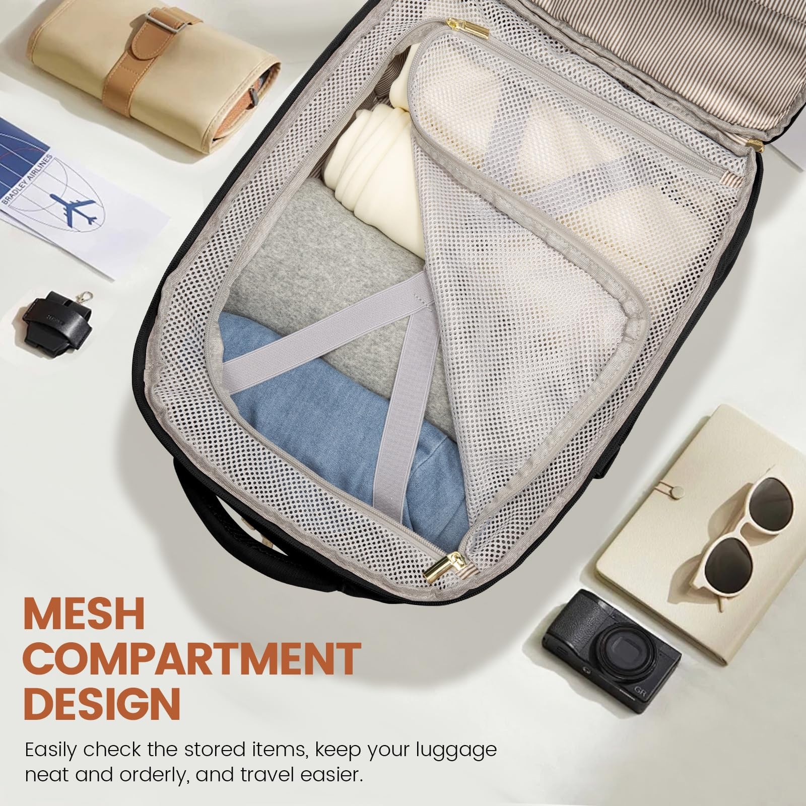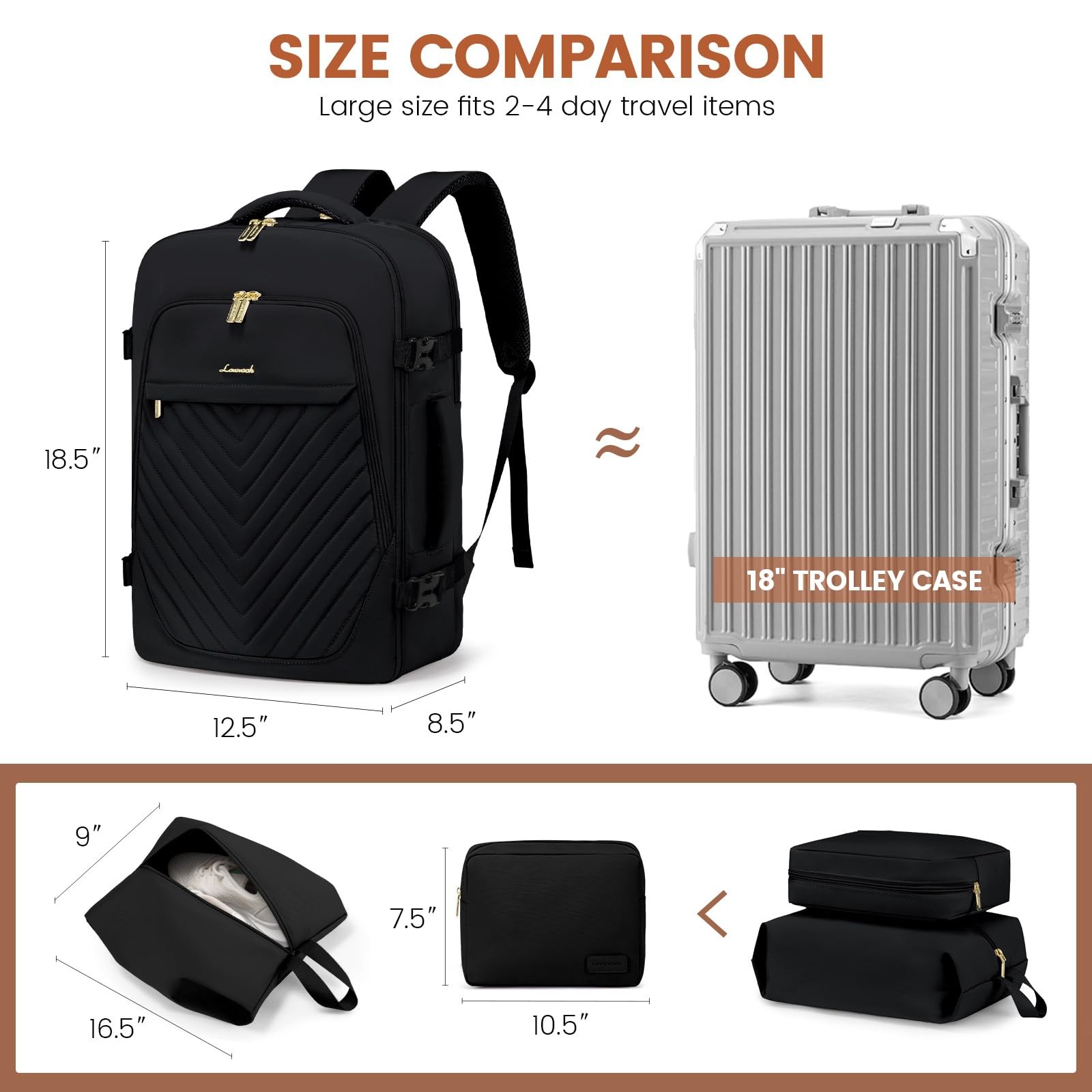 travel backpack, travel backpack for women, travel backpack, travel backpack carry on flight approved, small travel backpack, travel essentials, airplane travel essentials, personal item travel bag, carry on backpack, carry on bag, carry on bags for airplanes women 【Airline-Friendly Dimensions】: Thoughtfully crafted to fit within the overhead bins or under the seat space allowed by most airlines, this backpack eases your worries about carry-on restrictions, making your travel experience more relaxed and convenient 【Ample Storage Capacity】: The expandable design of the backpack allows for a flexible accommodation of your belongings, whether on a short trip or a long journey. With a 40L capacity, it easily stores clothing, electronic devices, and travel necessities, complemented with additional packing modules including storage bags for various items and a shoe bag 【Style and Practicality Combined】: This travel backpack boasts a classic and unique design, integrating the elegance of fine stitched patterns with chic gold zippers, presenting a sense of high-end fashion. Meanwhile, its four compartments and multifunctional pockets meet the need for quick categorization and access to your items during travel 【Comfortable Carrying System】: With a multi-panel ventilated back design and adjustable breathable shoulder straps, the backpack ensures comfort even during extended wear. The padded back panel and straps reduce the pressure on your back, making your journey more enjoyable 【Security and Durability】: Made with water-resistant and abrasion-resistant materials, this travel backpack guarantees the protection of your belongings in varying environments. An integrated anti-theft compartment and specifically placed side pockets offer secure storage options for your valuables and everyday items, providing a sense of security throughout your travels